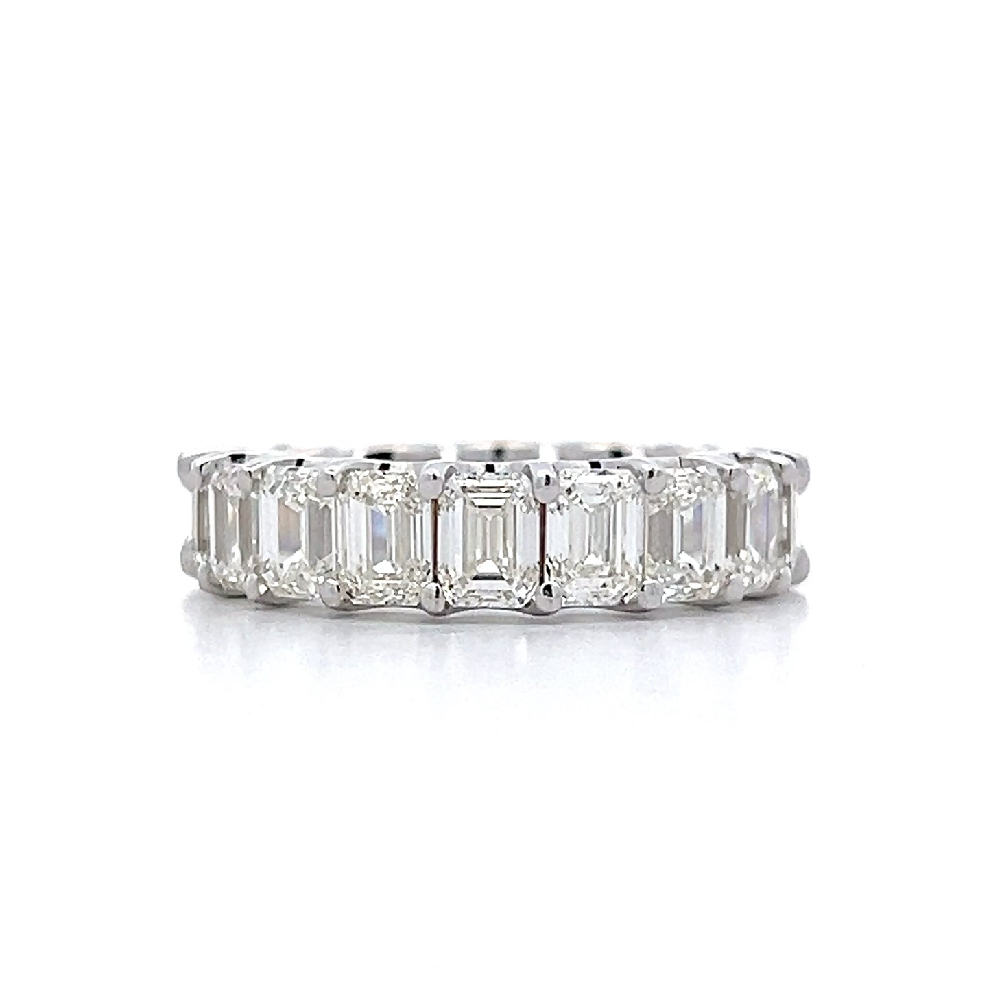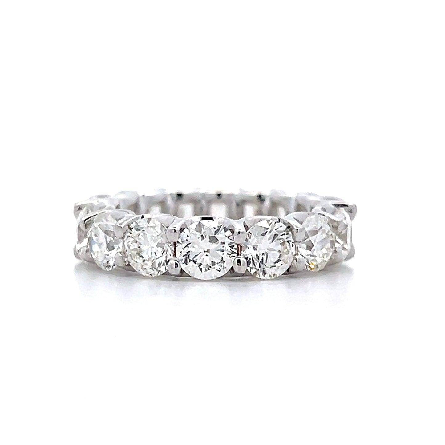 The diamonds have clarity ratings of VVS2 and SI2 with H and I color ratings, and all come with GIA certification. Set in a shared prong mounting that creates a continuous line of diamonds around the band, this ring has an impressive total weight of 6.40 carats.