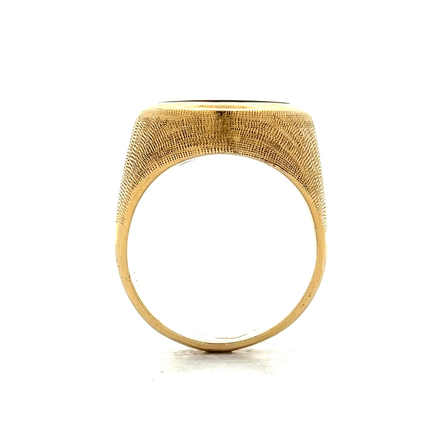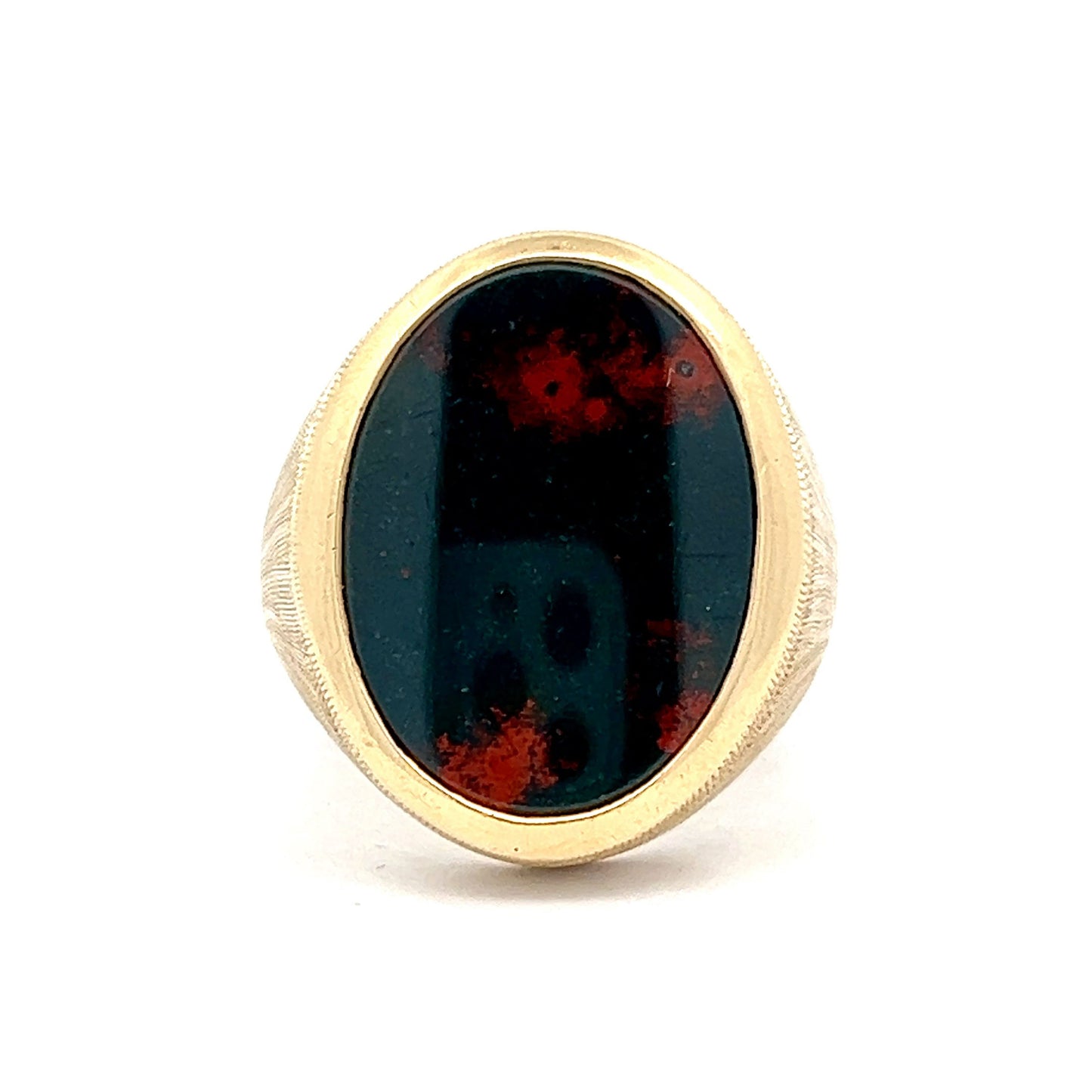 This Mid-Century men's cocktail ring showcases a striking 6.41-carat oval cabochon bloodstone set in rich 14 karat yellow gold. The deep, earthy tones of the bloodstone contrast beautifully with the warm gold, giving the ring a bold and refined look. The bezel setting and textured gold band add distinctive elements, enhancing its substantial feel. This vintage piece captures the unique charm of Mid-Century design, making it a standout addition to any collection. Whether worn for a special occasion or as a signature piece, this bloodstone ring offers a captivating blend of rugged elegance and vintage appeal.