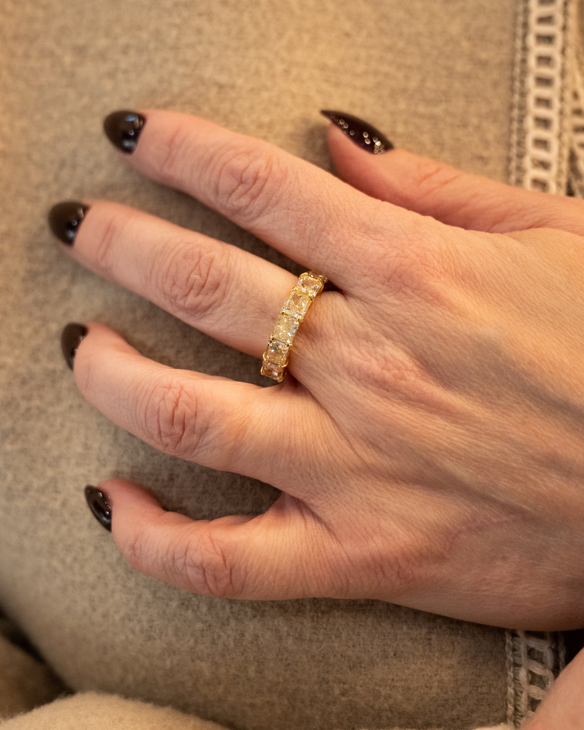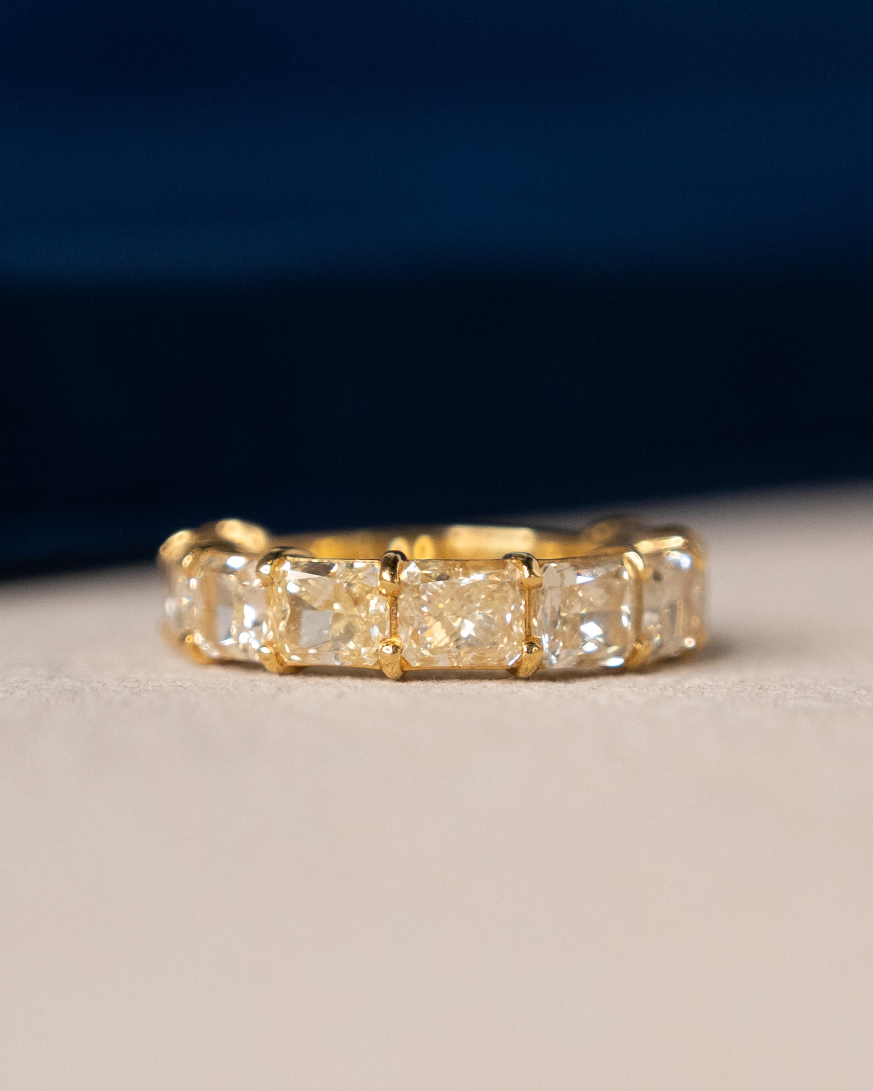 This 18 karat yellow gold stacking band features radiant cut diamonds totaling 6.72 carats set in a 3/4 eternity design. The diamonds have VS2 to SI1 clarity, meaning inclusions are minor and typically invisible to the naked eye, and S to T color, which shows a stylishly warm yellow tint that complements the yellow gold setting.