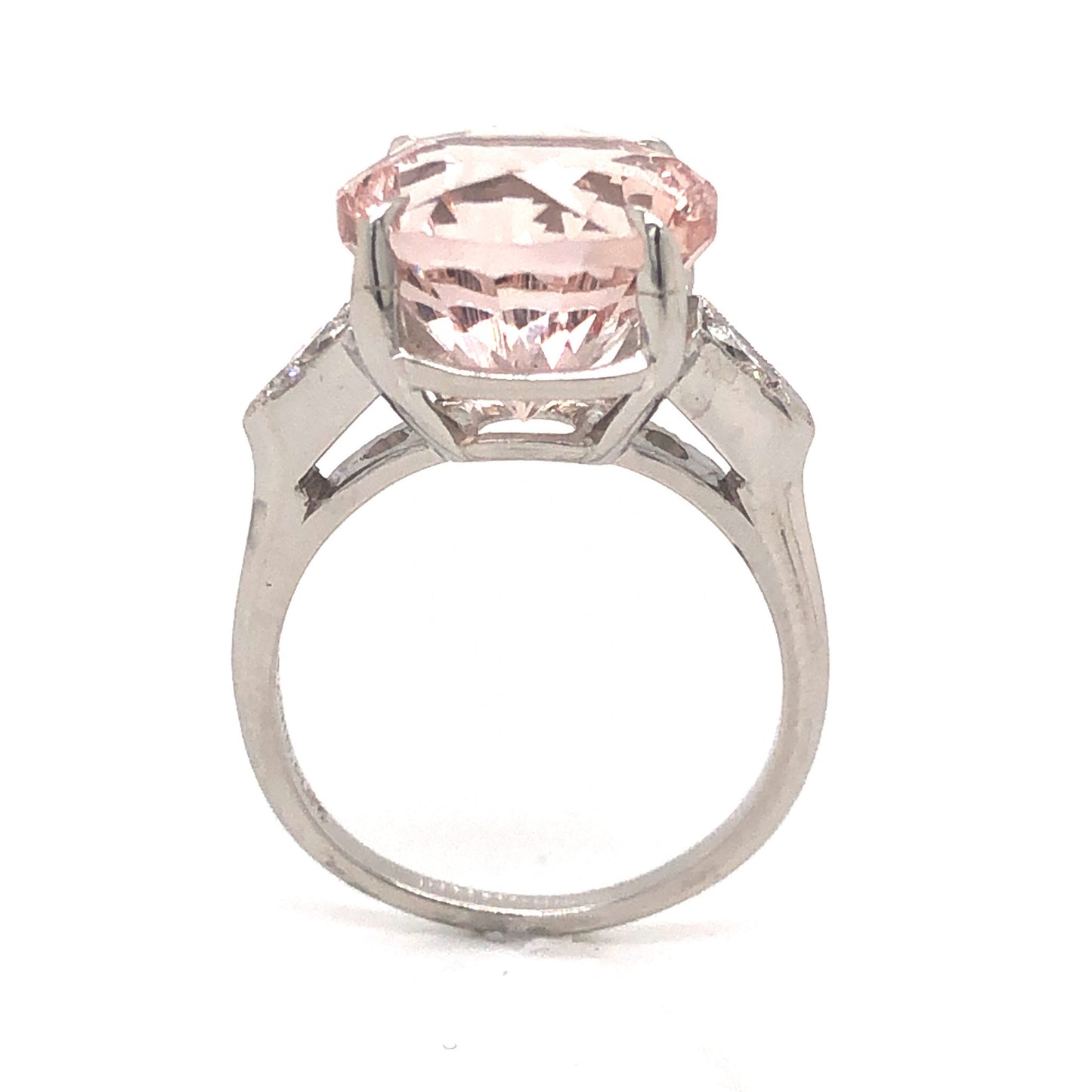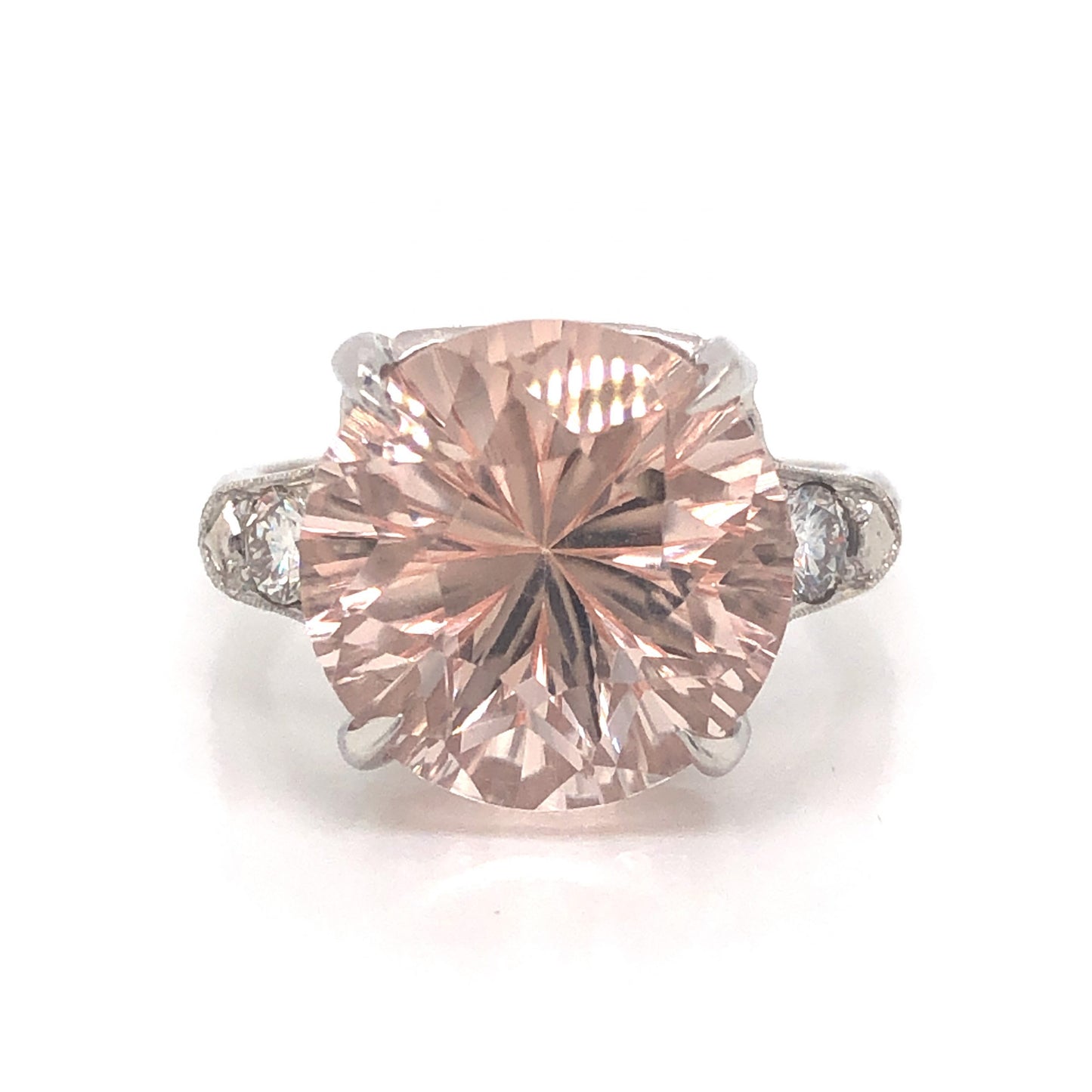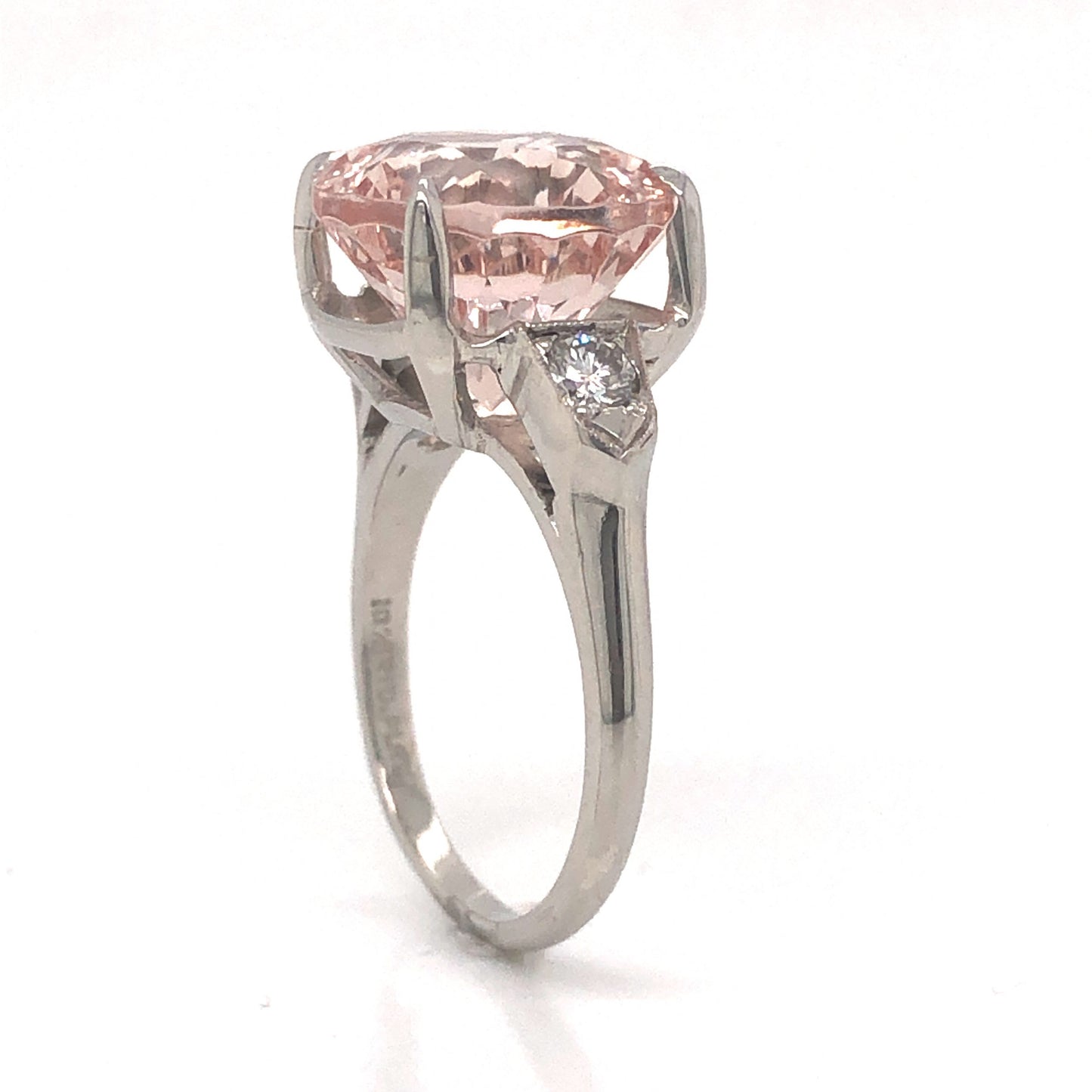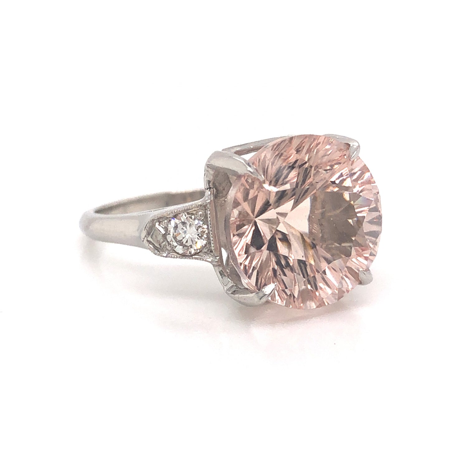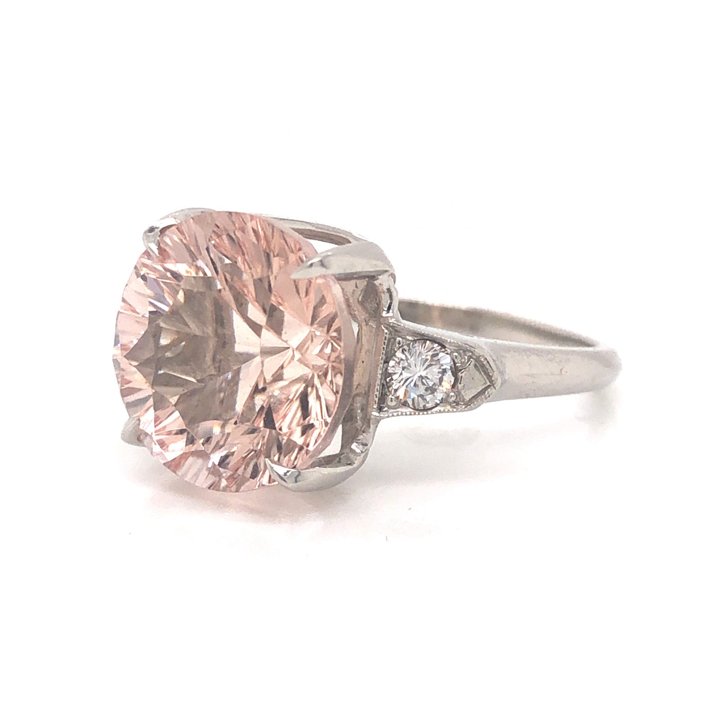 6.92 Mid-Century Morganite Engagement Ring in Platinum. This romantic Mid-Century engagement ring features a 6.92 carat round cut pink morganite in shimmering platinum. The morganite has a ballet slipper pink hue. Highly brilliant with beautiful star-shaped facets, the center stone is set in four prongs and accented by two (2) .11 carat Round Brilliant cut diamonds. This vintage engagement ring is timeless and will surely light up a smile in your loved one!