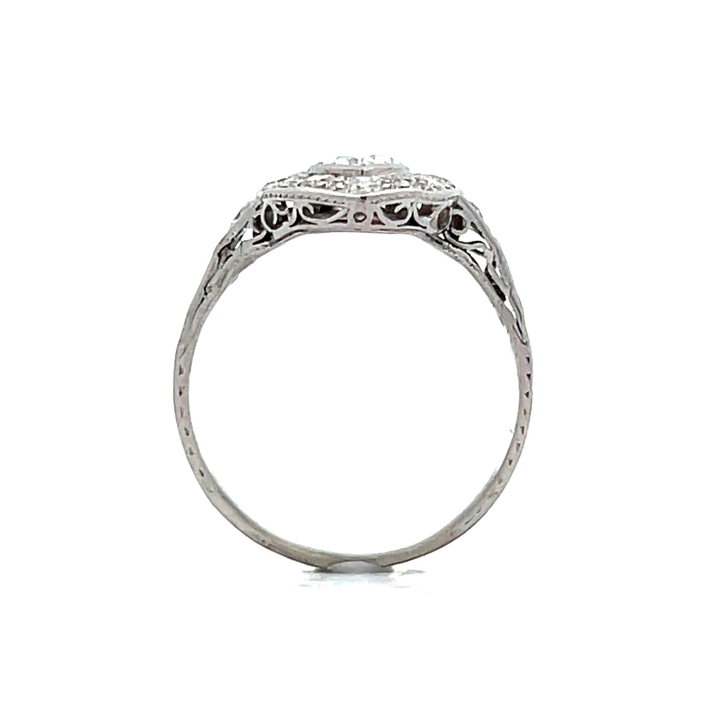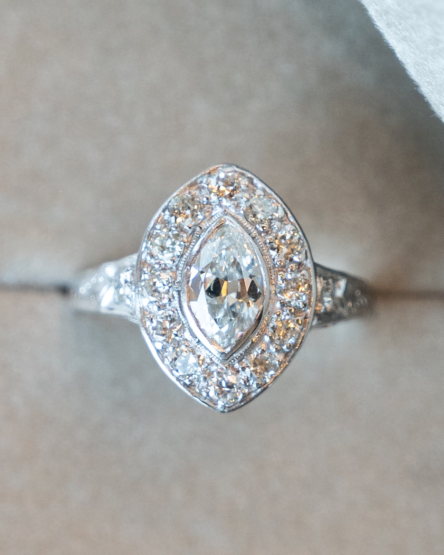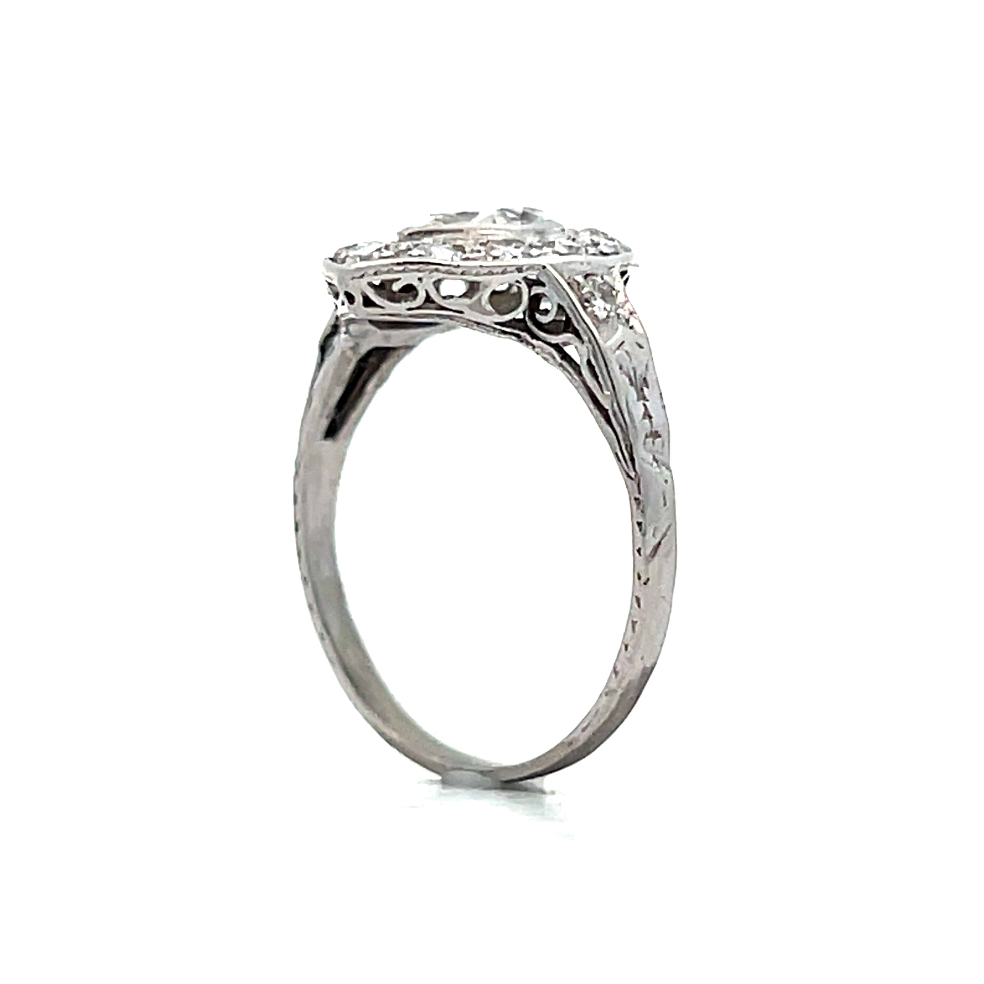 This Art Deco antique engagement ring features a .60 carat marquise-cut diamond with SI1 clarity and F color set in a bezel mounting made from platinum. Fourteen round brilliant cut diamonds, each measuring 2.0mm and weighing .03 carats, create a halo around the center stone in channel settings. The filigree decorative gallery showcases the intricate metalwork characteristic of the Art Deco period, bringing the total diamond weight to 1.02 carats.