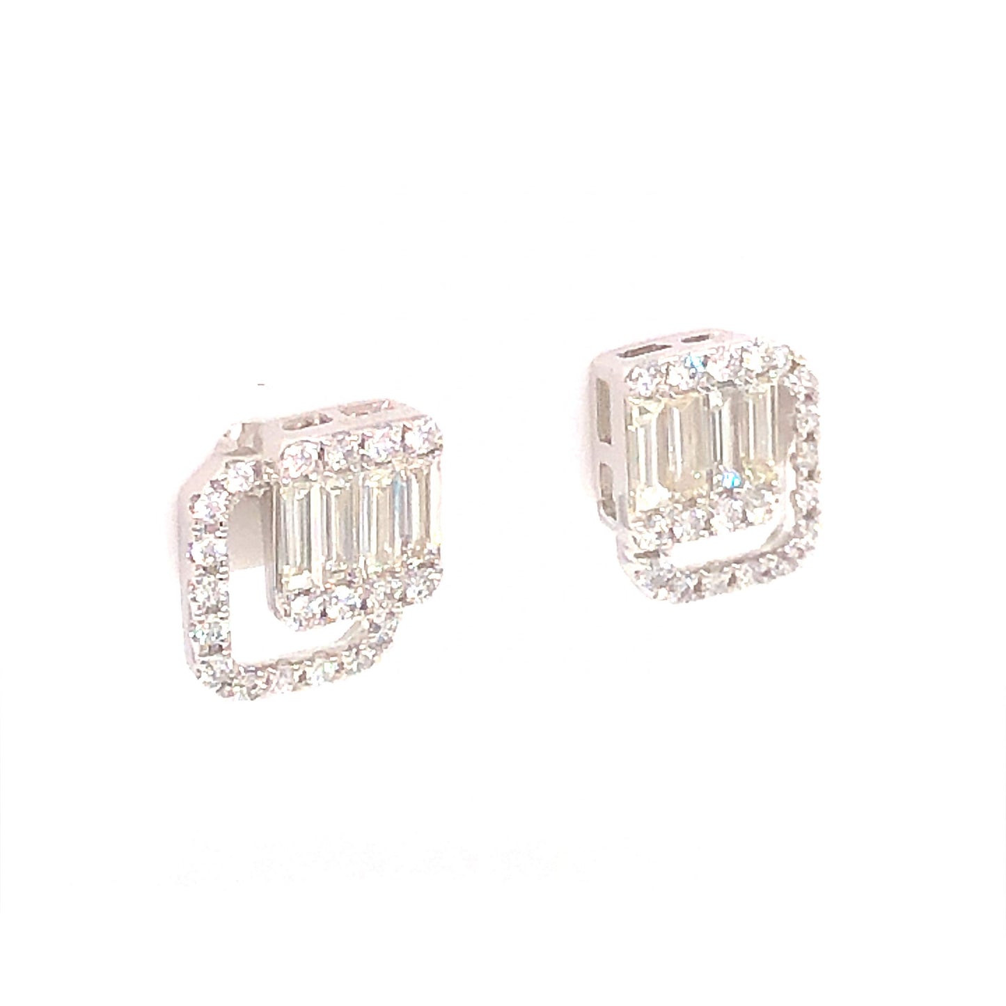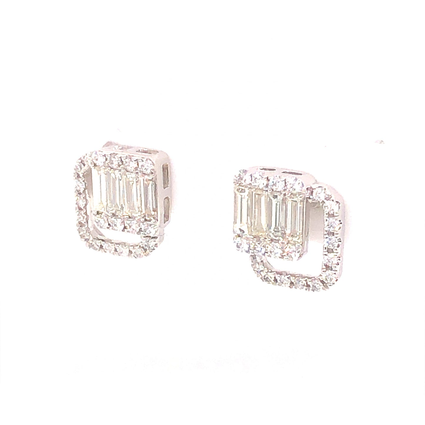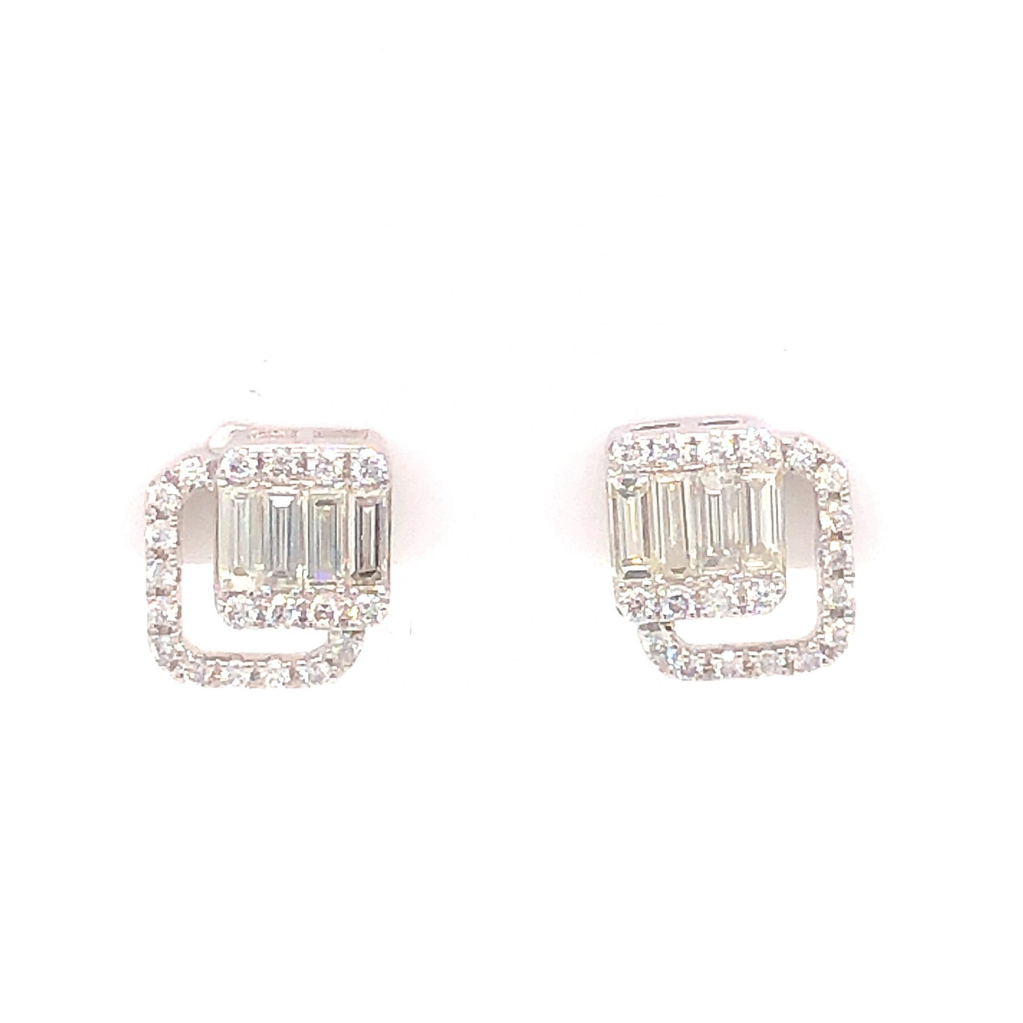 .60 Diamond Earring Studs in 18k White Gold. These beautifully crafted diamond studs earrings feature .60 carats of diamonds set in 18 karat white gold. Thirty-eight (38) .00579 carat diamonds and eight (8) .0475 carat baguette diamonds form a designer shape in white gold. All of the diamonds are highly brilliant and eye clean. These modern diamond studs would make a fabulous gift for any loved one!