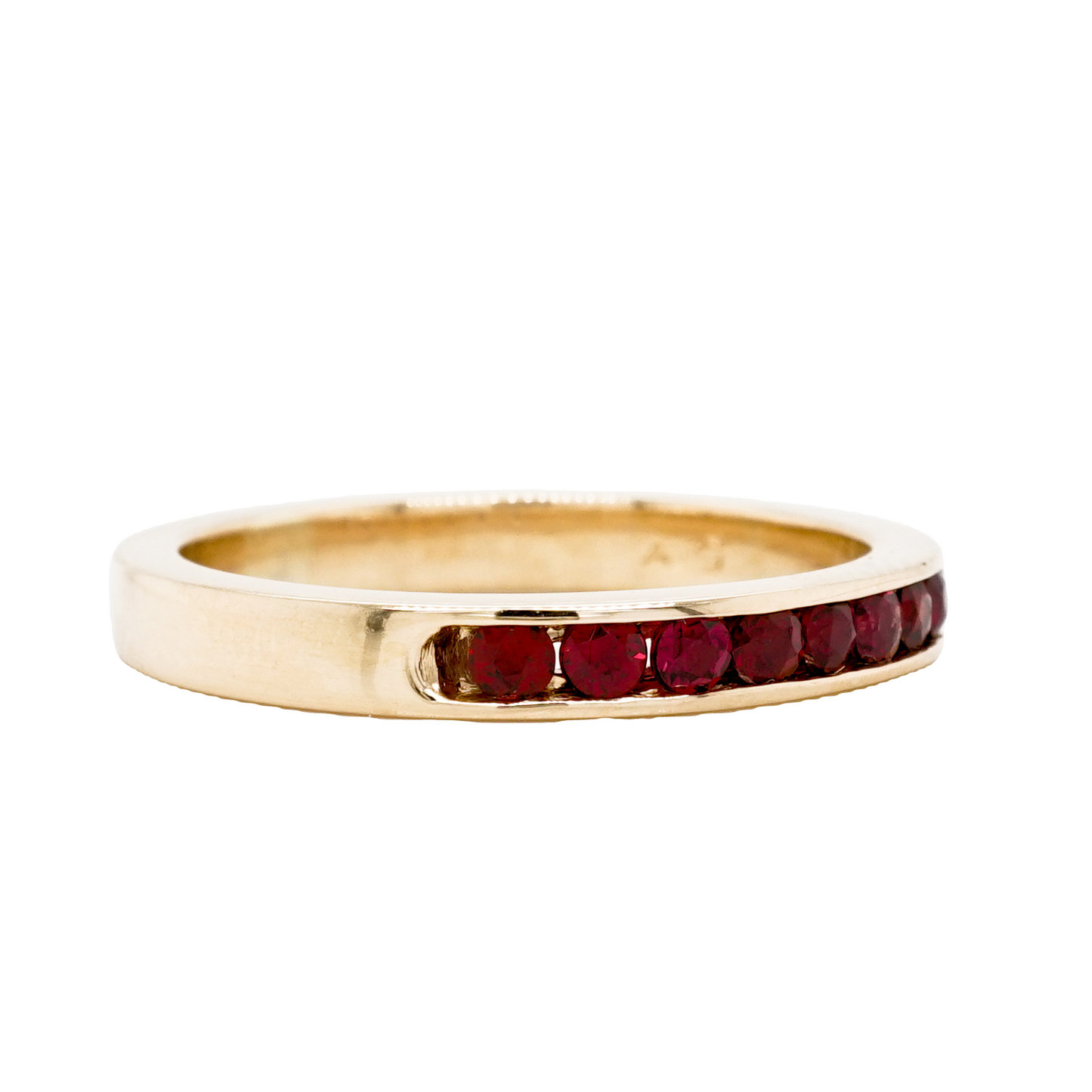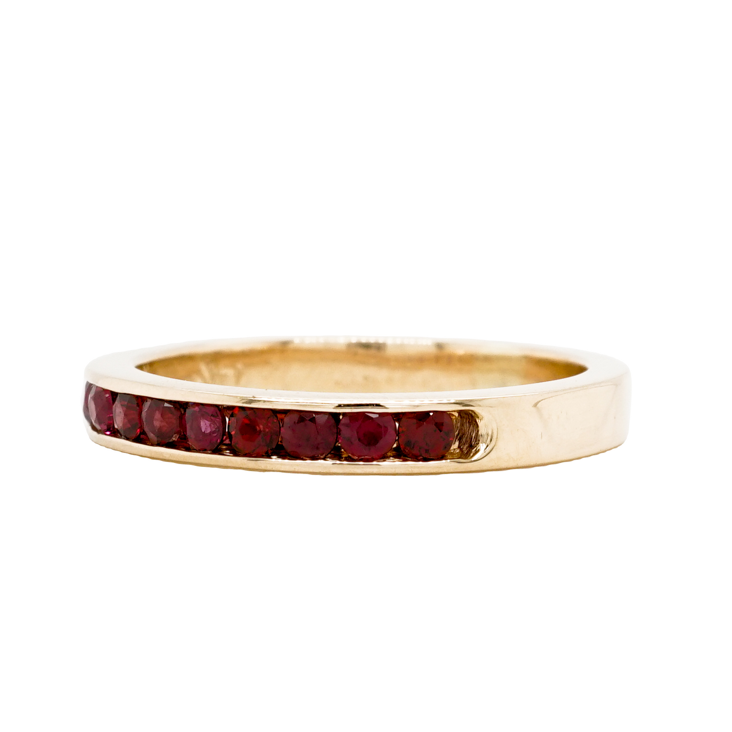 .60 Garnet Wedding Band in 14k Yellow Gold. This modern wedding band features .60 carats of red garnets in warm 14k yellow gold. Ten (10) .06ct garnets, each with a deeply saturated burgundy hue, are channel set on this innovative wedding ring. From the profile, the shank is flat and structured, measuring 2.92mm wide and finished in high polished 14k yellow gold.