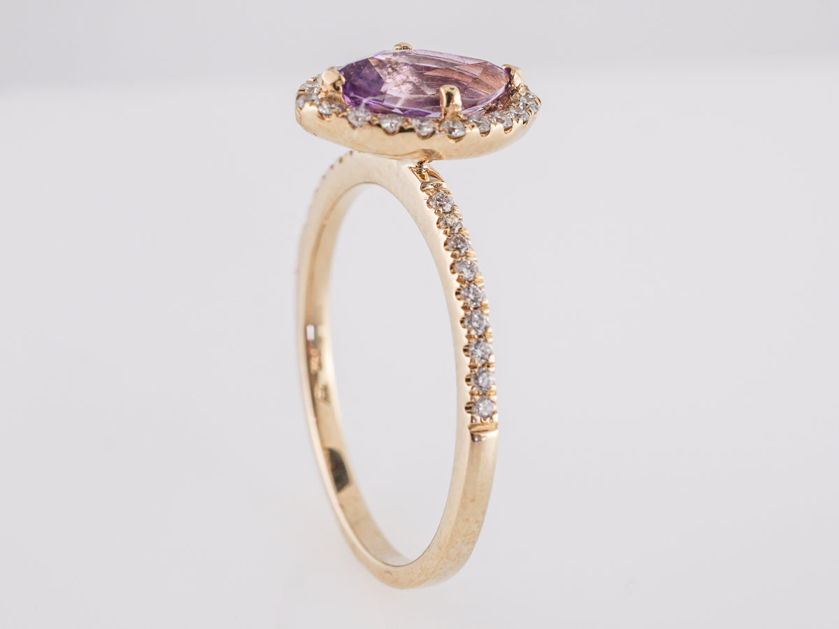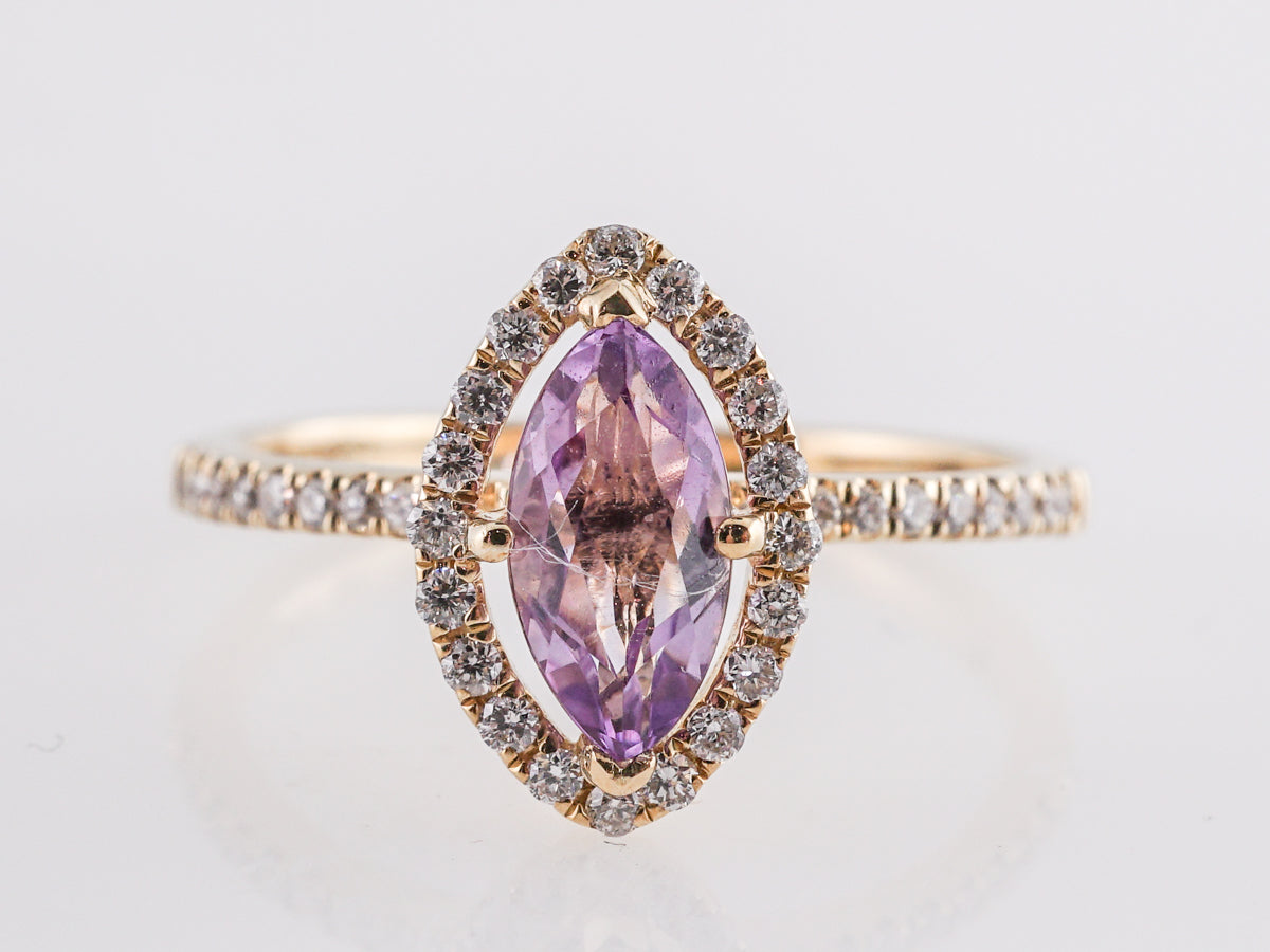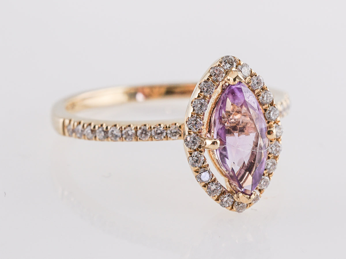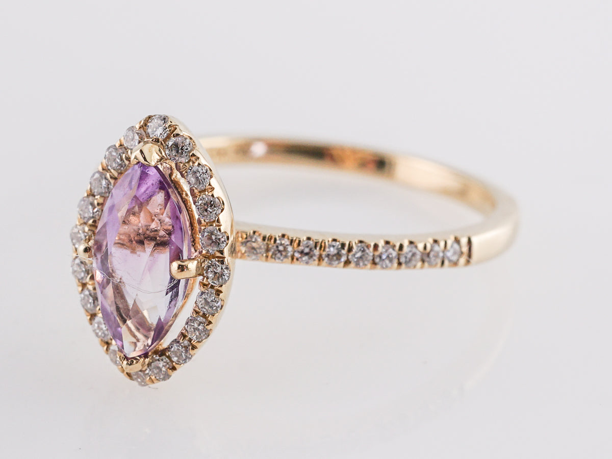 .60 Marquise Cut Amethyst Engagement Ring in 14k. This sultry marquise cut amethyst engagement ring features a .60 carat purple amethyst and accent diamonds in 14k yellow gold. The natural purple amethyst has a faint lilac hue with elongated facets. Set in four prongs, the primary amethyst is complimented by a halo of accent diamonds shaped perfectly in marquise form. The shoulders of the band feature a row of accent diamonds that reach halfway around the shank. The total diamond weight of this ring is .25 carats. This purple amethyst engagement ring is a true beauty.