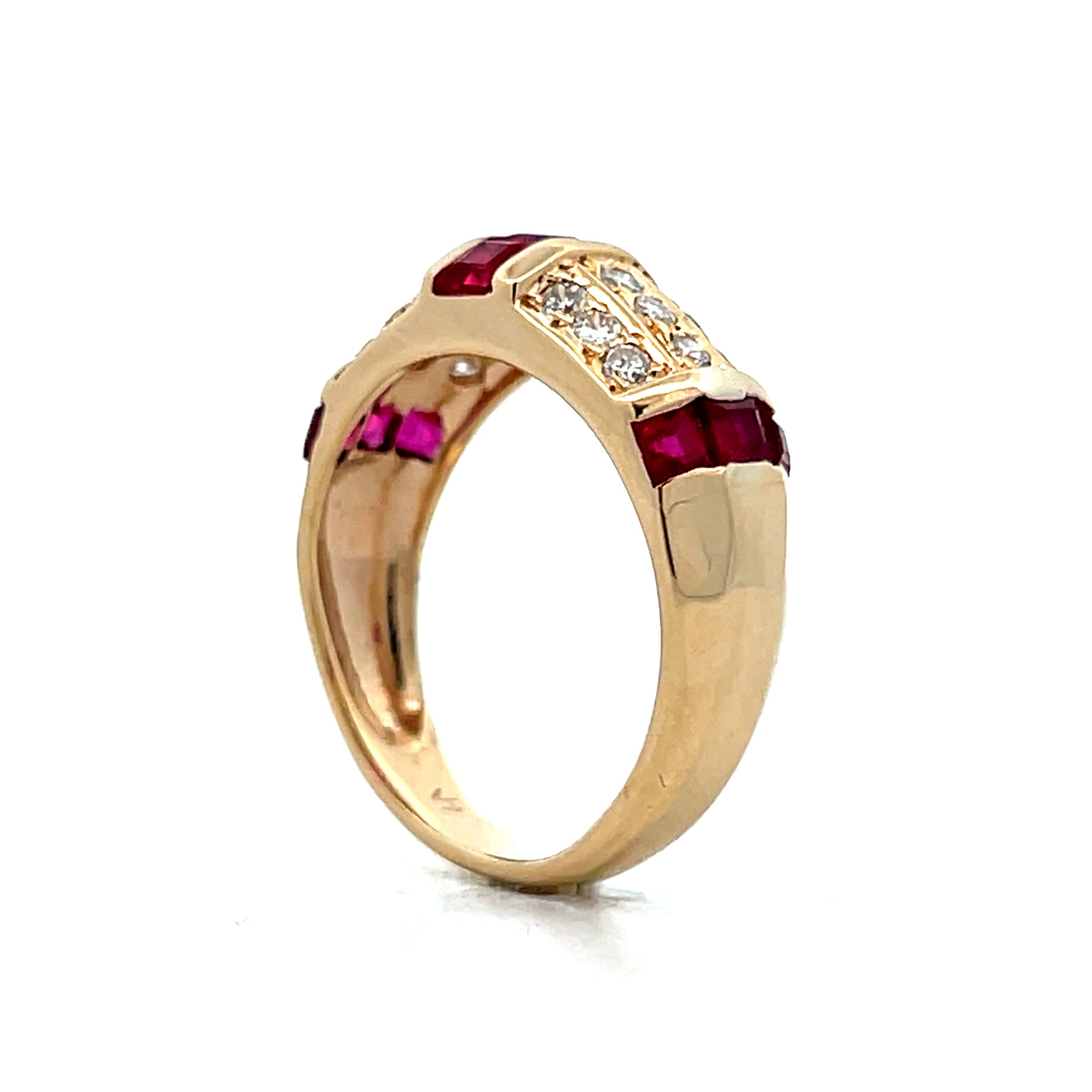 This cocktail ring features a .60-carat square step-cut rubies, accented by channel-set diamonds and additional rubies in 14-karat yellow gold. Eighteen round brilliant cut diamonds weighing .02 carats each with G color and VS2 clarity create the sparkle and have a total weight of .36 carats. The tapered band provides combined with the stone arrangement will make this a fun way to add some color and sparkle.