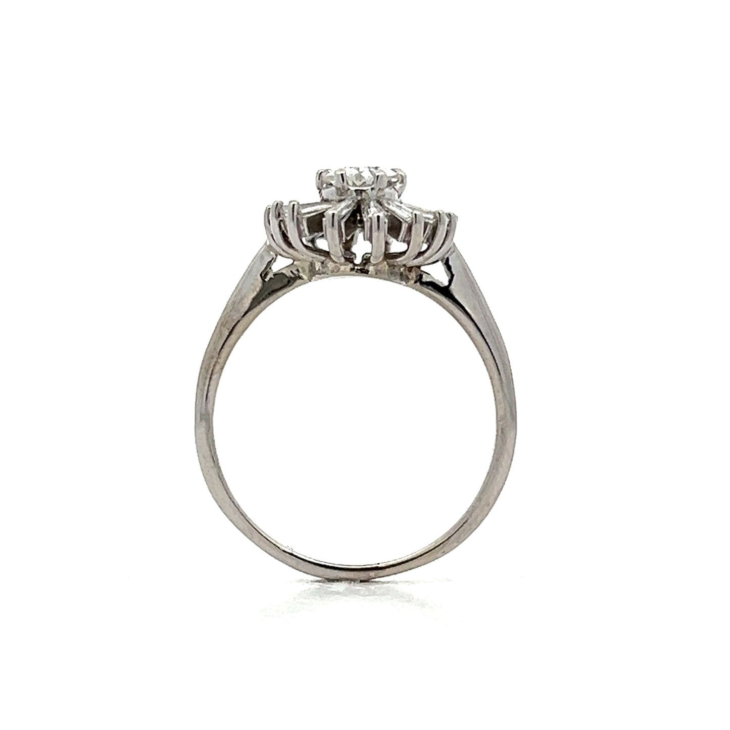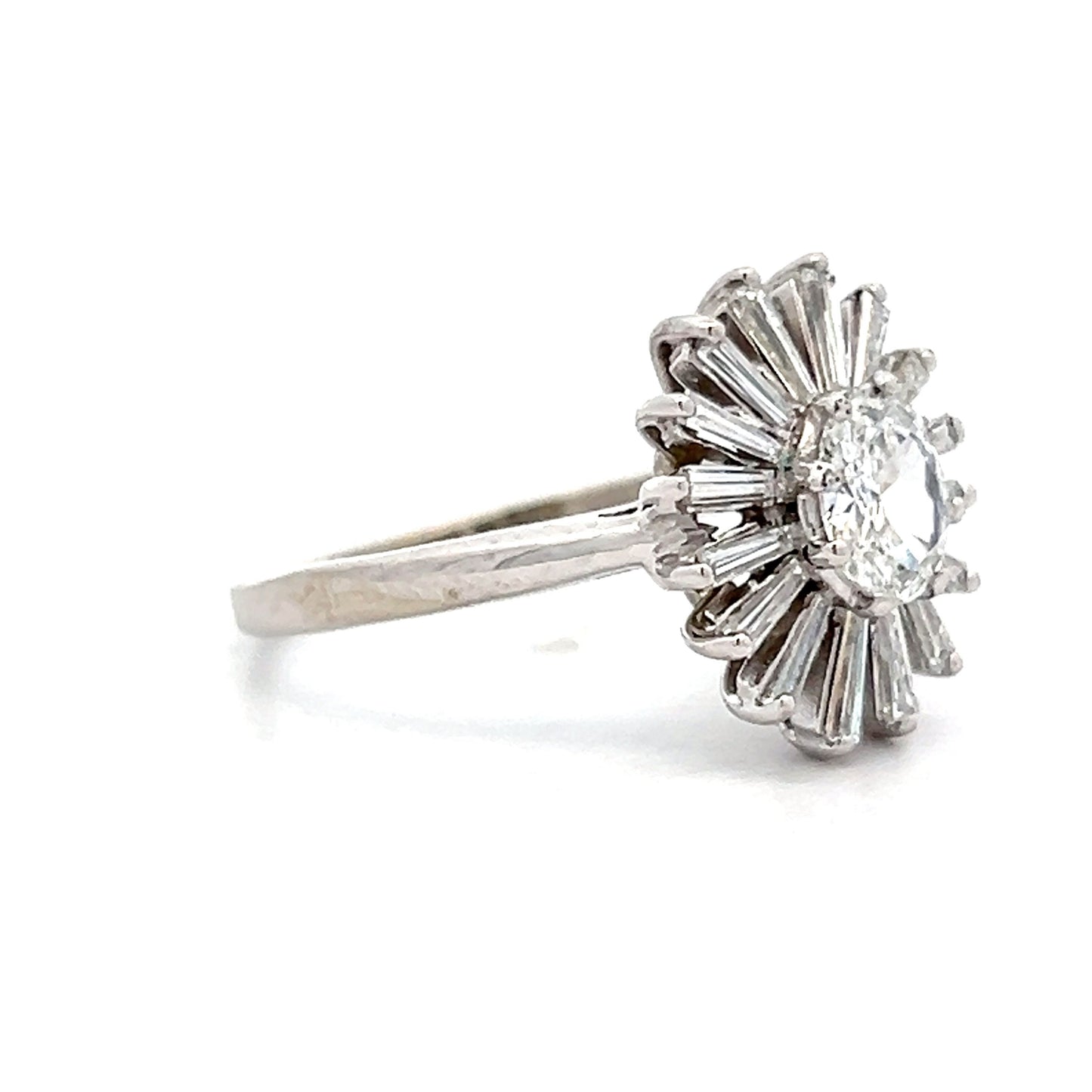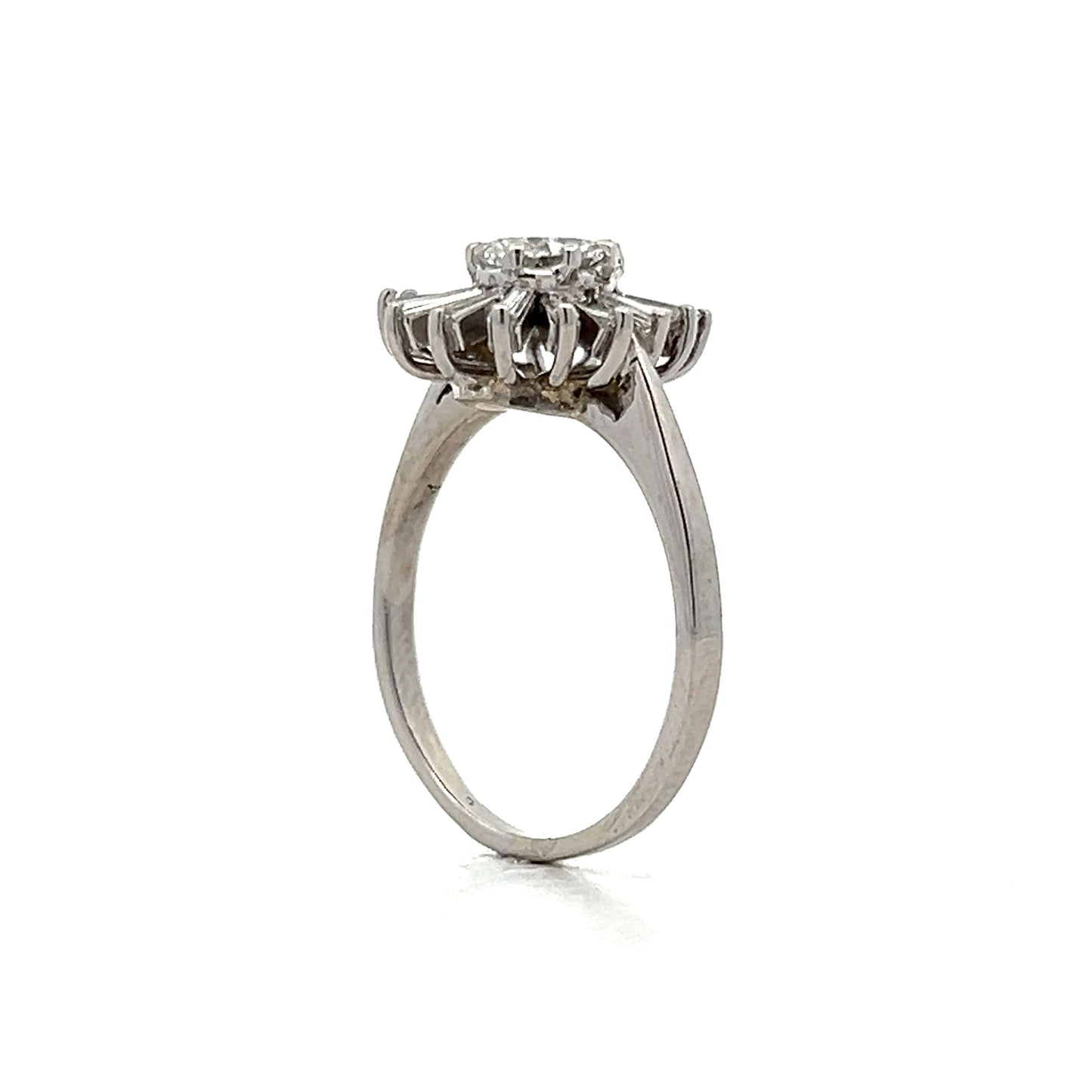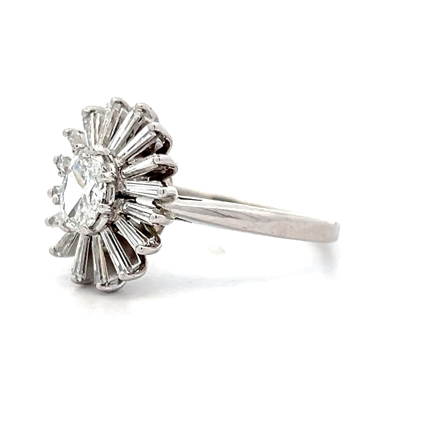 This Ballerina Halo engagement ring in 14k white gold showcases a .61 carat oval diamond, graded G color and SI1 clarity, securely set in eight prongs. Surrounding the center stone is a halo of sixteen tapered baguette diamonds, each measuring 3.50 x 1.25 x 1.00 mm and weighing .04 carats, with a total weight of .64 carats. These accent diamonds enhance the central diamond's brilliance, creating the dazzling halo effect.