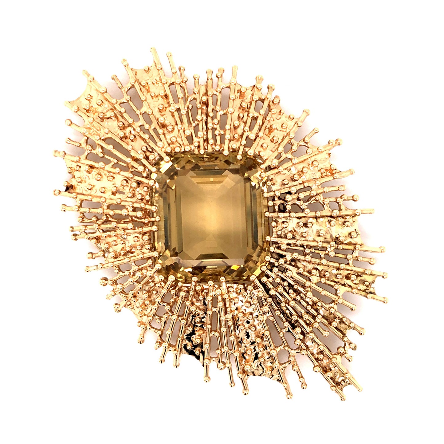 62 Carat Smoky Quartz Pendant in 14k Yellow Gold. This modern pendant features a 61.92 carat Emerald Cut smoky quartz finished in 14 karat yellow gold. The center quartz has a sandy beige hue that is lightly saturated, with elongated facets that complement its generous size. The primary stone is set in the center of an enchanting mounting in 14 karat yellow gold. This avant-garde pendant would make beautiful gift and family heirloom!