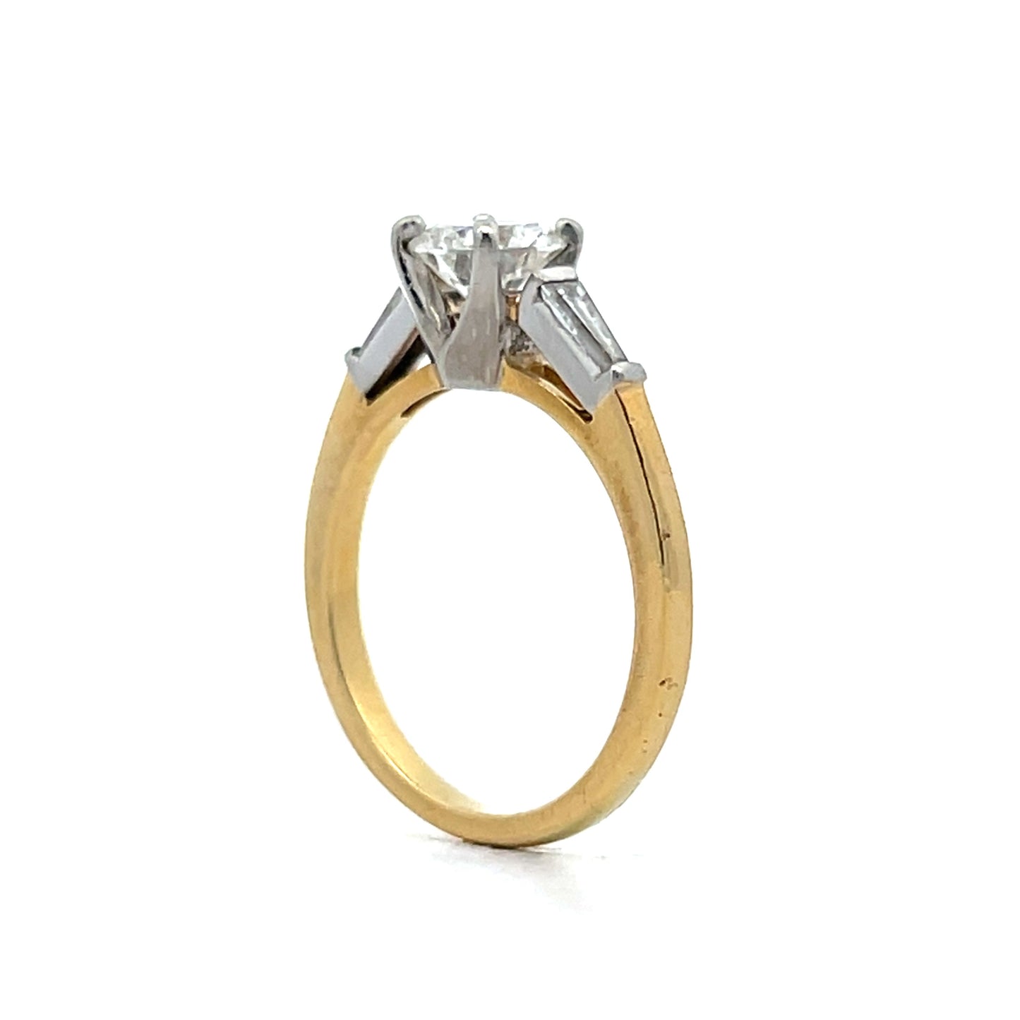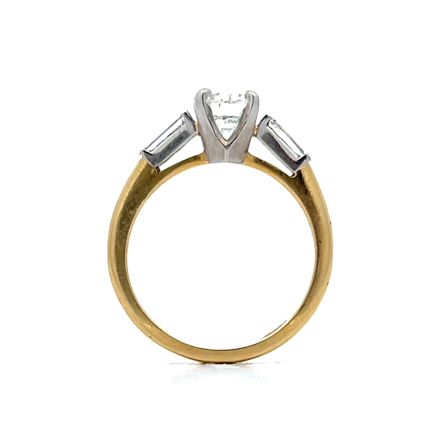This modern three-stone engagement ring features a .62-carat round brilliant cut diamond, secured by four platinum prongs. Two tapered baguette diamonds, totaling .24 carats, flank the central stone in a precise bar setting. The two-tone design pairs a yellow gold band with platinum prongs, creating a beautiful contrast that highlights the brilliance of the diamonds.