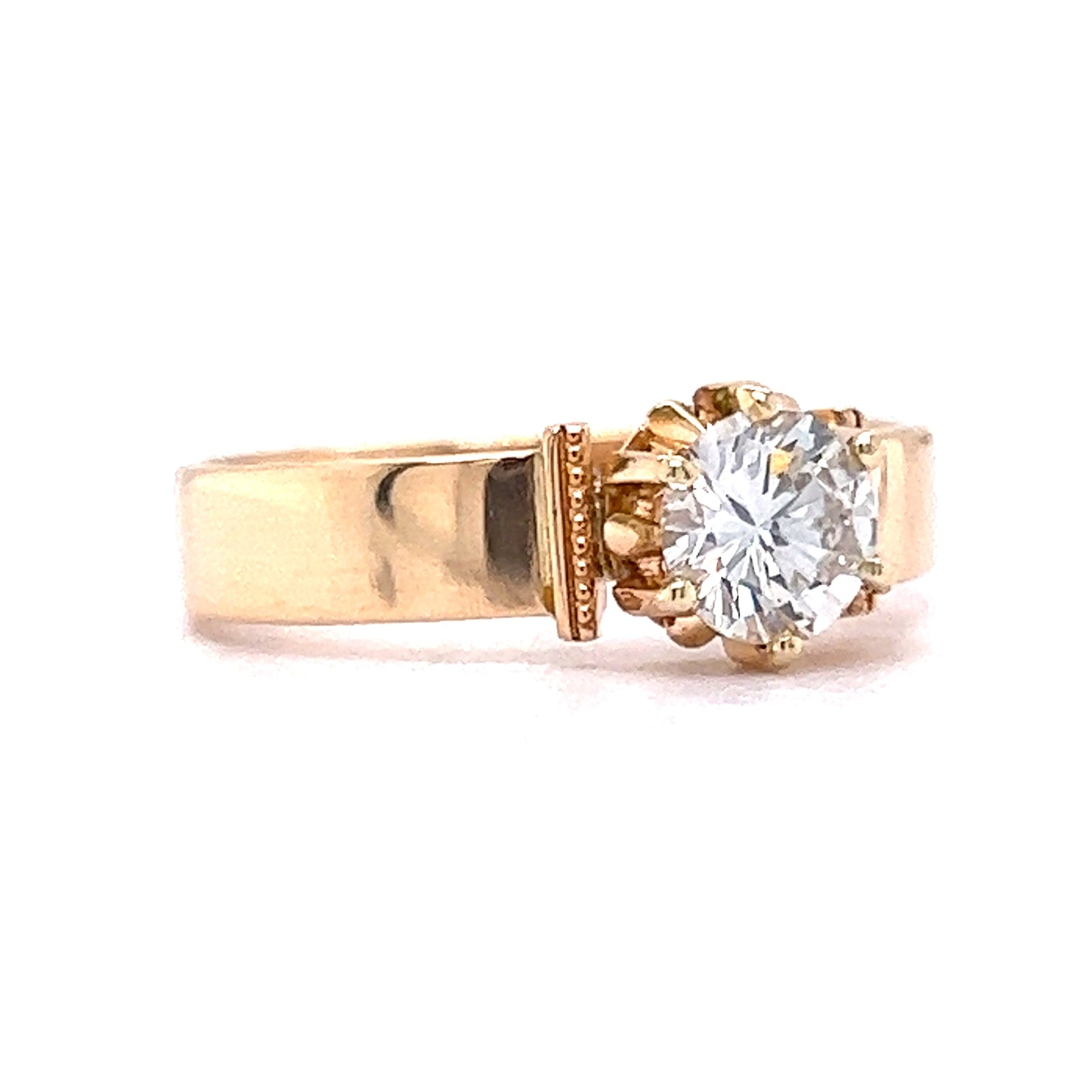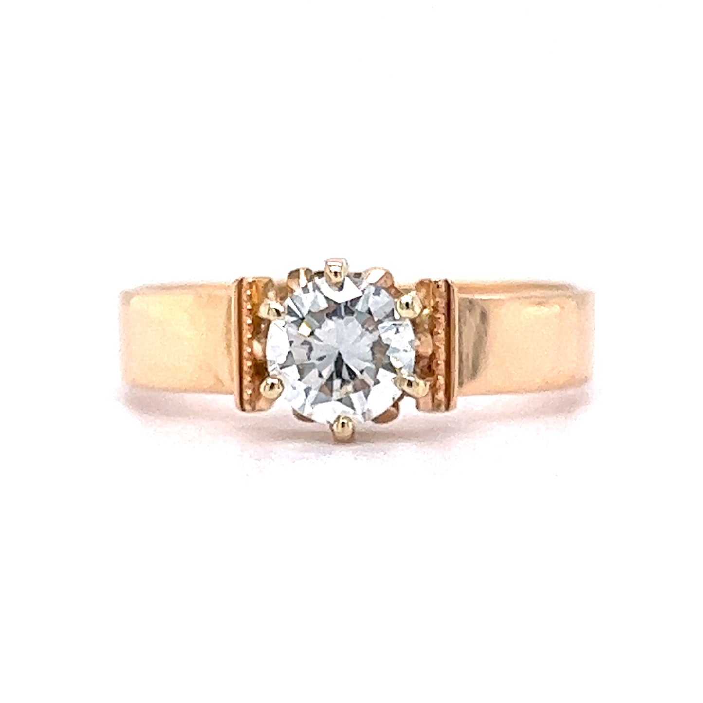 This romantic Victorian-era solitaire engagement ring features a .63 carat round brilliant cut diamond set in 18 karat yellow gold. The diamond has a clarity of VS2 and a color grade of G, making it stand out in its wide 18 karat yellow gold band. The diamond is set in a secure crown basket setting, allowing its brilliance and sparkle to be fully showcased. With its classic design, this beautiful diamond engagement ring is quite special.