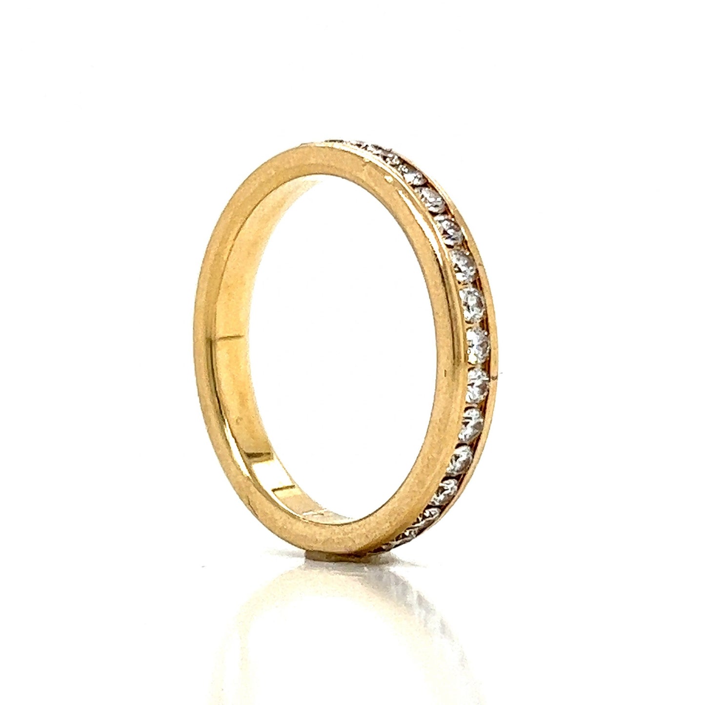 A chic diamond wedding band in 14K yellow gold! This stackable channel set diamond wedding band features .64 total carats of Round Brilliant cut diamonds in 14 karat yellow gold. Thirty-two (32) near colorless diamonds add a bright sparkle to the warm 14K yellow gold composition. A stylish diamond eternity ring. The band measures just under 3mm wide. This classic style of wedding band looks striking next to any style of engagement ring or can be worn as an everyday stacking band!
