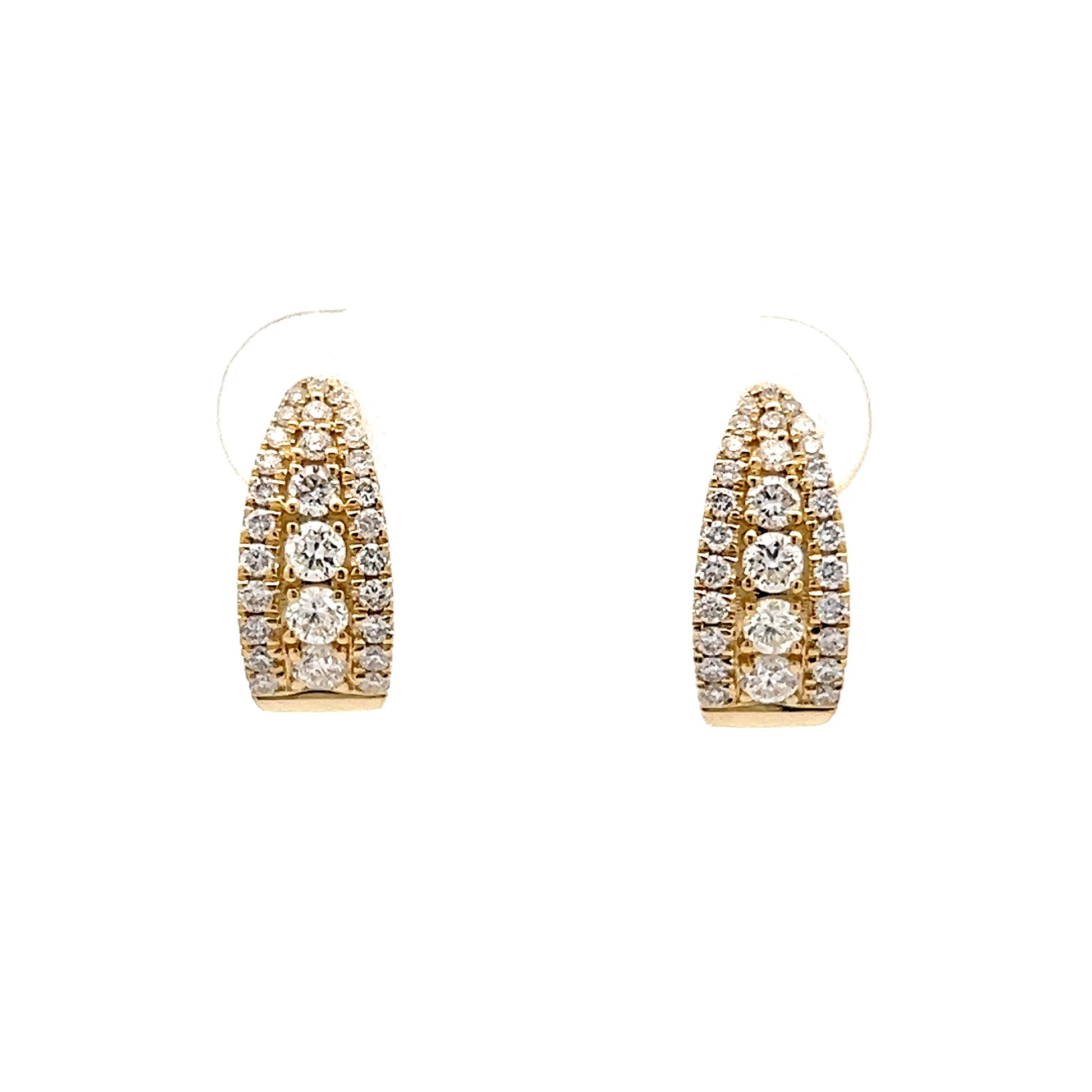 The earrings measure 13.5mm in length, which is about half an inch, making them small enough to hug the earlobe rather than dangle. The yellow gold metal provides a golden-colored background that contrasts with the white sparkle of the diamonds.