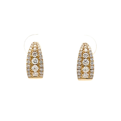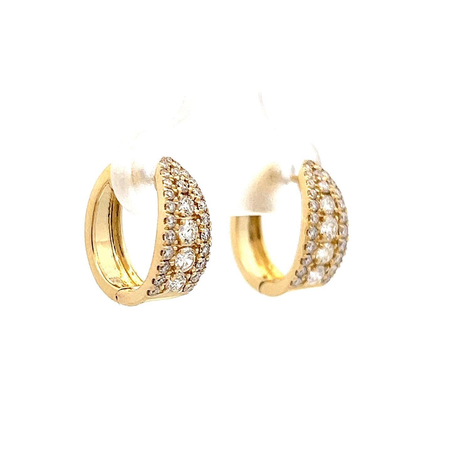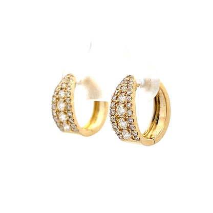 These modern huggie hoop earrings feature round brilliant cut diamonds set in 14 karat yellow gold. The earrings contain a total of .64 carats of diamonds with H color and VS2/SI1 clarity grades, meaning they appear white with very few or minor visible flaws. The diamonds are arranged in a pave setting, where many small stones are placed close together across the surface of the hoops.
