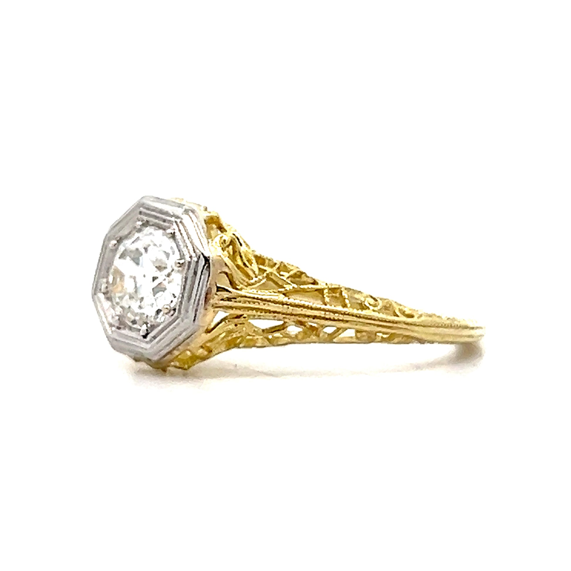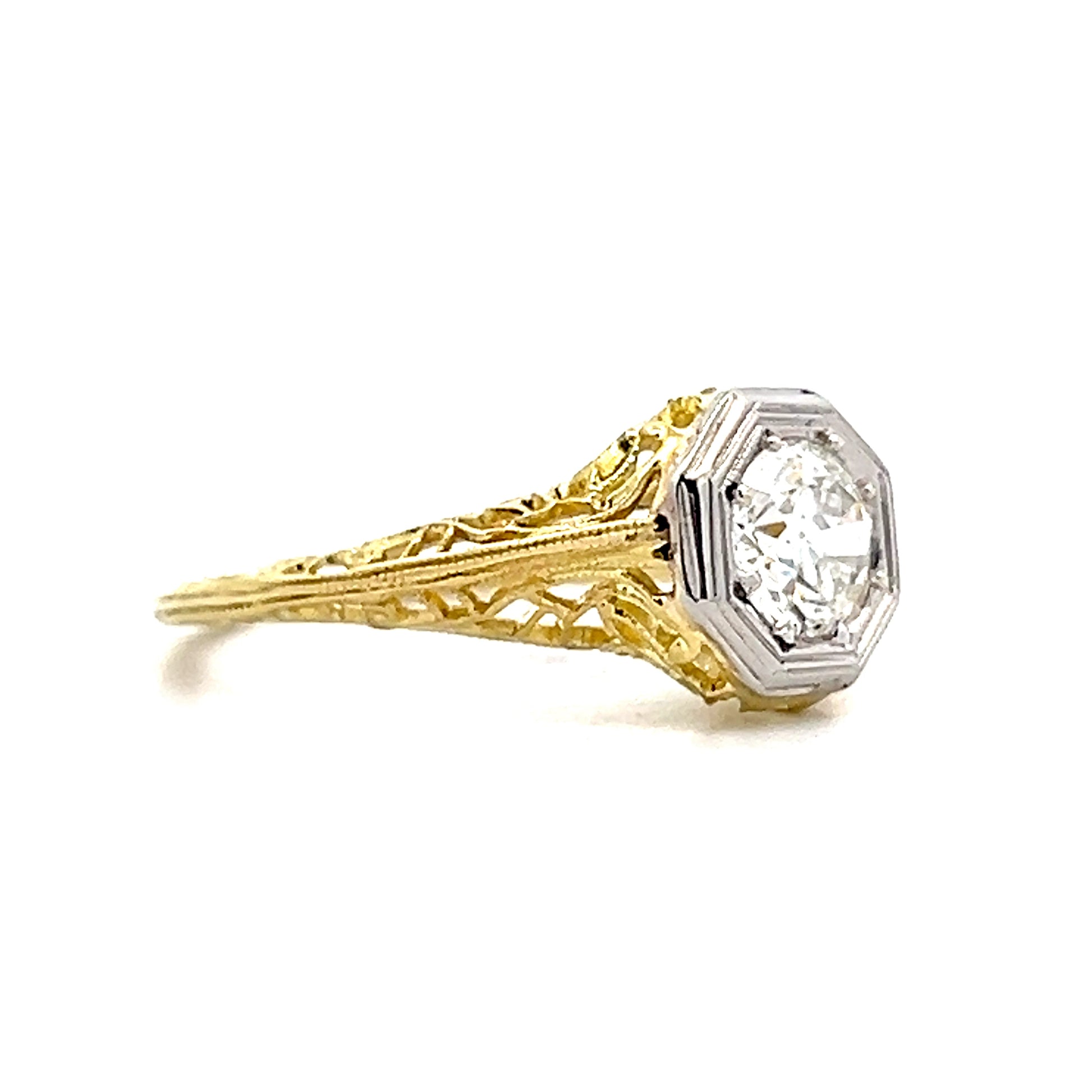 This Art Deco antique solitaire ring features a .65 carat Old European cut diamond with M color and VS2 clarity, set in a white gold octagonal basket on an 18 karat yellow gold band. The filigree style mounting showcases the intricate metalwork typical of the Art Deco era, with delicate patterns that frame the diamond beautifully. The Old European cut diamond has the hand-cut faceting and slightly different proportions that give antique stones their distinctive character and sparkle.