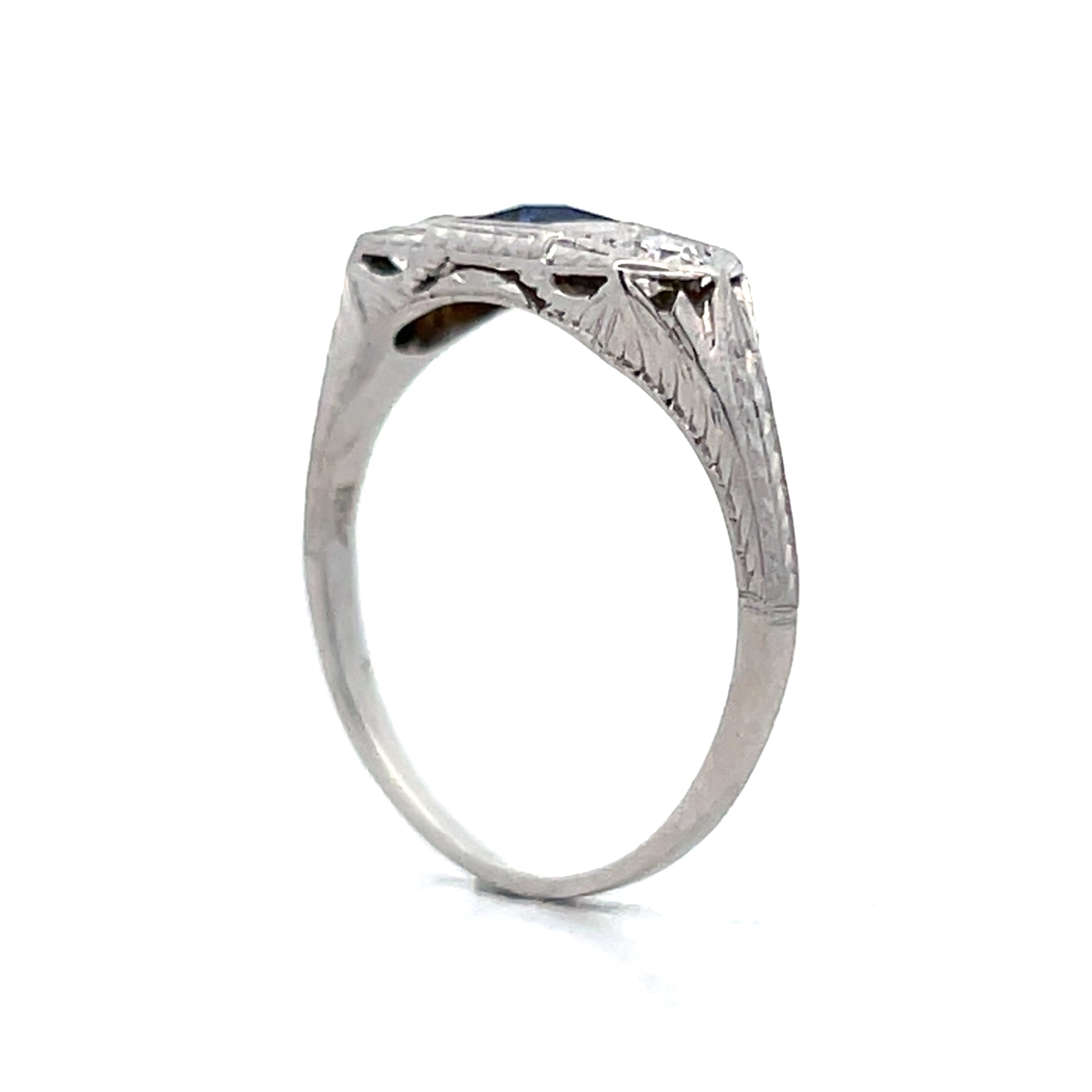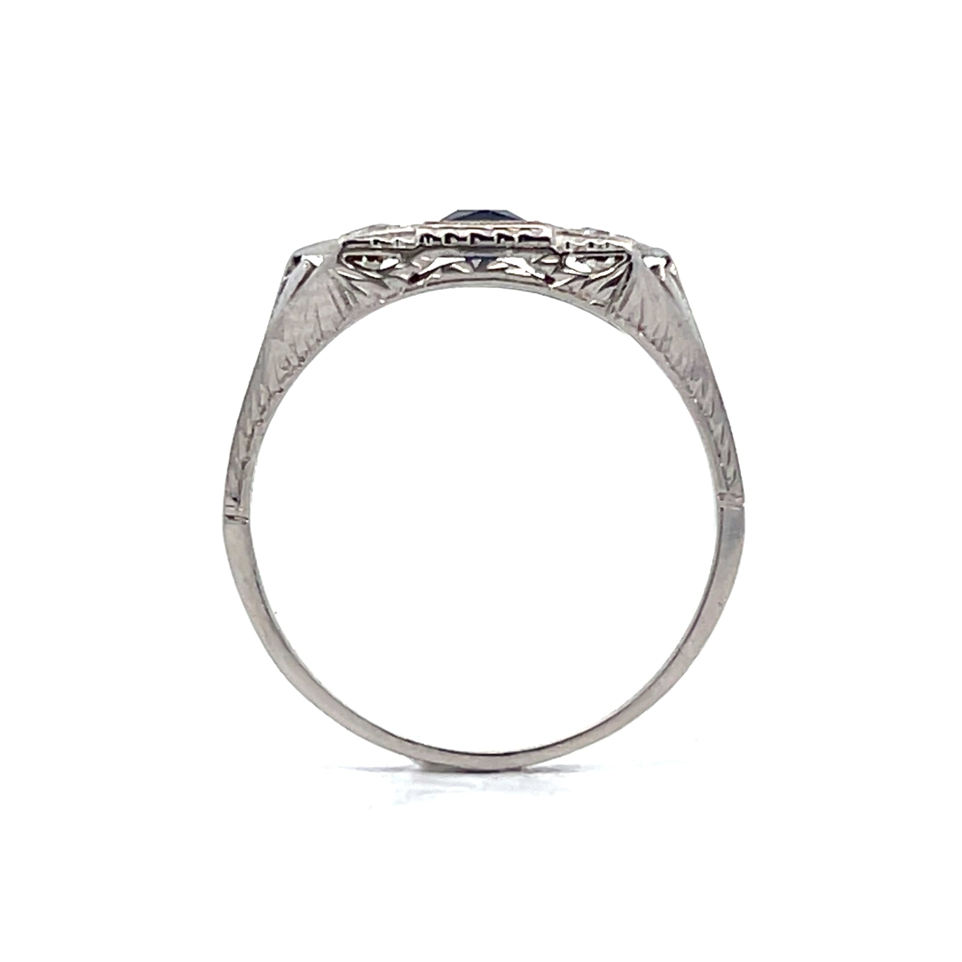 This Art Deco cocktail ring features a .65 carat French cut blue sapphire flanked by two old European cut diamonds (.08 carats each) set in 18 karat white gold. The three-stone design includes intricate filigree work and decorative engravings that reflect the detailed craftsmanship characteristic of the Art Deco period. The deep blue sapphire creates a striking contrast against the bright diamonds and white gold setting, while the geometric French cut and old European cut stones showcase the period's preference for precision and symmetry in gem cutting.