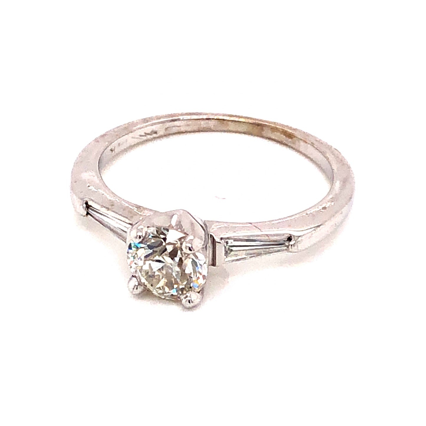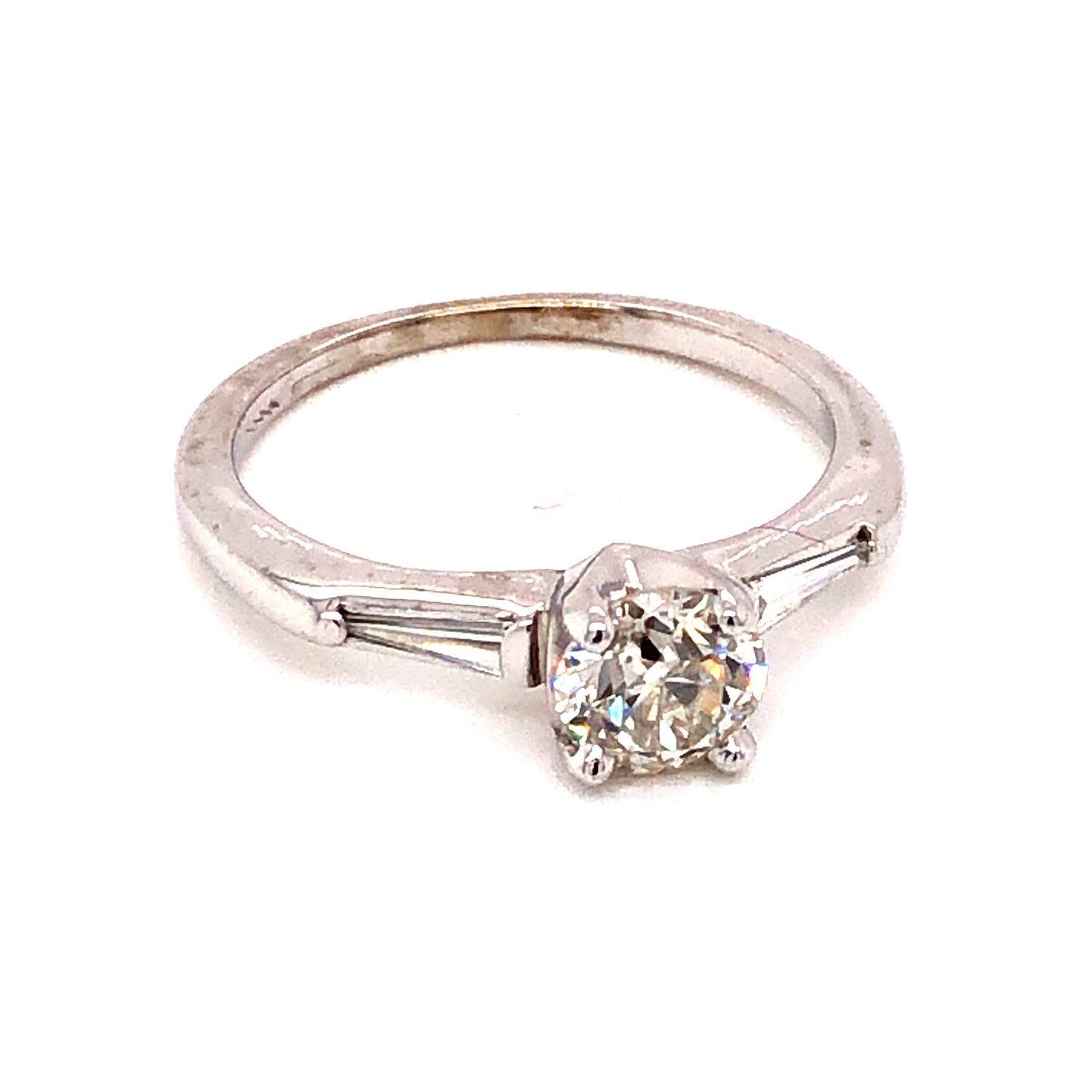 .67 Mid-Century Diamond Engagement Ring in 14k White Gold. This sleek Mid-Century engagement ring features .77 carats of diamonds finished in 14 karat white gold. The center stone is a .67 carat Old European cut diamond. The glittering primary stone is near colorless and set in four prongs. Two (2) .05 carat accent diamonds flank the center stone and are set in unique channel bars. The diamonds are finished in polished 14k white gold. The fire within the center diamond and brilliance of the accent stones make this Mid-century ring a streamlined, vintage work of art.