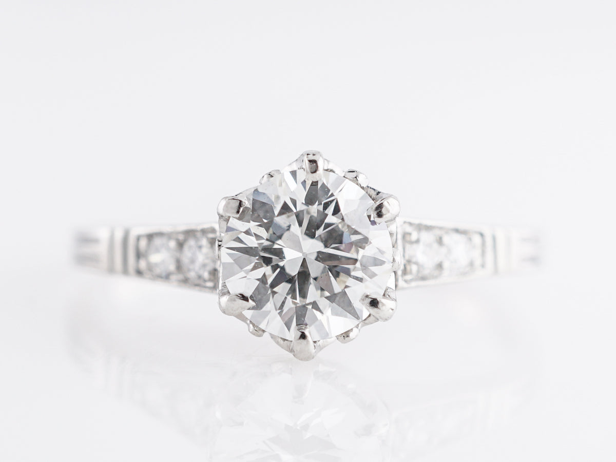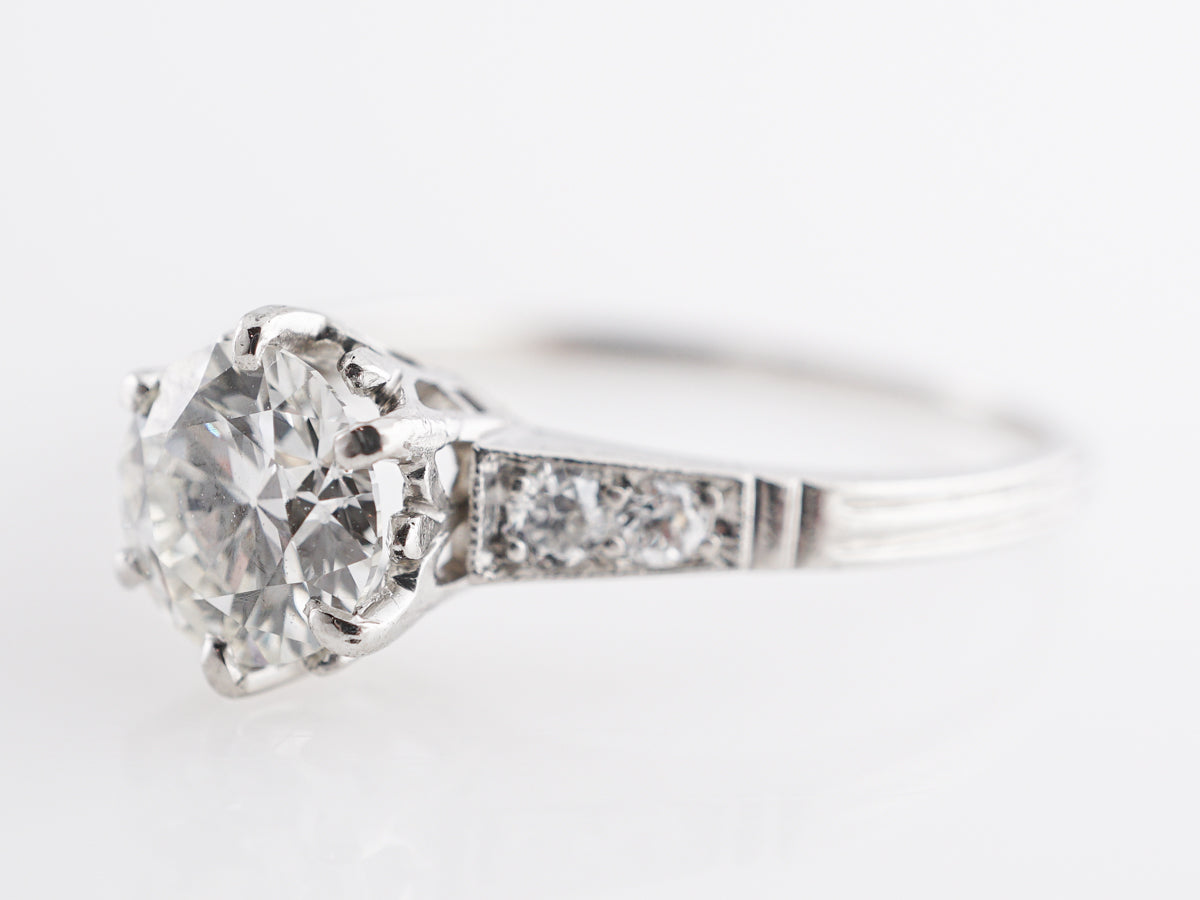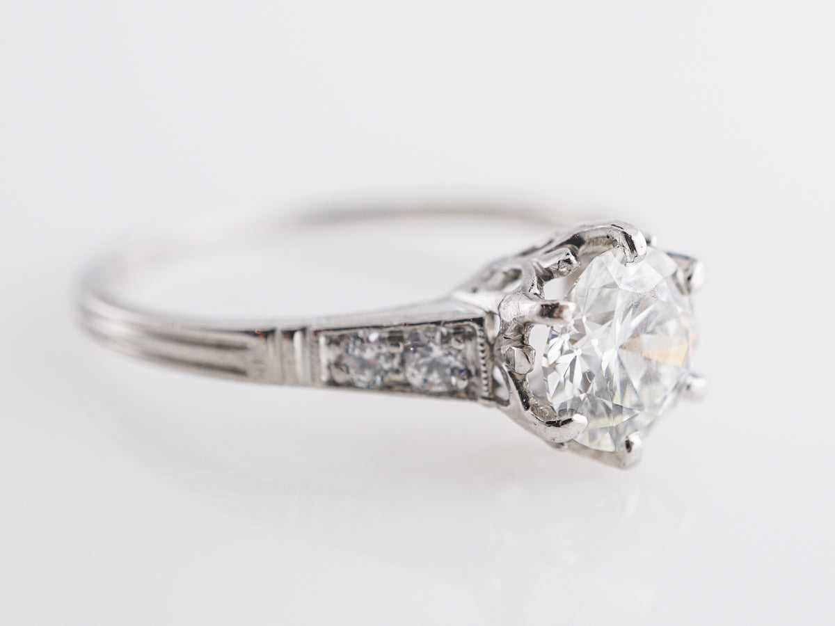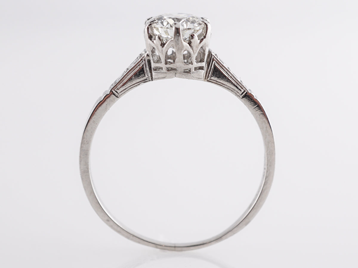 .68 Art Deco Transitional Cut Diamond Engagement Ring. This vintage Art Deco diamond engagement ring features a .68 carat genuine natural diamond on a platinum band. The primary stone is a transitional cut diamond, a more progressive relative to the Old European cut technique. This stone has an old world feel while maintaining a modern brilliant sparkle. Accented by two(2) .03 carat diamonds on both sides, this six-prong, Art Deco engagement ring is sure to impress!