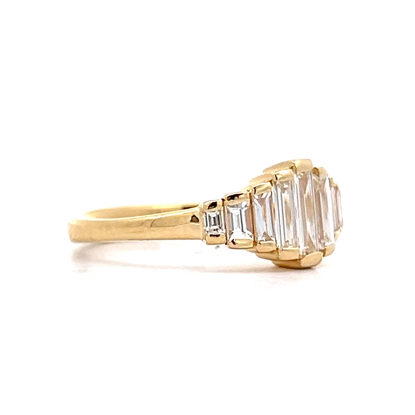 This engagement ring features a baguette-cut diamond center stone, weighing .17 carats with H color and VS2 clarity. Four accent diamonds surround the center, including two measuring 4.50 x 1.75mm and weighing .11 carats each, and two at 3.50 x 1.50mm with .07 carats each. The 18 karat yellow gold band tapers slightly, adding to the geometric look of the ring.