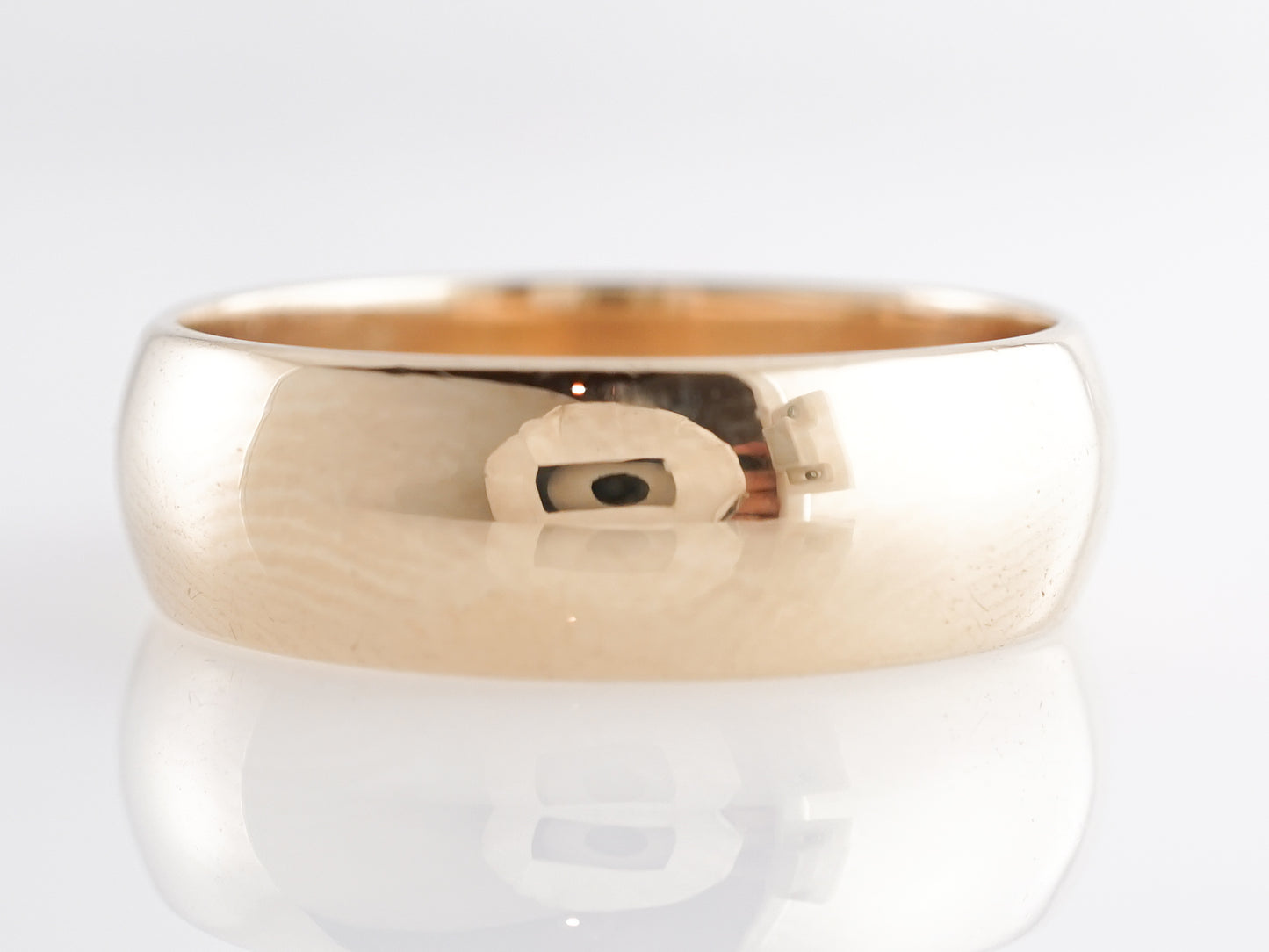 This modern men’s wedding band features a high-polished finish on 14k yellow gold. The warm yellow gold band measures 6.08mm wide and has a D-shaped shank. This thick men’s wedding ring is currently a size 8, but can be sized upon request. A timeless classic with good reason!