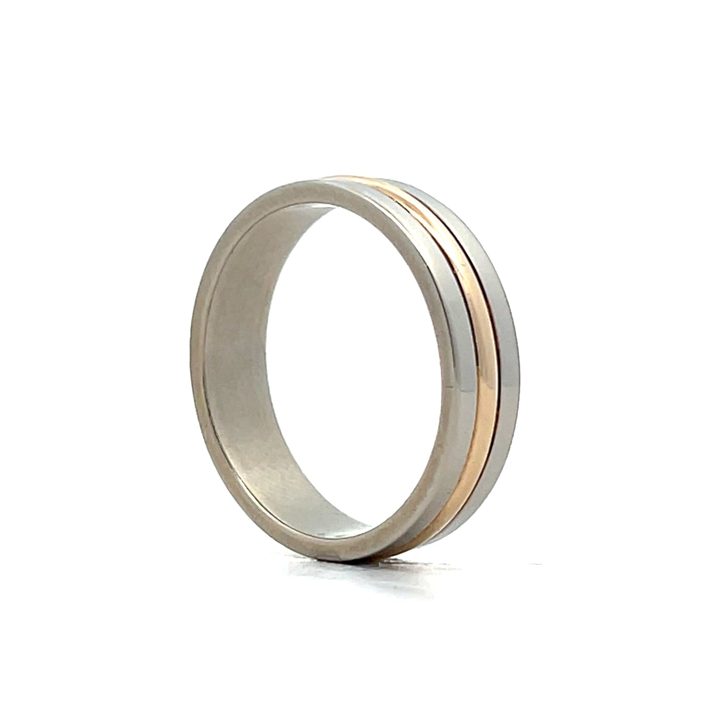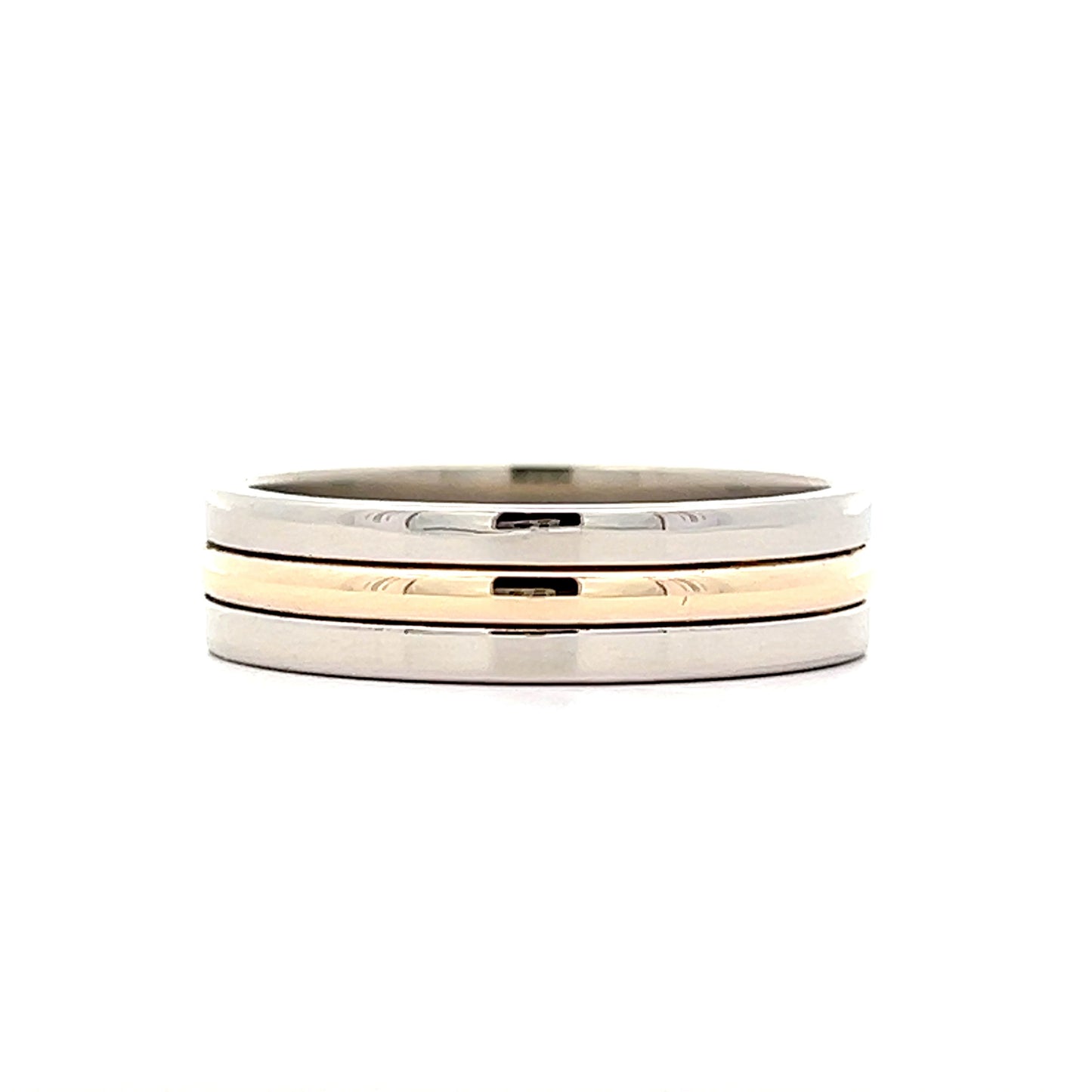 This men's wedding band features a triple-stacked layout that gives the ring a unique texture. The ring pairs sleek 14 karat white gold edges with a vibrant 14 karat yellow gold center for a contrasting yet cohesive look. At 6mm wide, the band has a balanced and substantial feel, while the smooth finish enhances its clean, modern aesthetic.