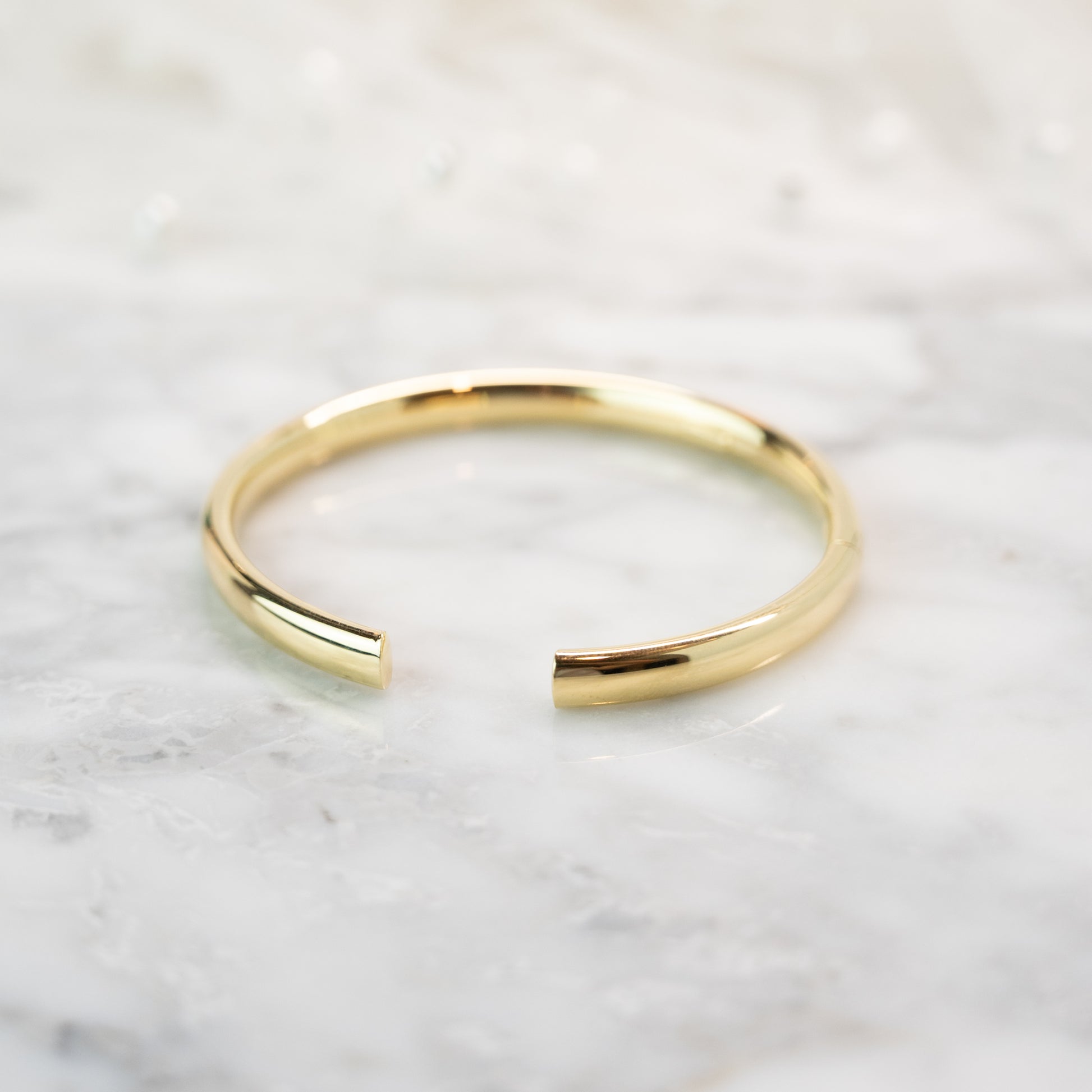 This 14-karat yellow gold hinged bangle features a hollow tube construction measuring 6mm in width. The bracelet has an interior circumference of 6.75 inches and opens with a hinged mechanism. The design is clean and simple, without any accent stones or additional details. The hollow construction reduces the overall weight while maintaining the substantial appearance of solid gold.