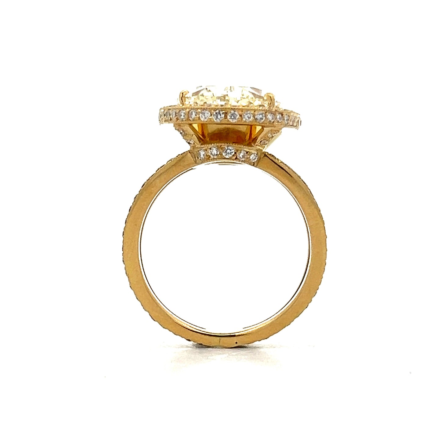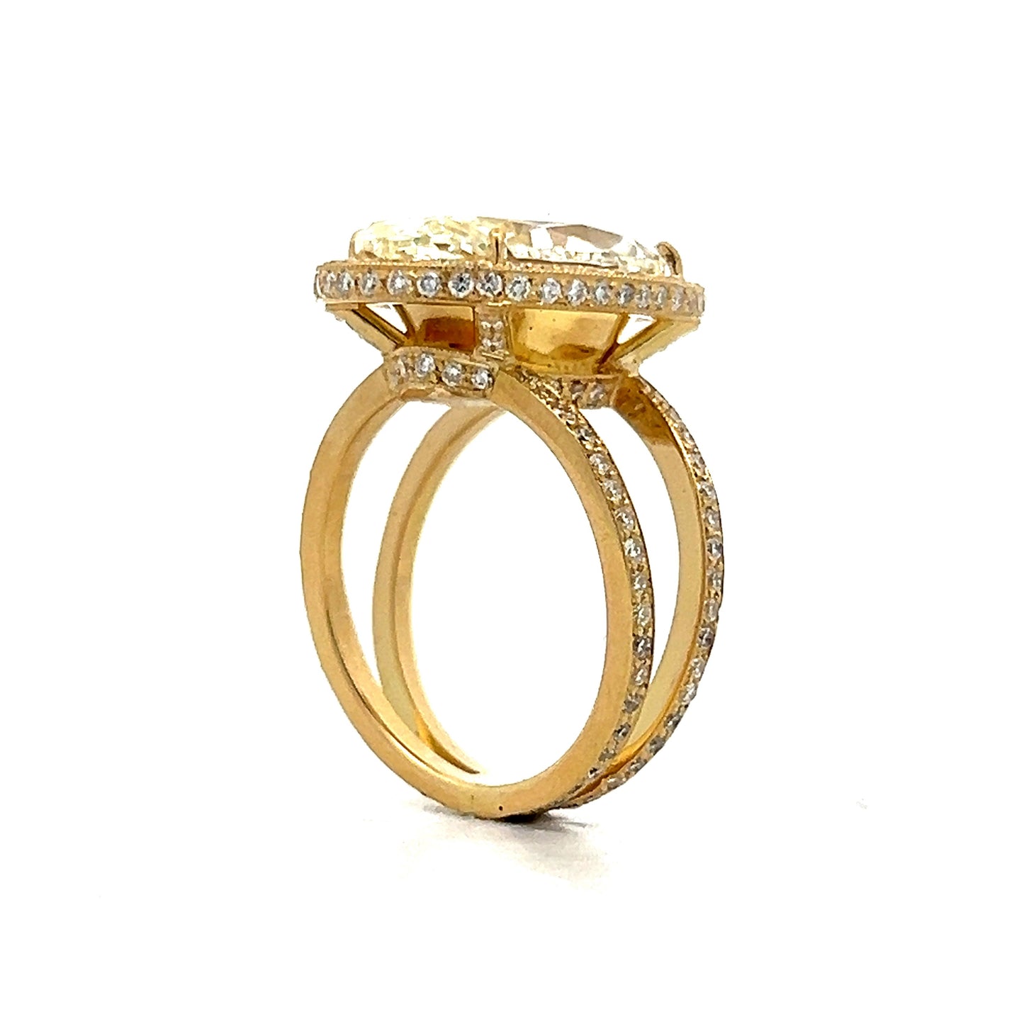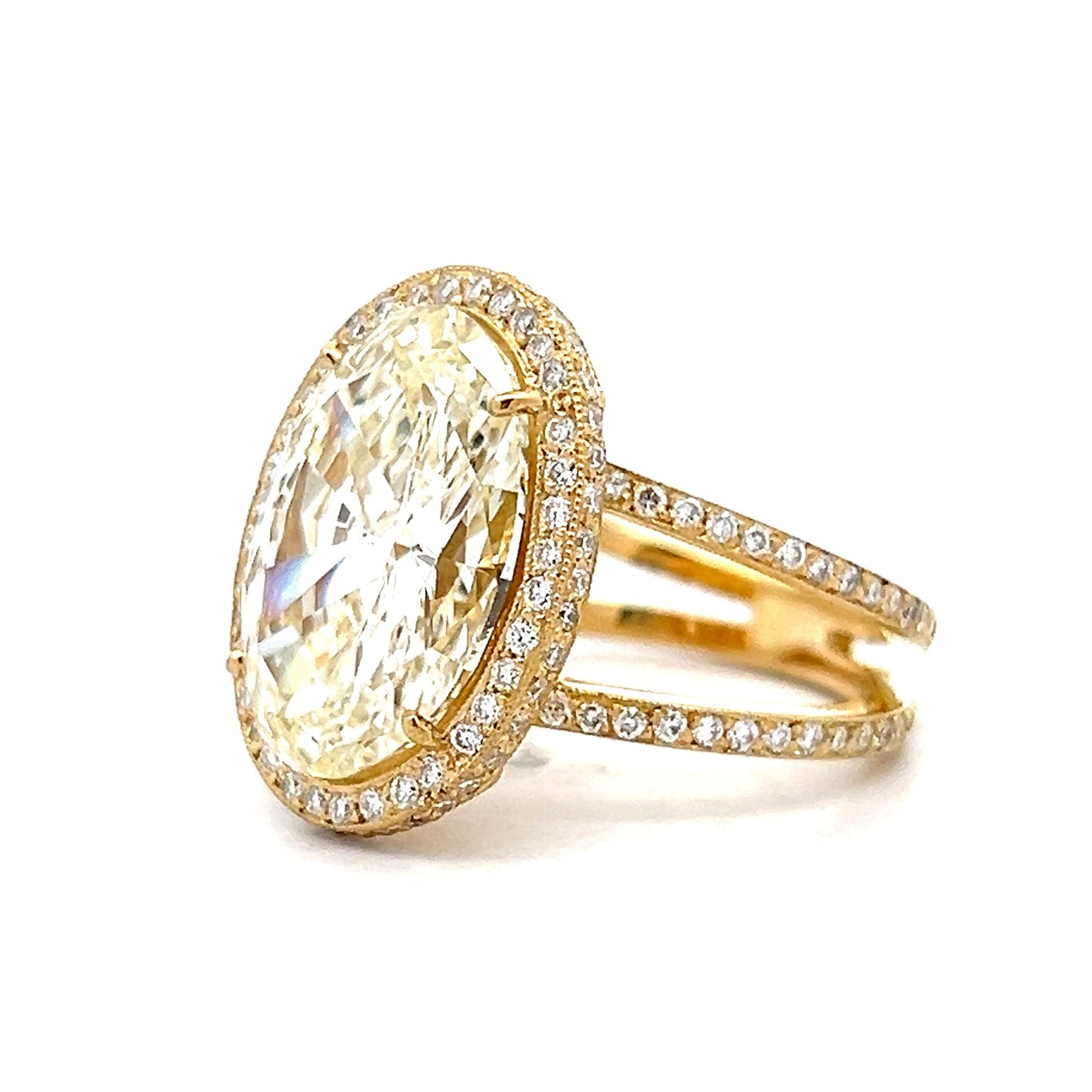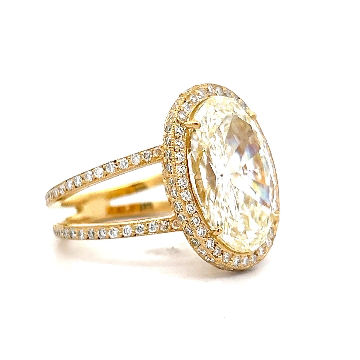 This modern engagement ring features a 7.39-carat oval cut diamond with VVS2 clarity and M color as its centerpiece. The diamond is securely held by four prongs in a polished 18k yellow gold mounting. Surrounding the center stone is a halo of round brilliant cut diamonds, totaling 1.80 carats, set in a split shank double band also made from 18k yellow gold, with a 22k yellow gold cup highlighting the center diamond. The split shank design includes diamond eternity bands, where 180 diamonds, each measuring 1.3 mm and weighing .01 carats, encircle the entire ring. This ring is truly a statement piece and a show stopper.
