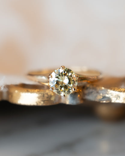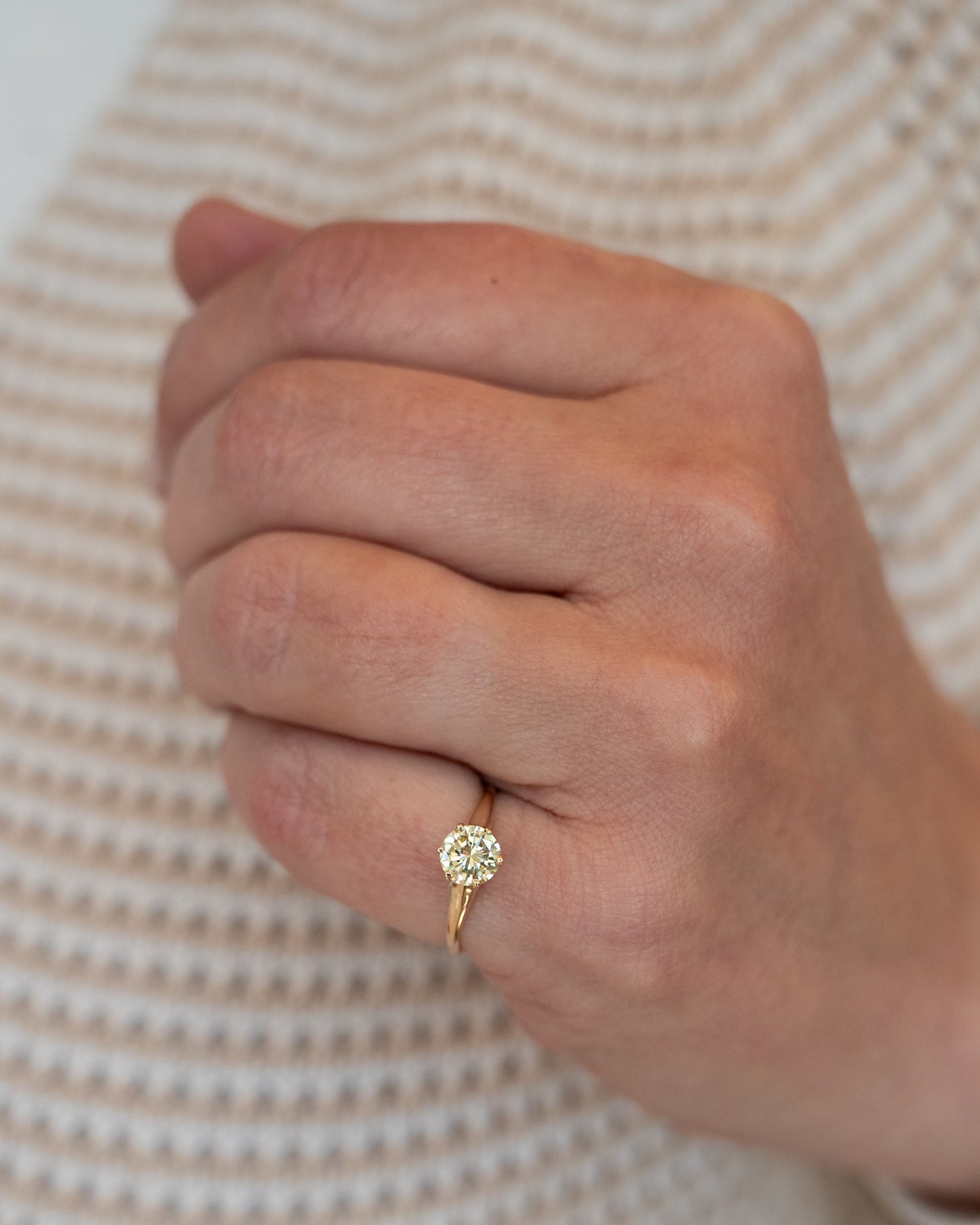 The stone sits in a six-prong basket setting that both protects the diamond and lets light pass through it from every angle. The band is thin at just 1.5 mm wide, which keeps the focus on the diamond.