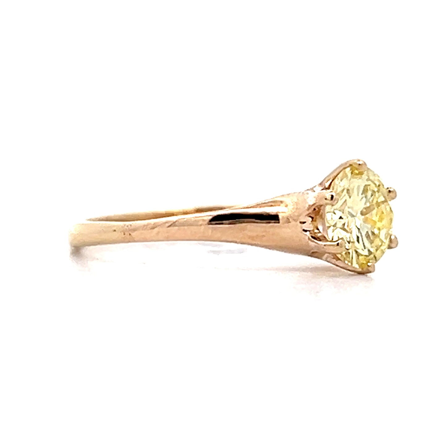 This Victorian era ring has a .70 carat round brilliant cut diamond set in 14k rose gold. The natural diamond has VS2 clarity, meaning it looks clear when viewed without magnification. The diamond has a Fancy Yellow color that gives off a warm glow against the rose gold metal.