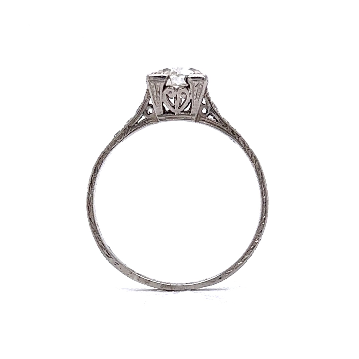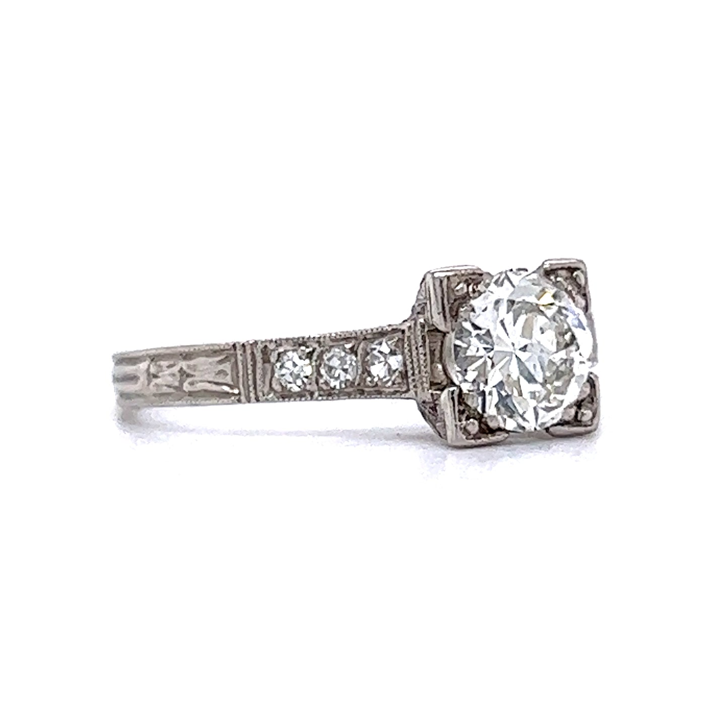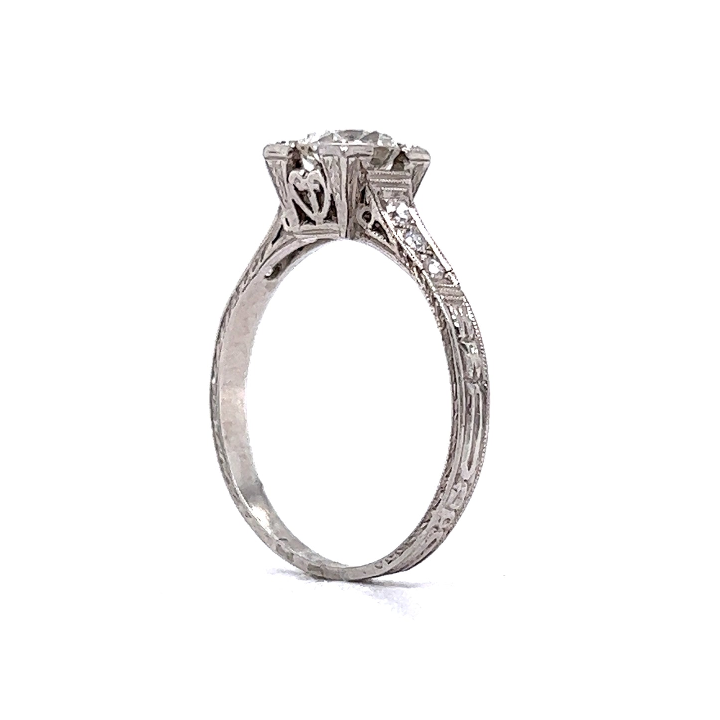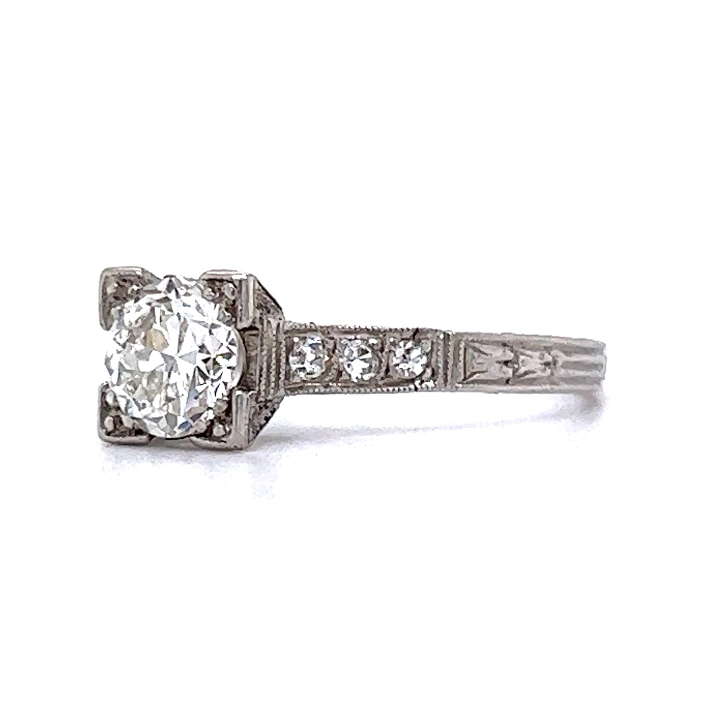 Conflict-free diamond engagement rings are a beautiful and ethical choice for your special ceremony. This one of kind Art Deco engagement ring features a .70 carat old European cut diamond and diamond accents in platinum. The glittering white center diamond is mounted in a decorative basket. Six (6) .015 carat diamonds line the shoulders of the ring. The shank features antique engravings finished in polished platinum. Shop more Platinum Engagement Rings.