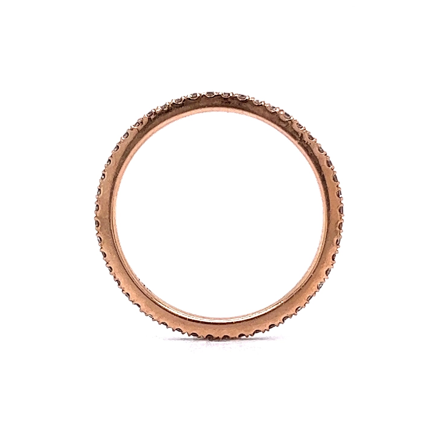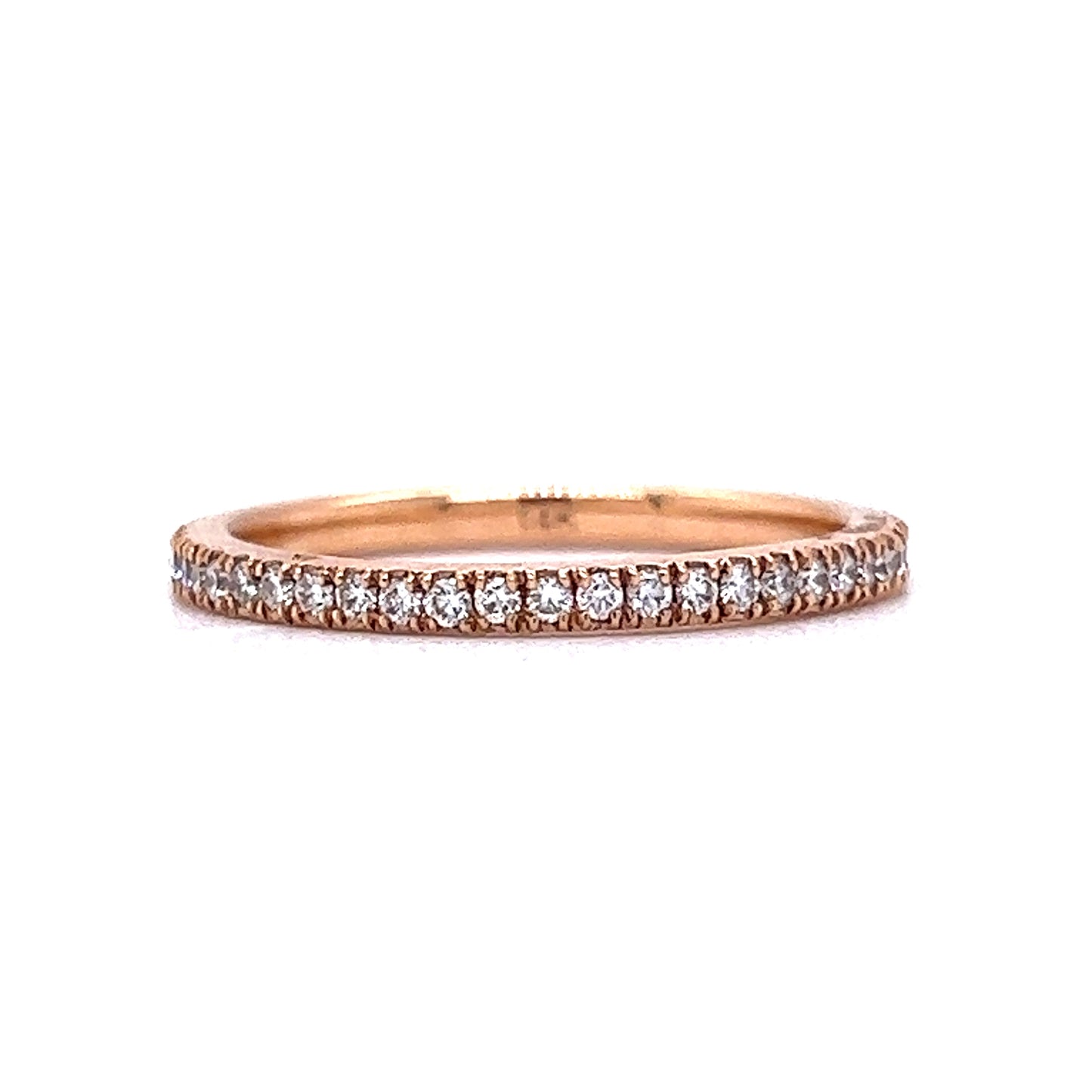 This elegant eternity wedding band features .72 carats of Round Brilliant cut diamonds set in 14 karat rose gold. A collection of forty-eight (48) sparkling diamonds decorate the dainty rose gold band. This ring would be a perfect addition to give a solitaire engagement ring a little extra sparkle. Modern, chic easy to stack. This style of eternity wedding band pairs well with mot styles of engagement rings! Rose gold wedding bands are romantic and look fabulous when worn in a mixed metal stack.