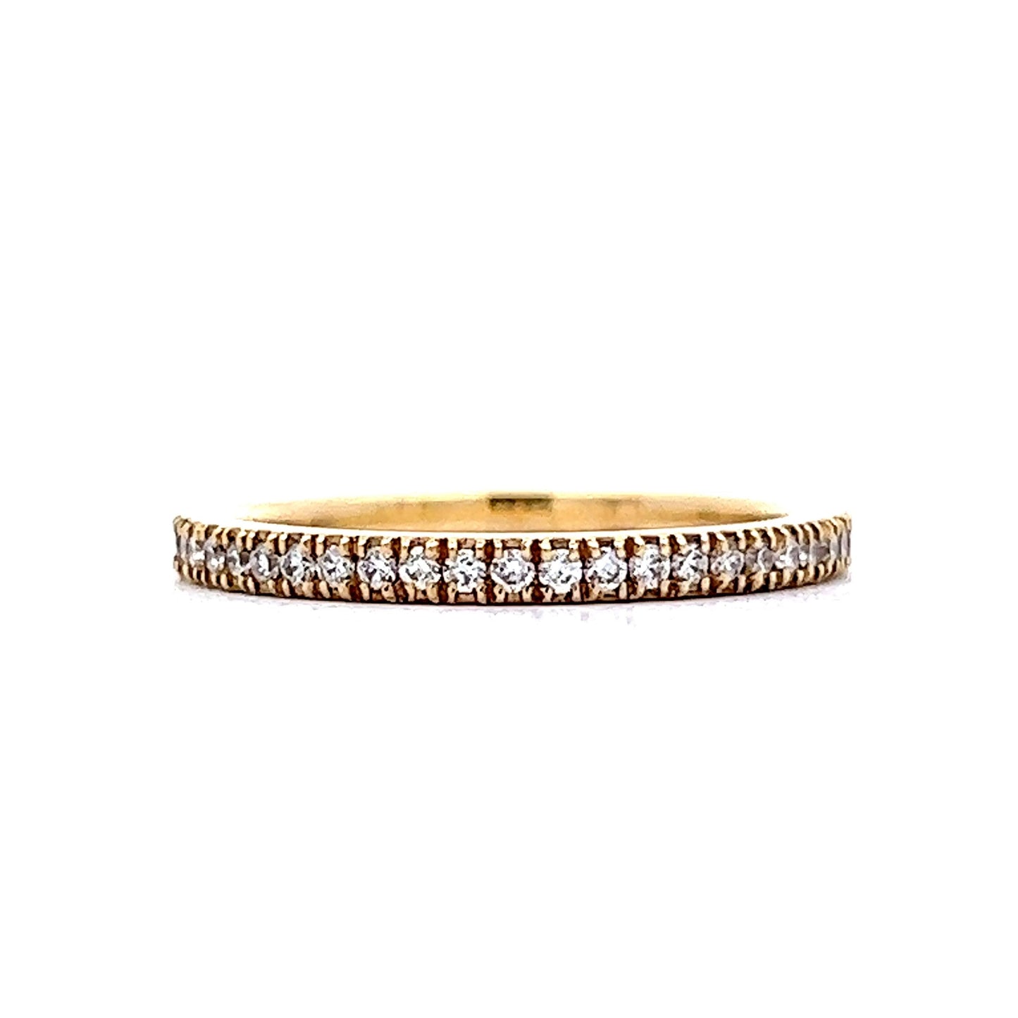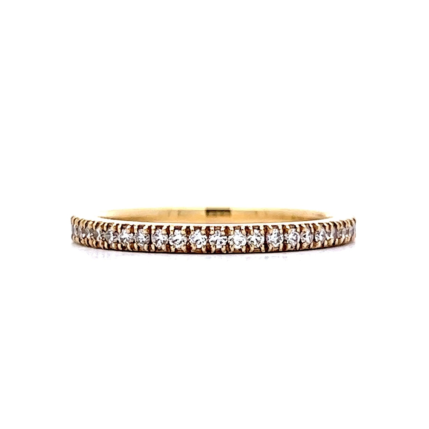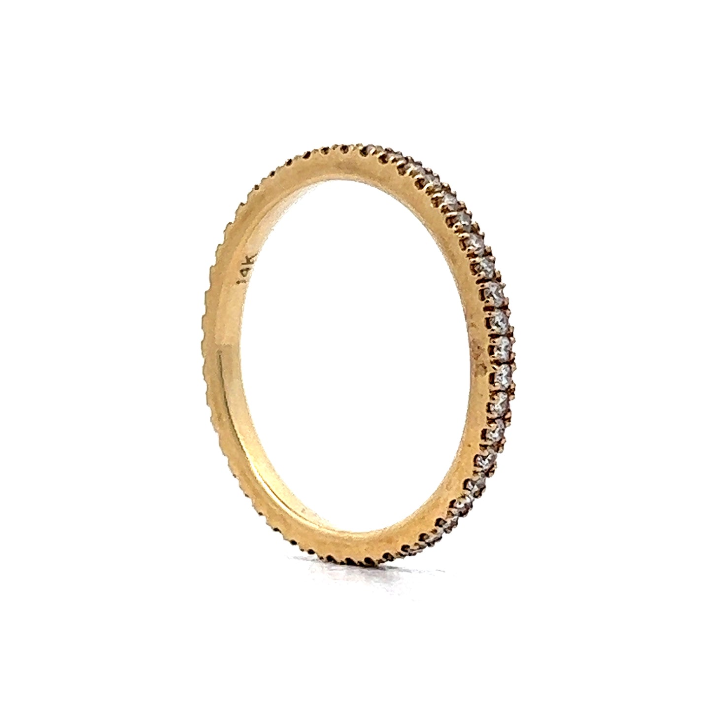 This elegant eternity wedding band features .72 carats of Round Brilliant cut diamonds set in 14 karat yellow gold. A collection of forty-eight (48) sparkling diamonds decorate the dainty yellow gold band. This ring would be a perfect addition to give a solitaire engagement ring a little extra sparkle. Chic easy to stack. This style of eternity wedding band pairs well with mot styles of engagement rings!