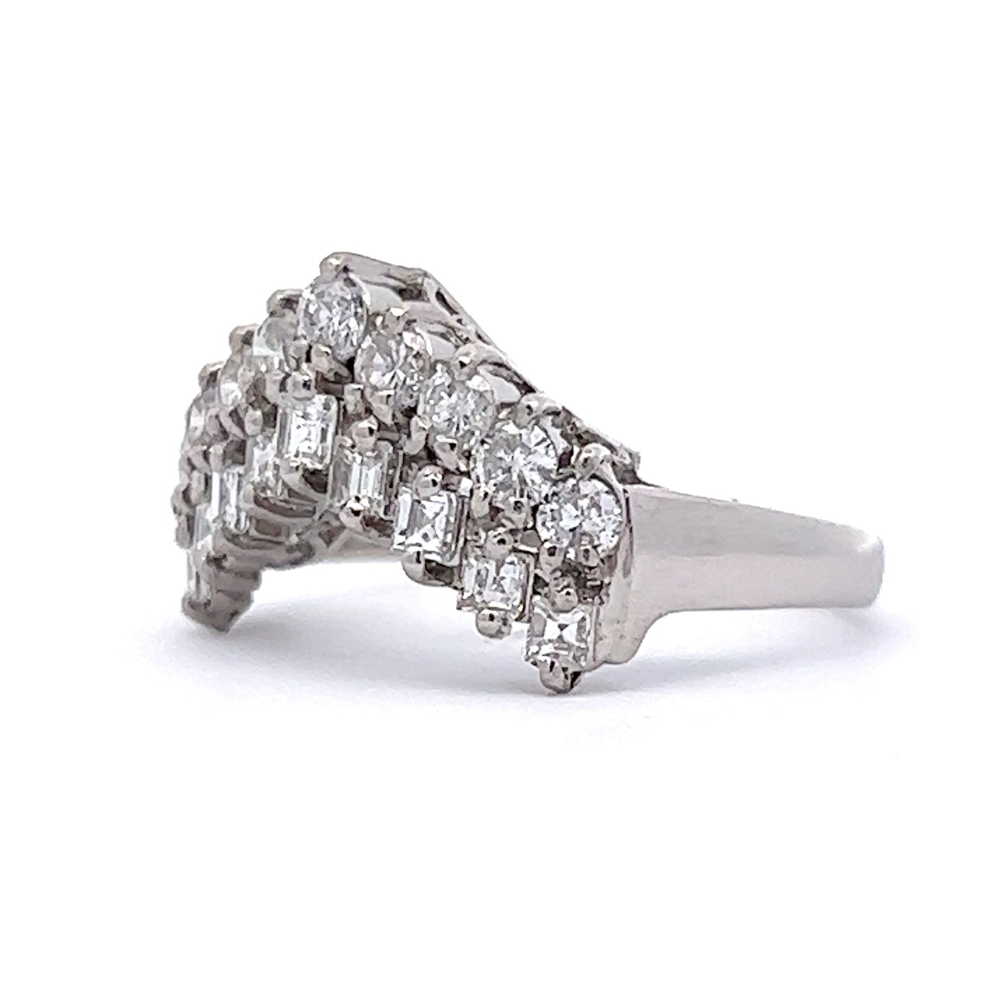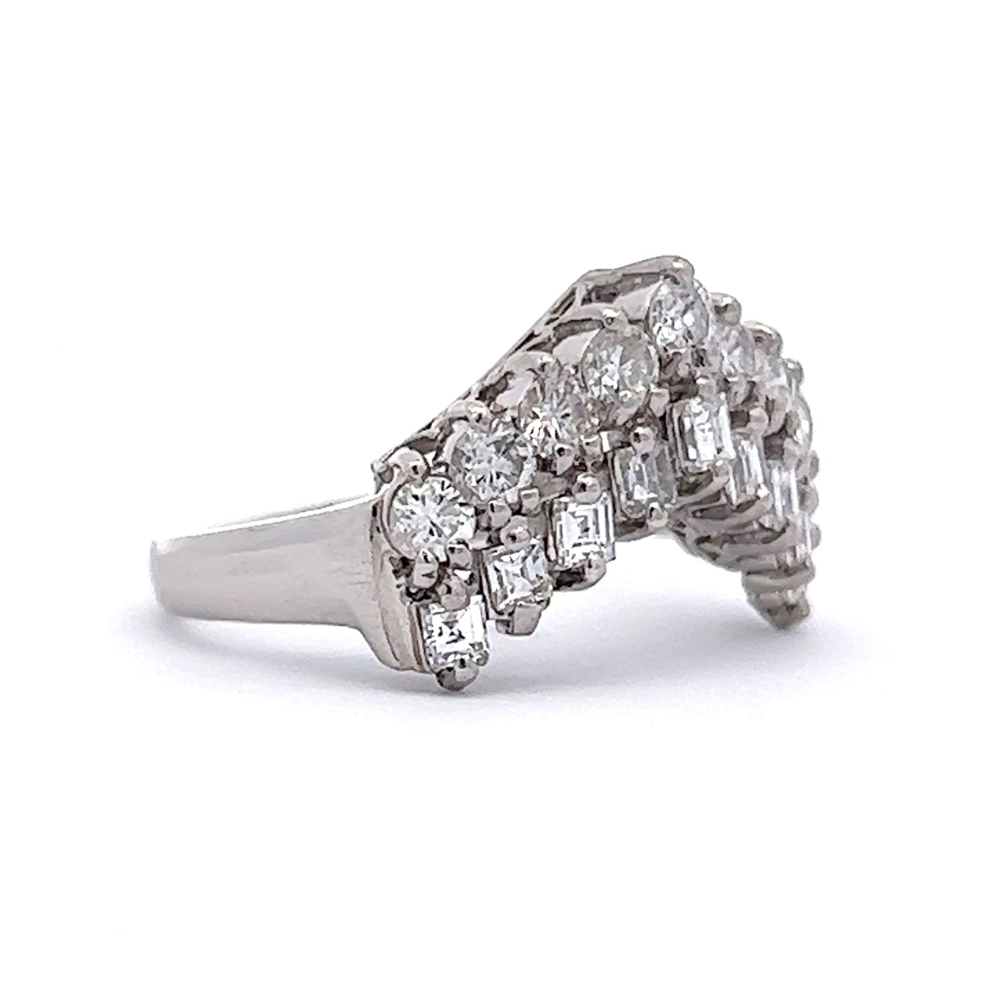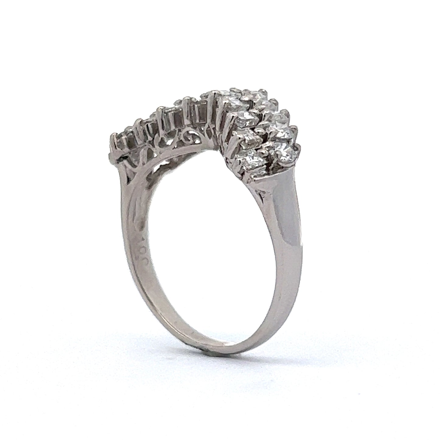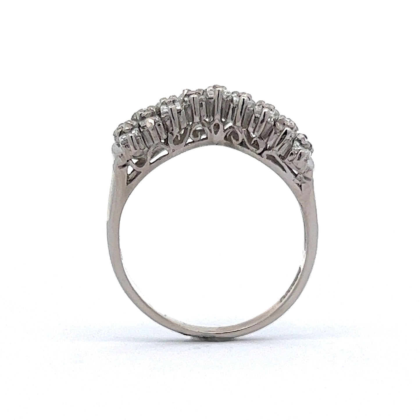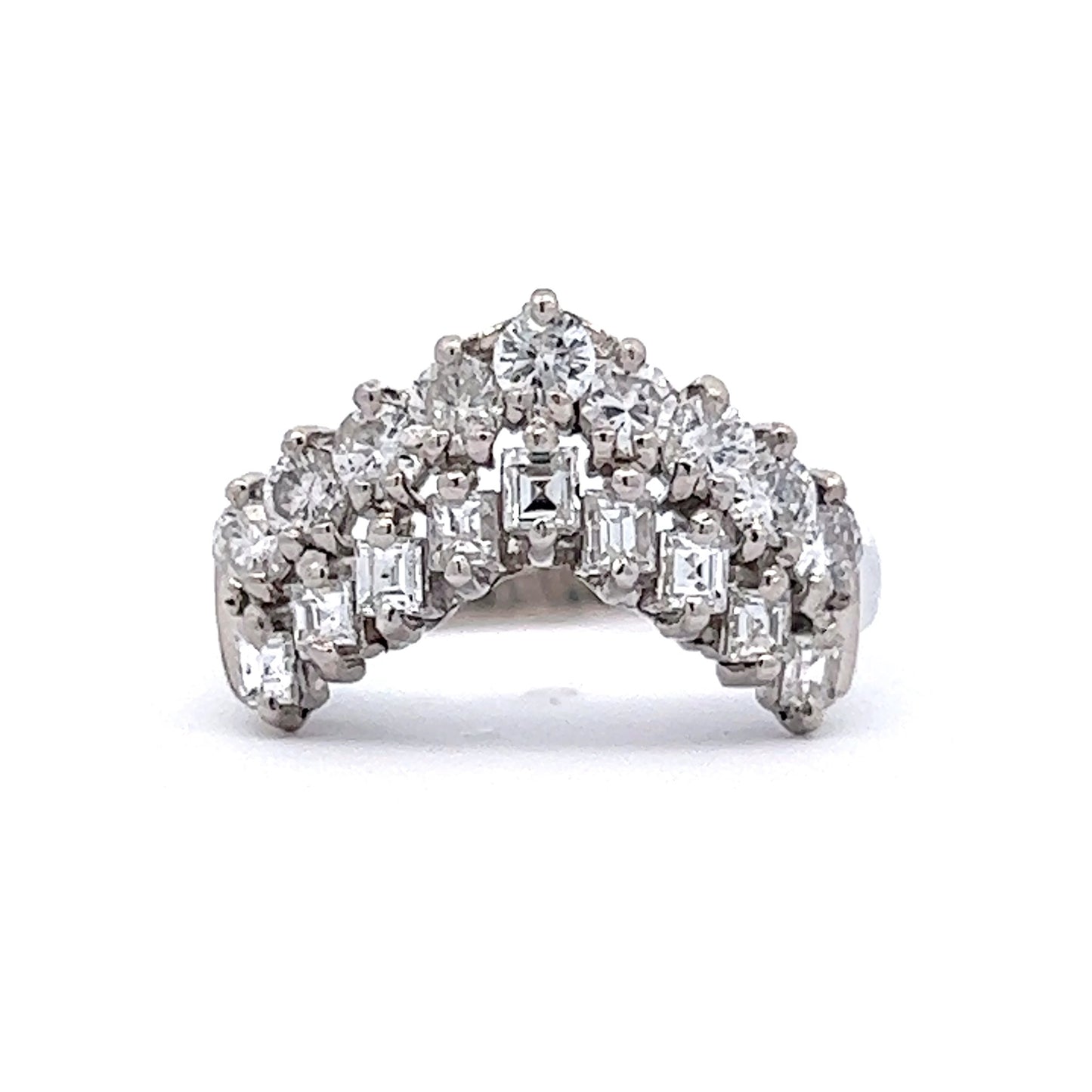 This modern wedding band is crafted in platinum and features 9 round brilliant cut diamonds, elegantly presented in a stacked-diamond tiara design. The diamonds are rated H-I in color and SI1-SI2 in clarity. The contoured silhouette of this unique ring allows it to stack easily next to a low profile engagement ring, creating an eye-catching look and dramatic look.