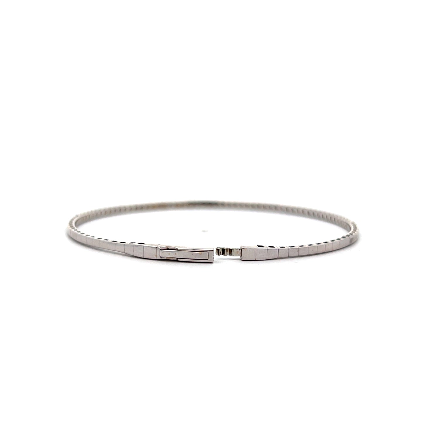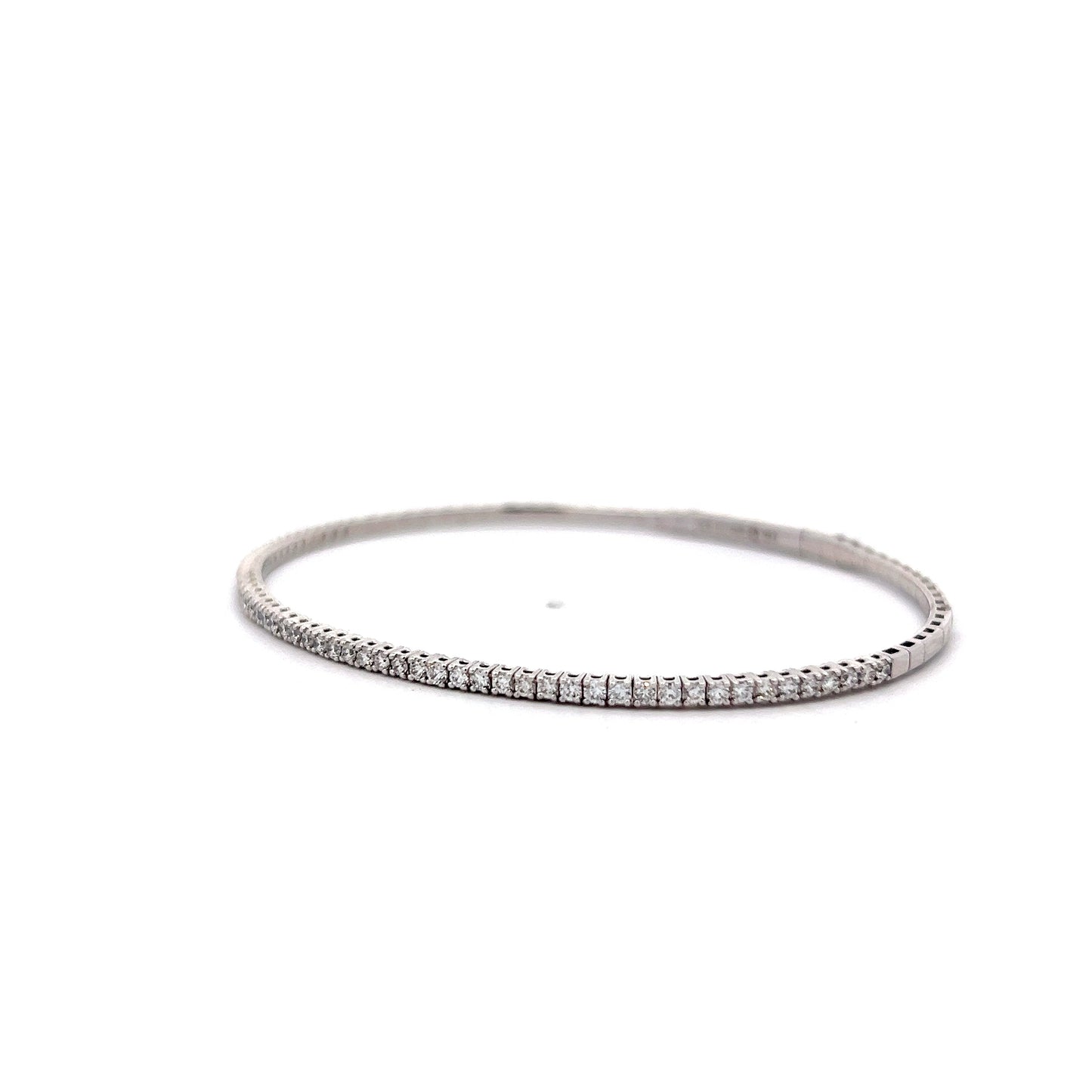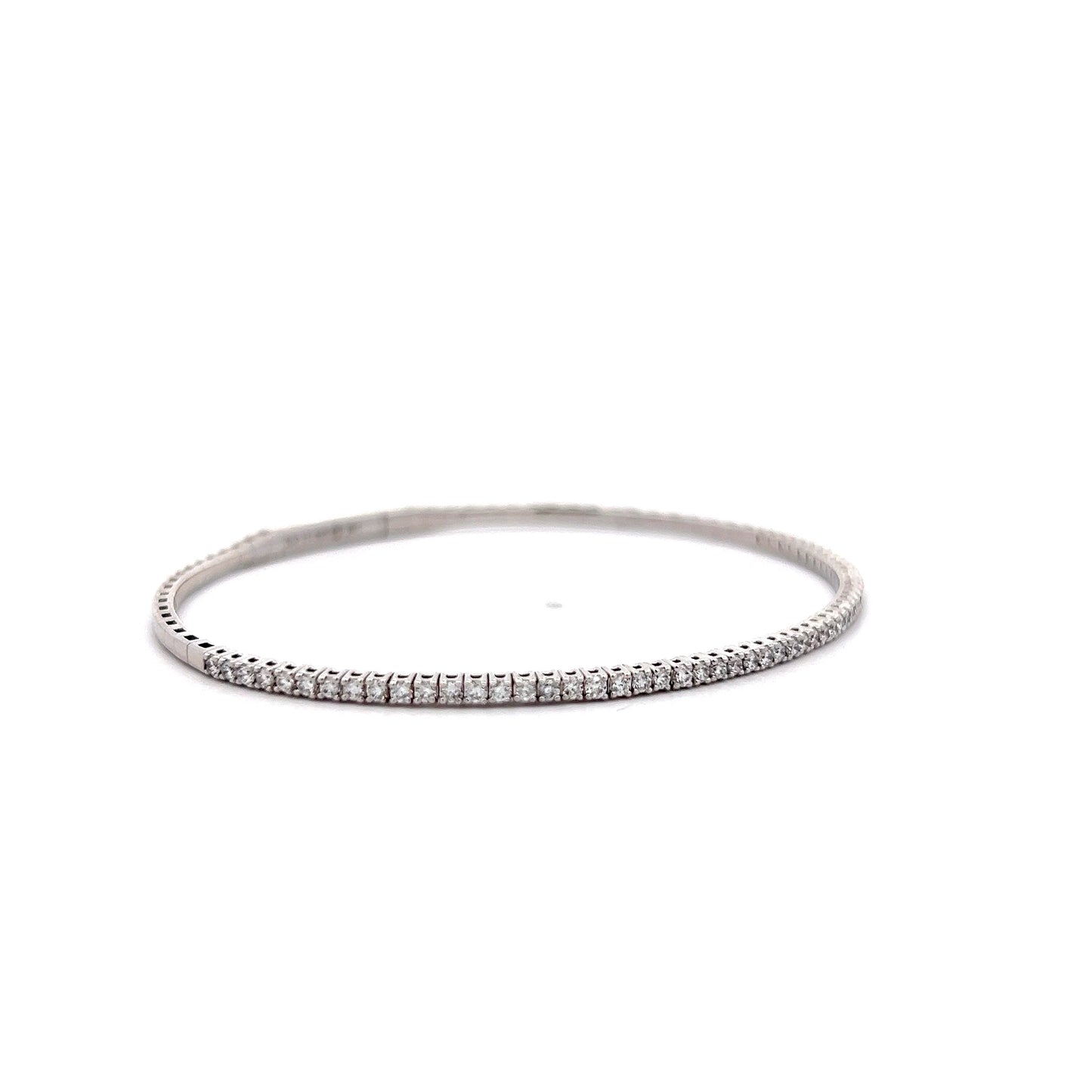 This flexible bangle bracelet is crafted in 14 karat white gold and features round brilliant cut diamonds, prong-set for a continuous sparkle. The diamonds have a total weight of .72 carats and the bracelet’s flexible design allows for a comfortable fit, and the locking clasp secures it in place. Its stackable style makes it versatile for pairing with other pieces or wearing alone.