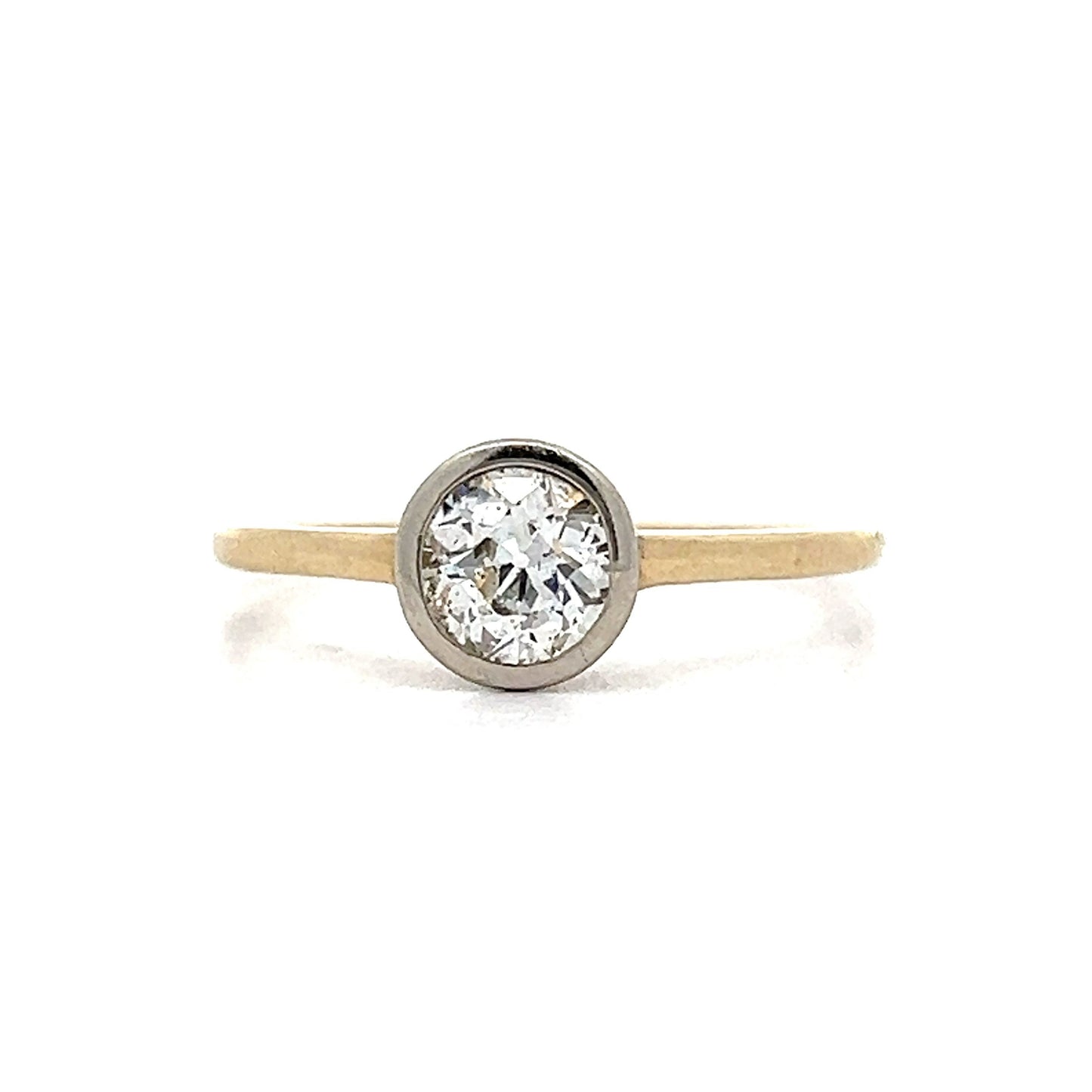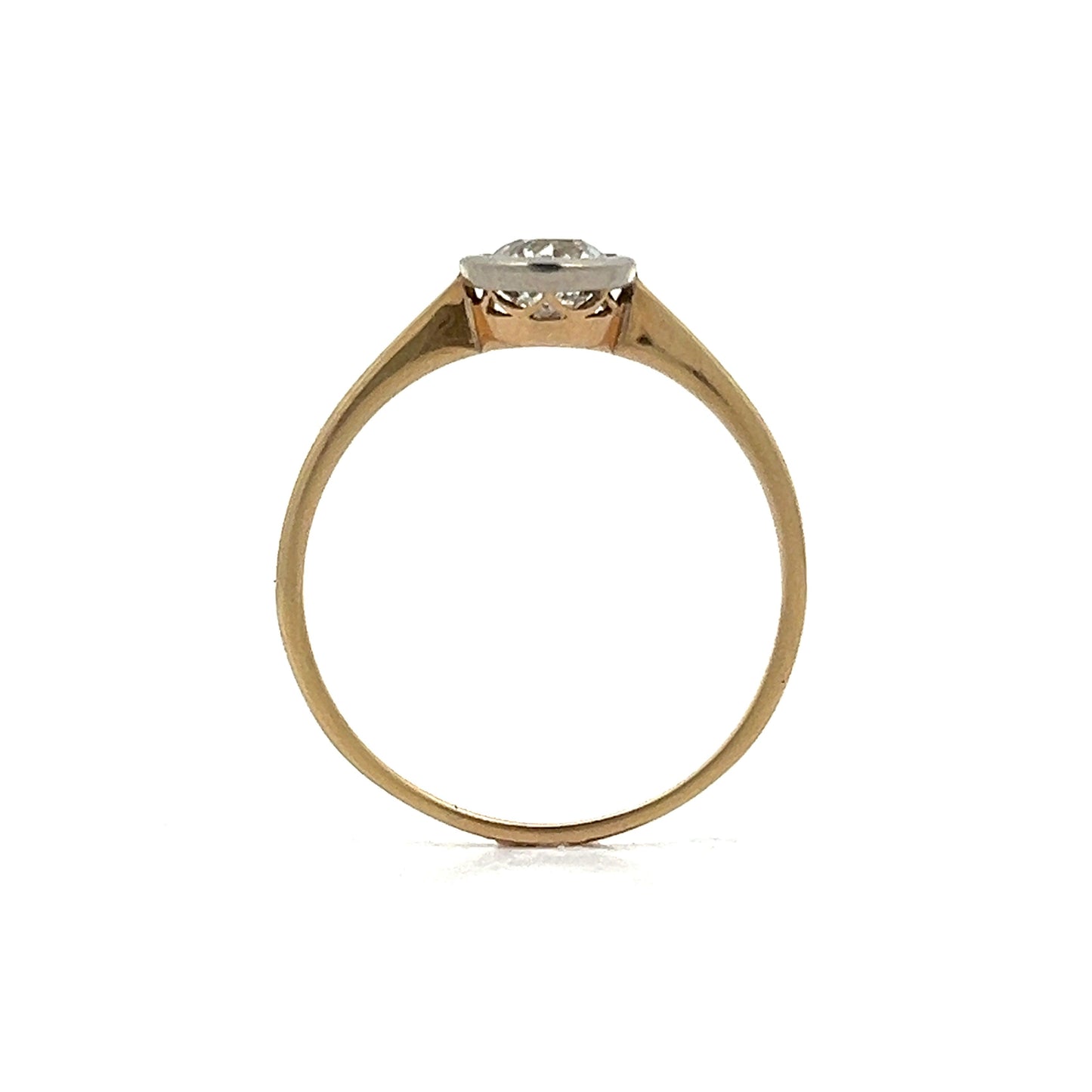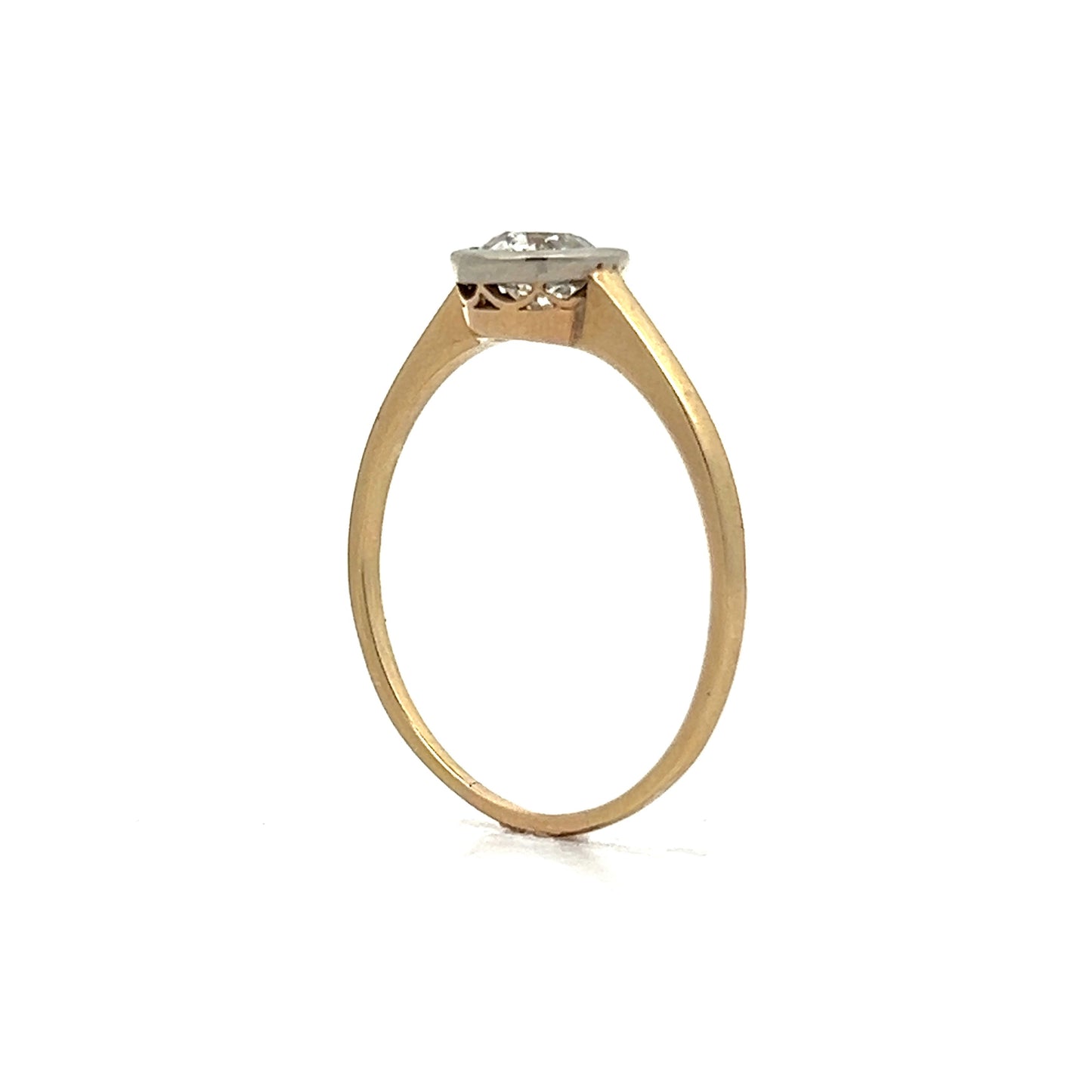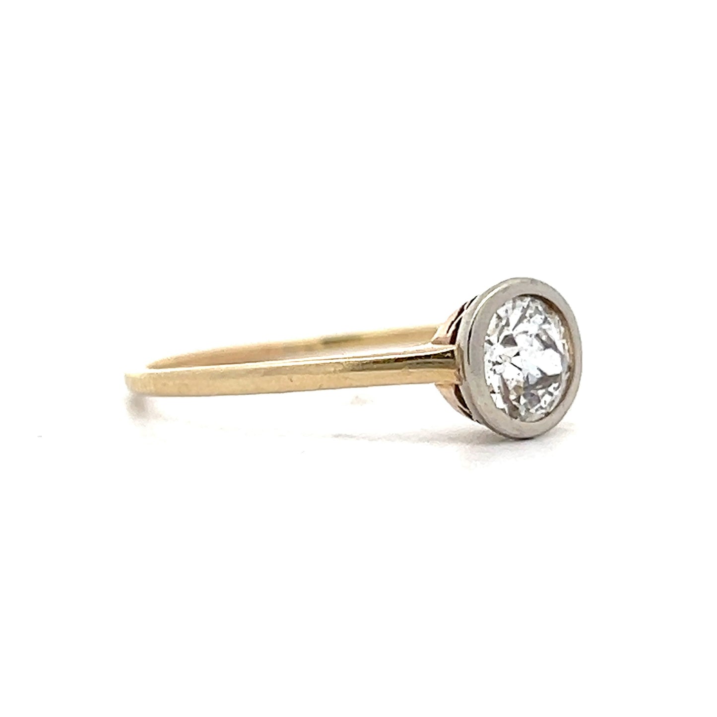 Crafted in 18 karat yellow gold and white gold, this ring is a classic minimalist design that looks right at home in the modern era. The center stone is an old European cut natural diamond that weighs .72 carats. The white gold bezel accents the stone perfectly and complements the yellow gold band, creating a beautiful contrast that showcases the diamond's brilliance. This antique Art Deco ring is a true treasure, perfect for those who appreciate the beauty and craftsmanship of bygone eras.