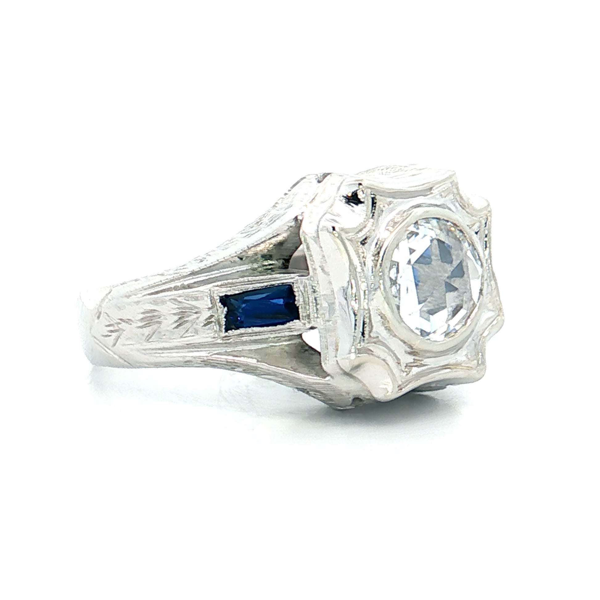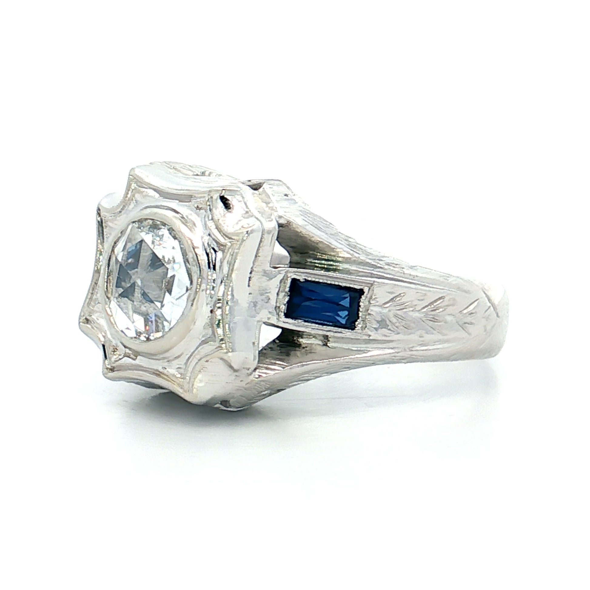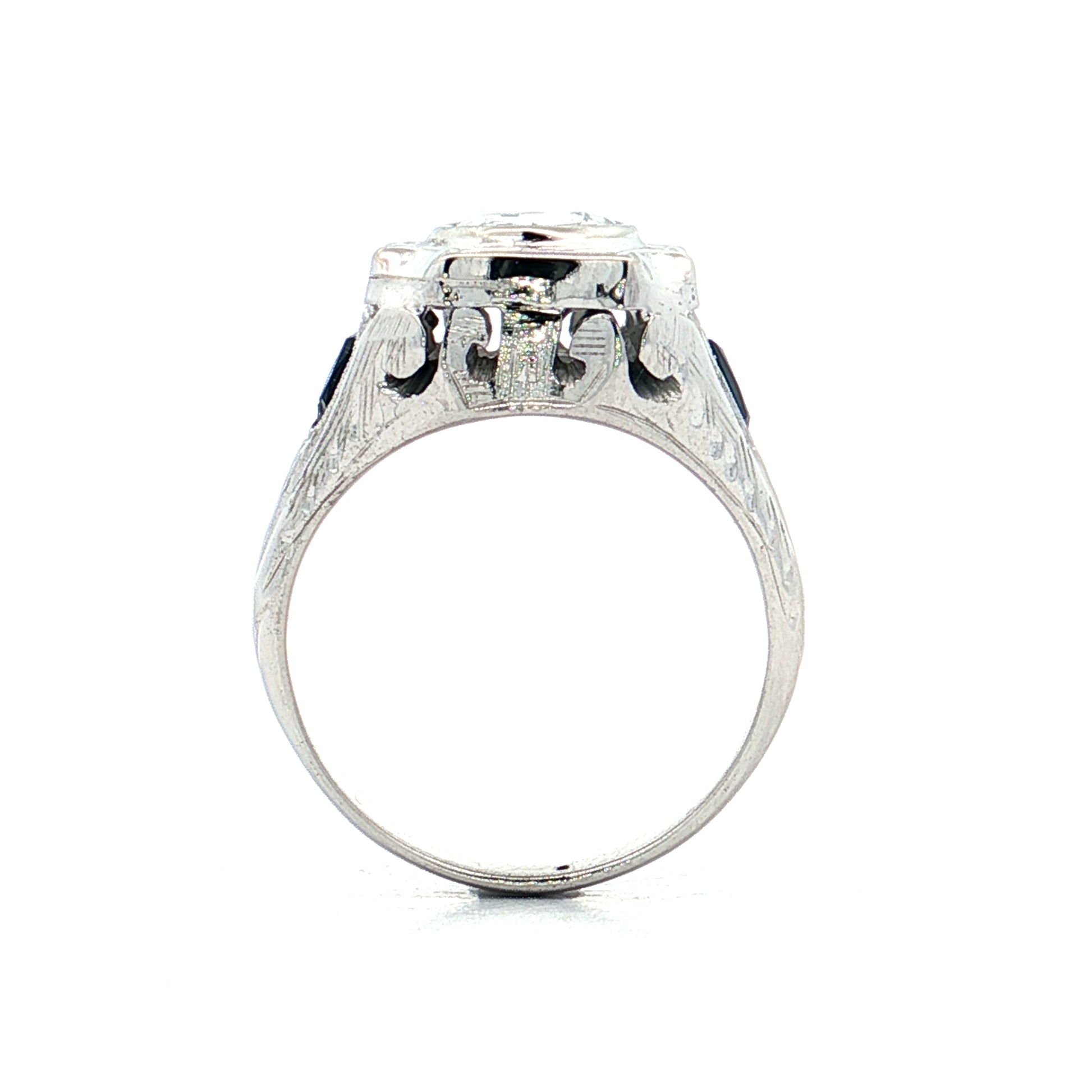 This Art Deco men's ring features a .74-carat rose cut diamond center stone with two .14-carat French cut blue sapphires on either side, all set in 18K white gold. The diamond grades VS2 in clarity, meaning inclusions are minor and difficult to see even under magnification, and I in color, showing slight warmth that's barely visible to the eye.