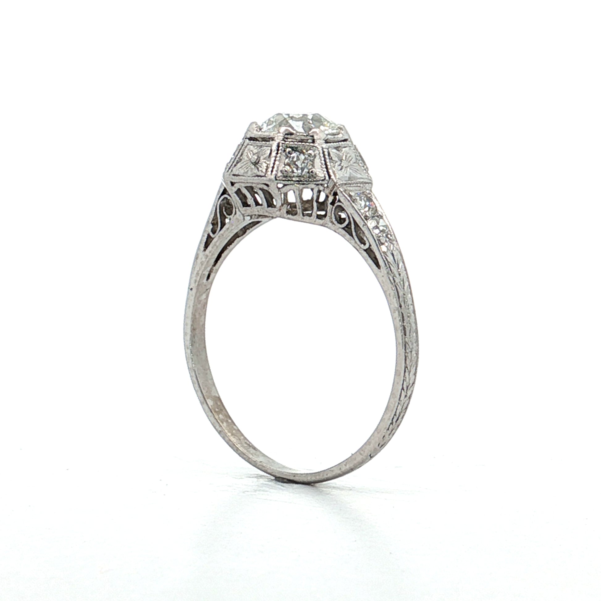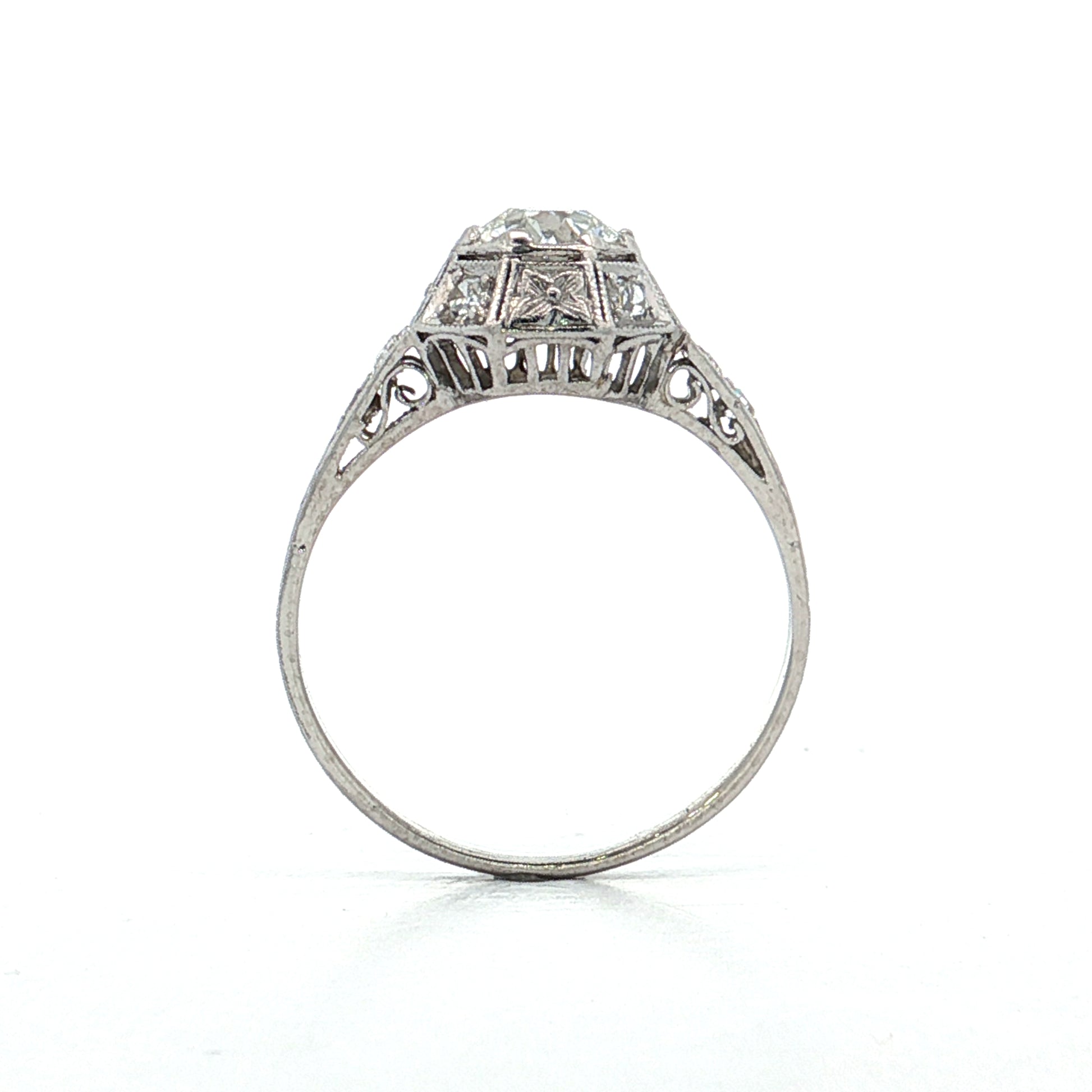 This Art Deco engagement ring features a .75 carat old European cut diamond as the center stone, surrounded by eight single-cut accent diamonds totaling .08 carats for a combined weight of .83 carats. The 18 karat white gold setting displays an Orange Blossom motif with geometric patterns throughout the design. Filigree work lines the band, with engraved shoulders and milgrain beading adding texture and detail typical of 1920s-1930s.