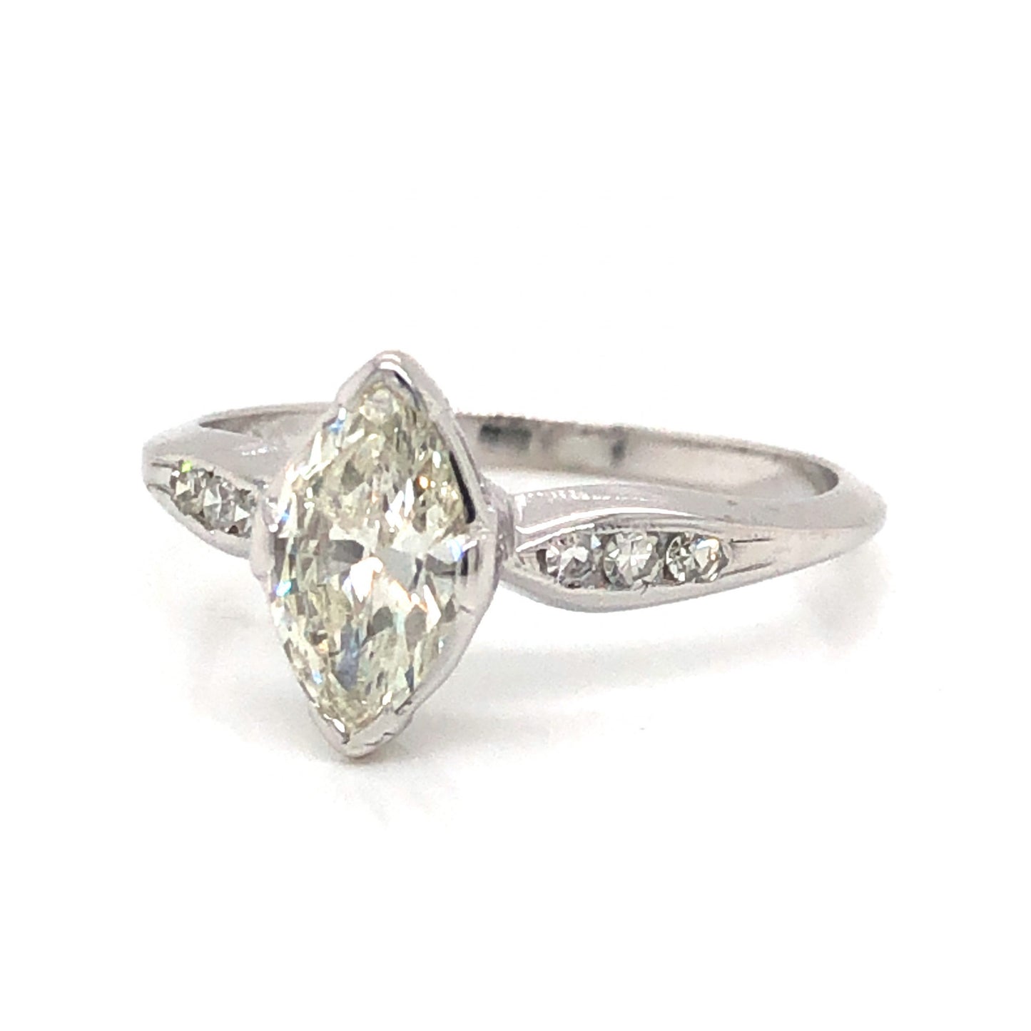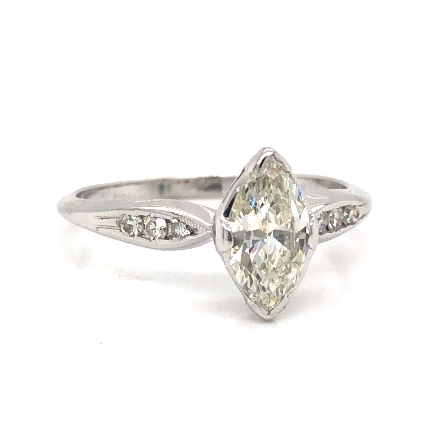 .75 Art Deco Marquise Diamond Engagement Ring in 18k White Gold. This stunning Art Deco engagement ring features a .75 carat marquise cut diamond and diamond accents in 18 karat white gold. The center diamond is near colorless and eye clean, with kite-shaped facets that allow for sparkle from every angle. The primary diamond is set in thick prongs that protect its pointed shape. Six (6) single cut diamond accents are channel set on the shoulders of the ring. From the profile, a sleek basket mounting holds the collection of diamonds on an inverse tapered 18 karat white gold band.
