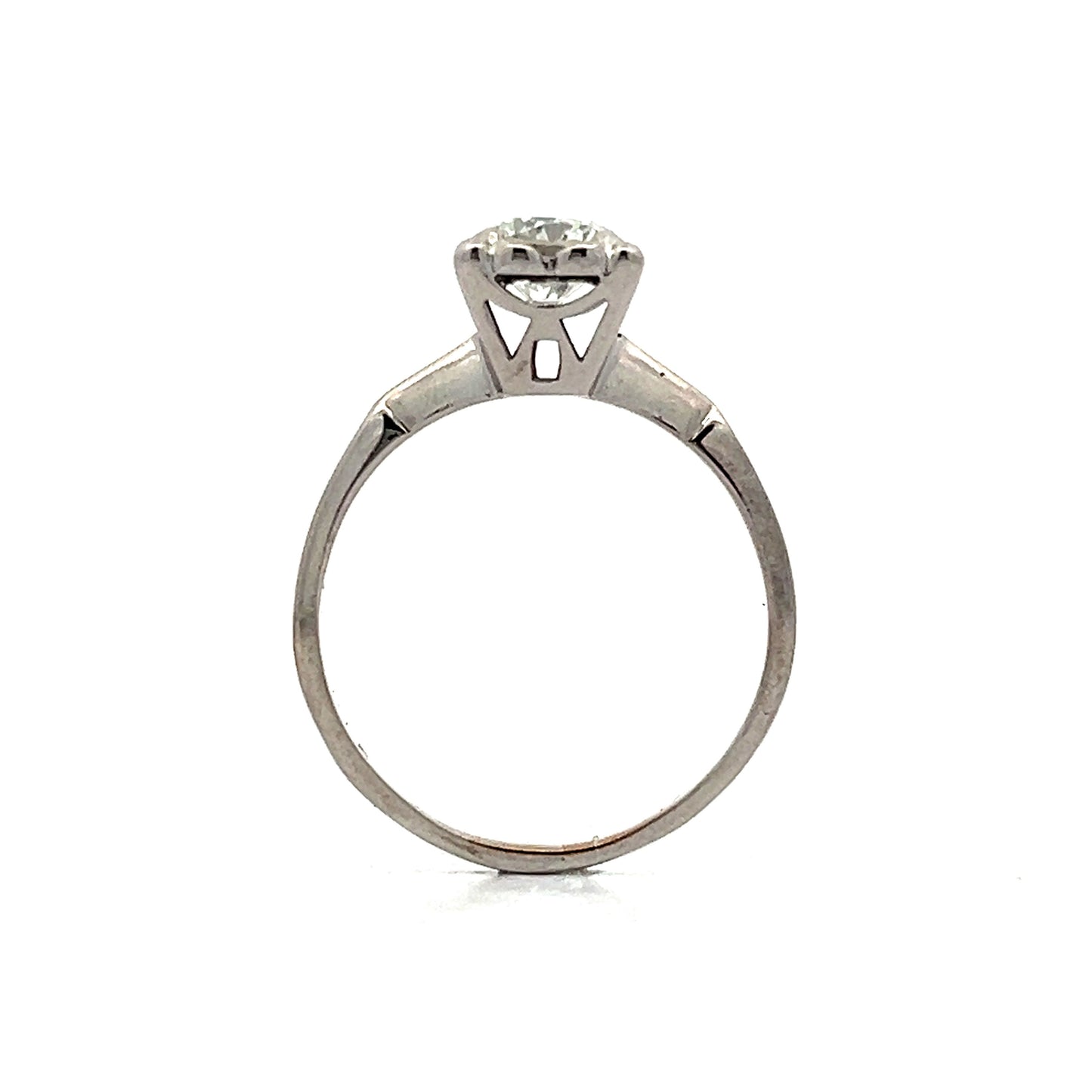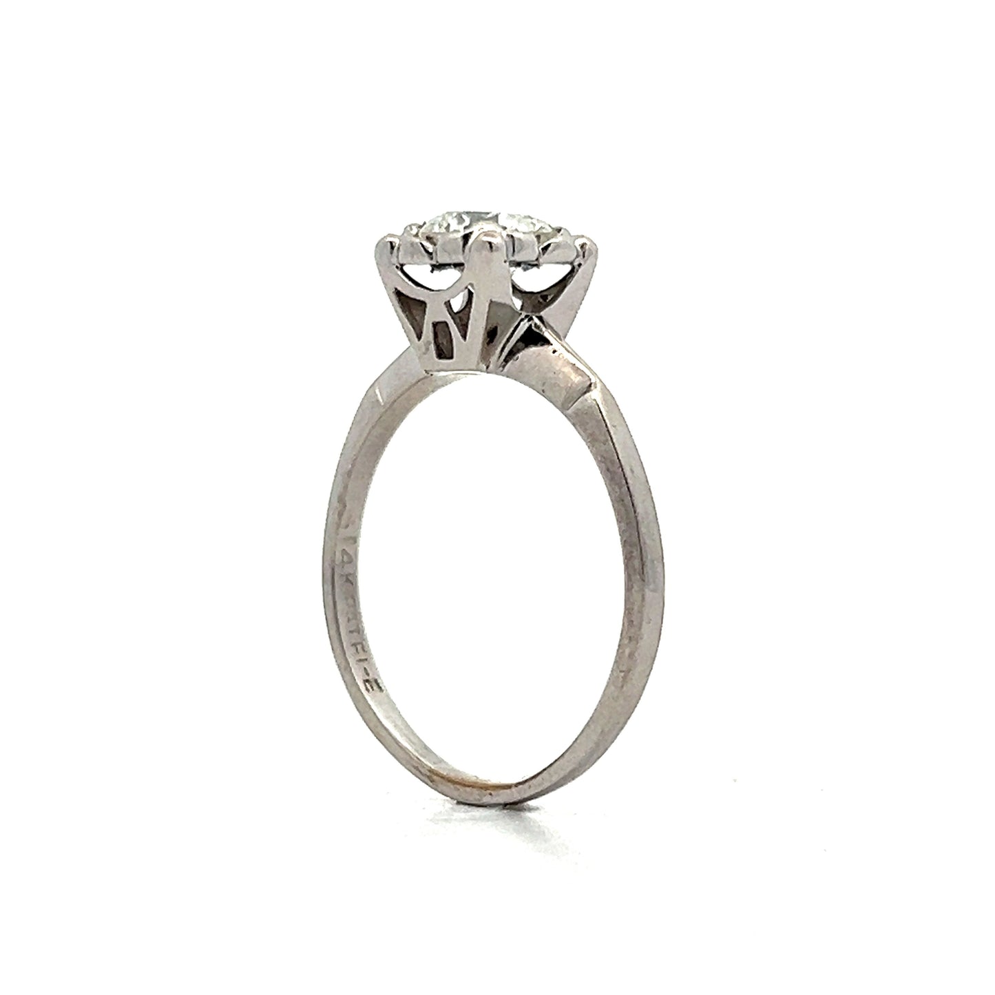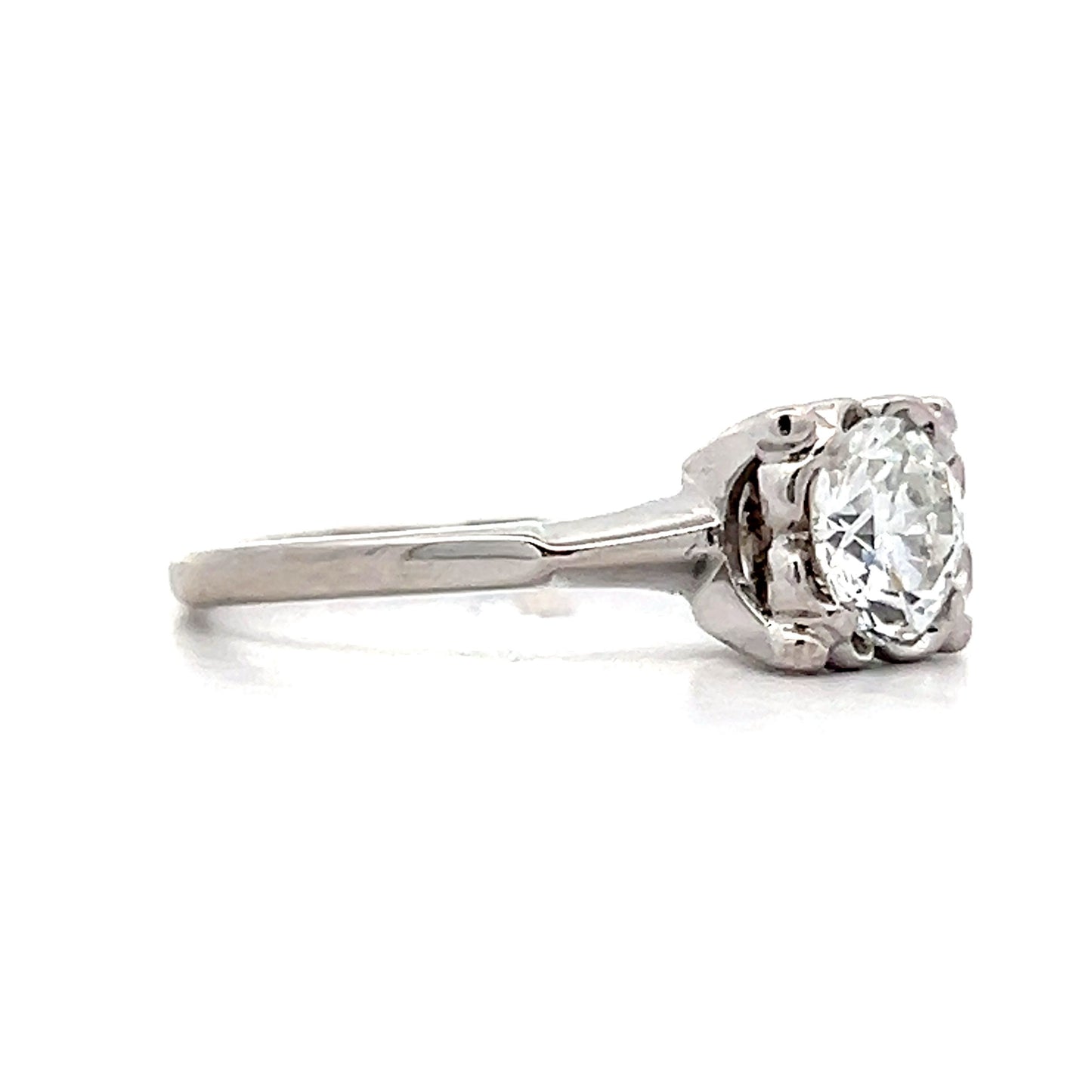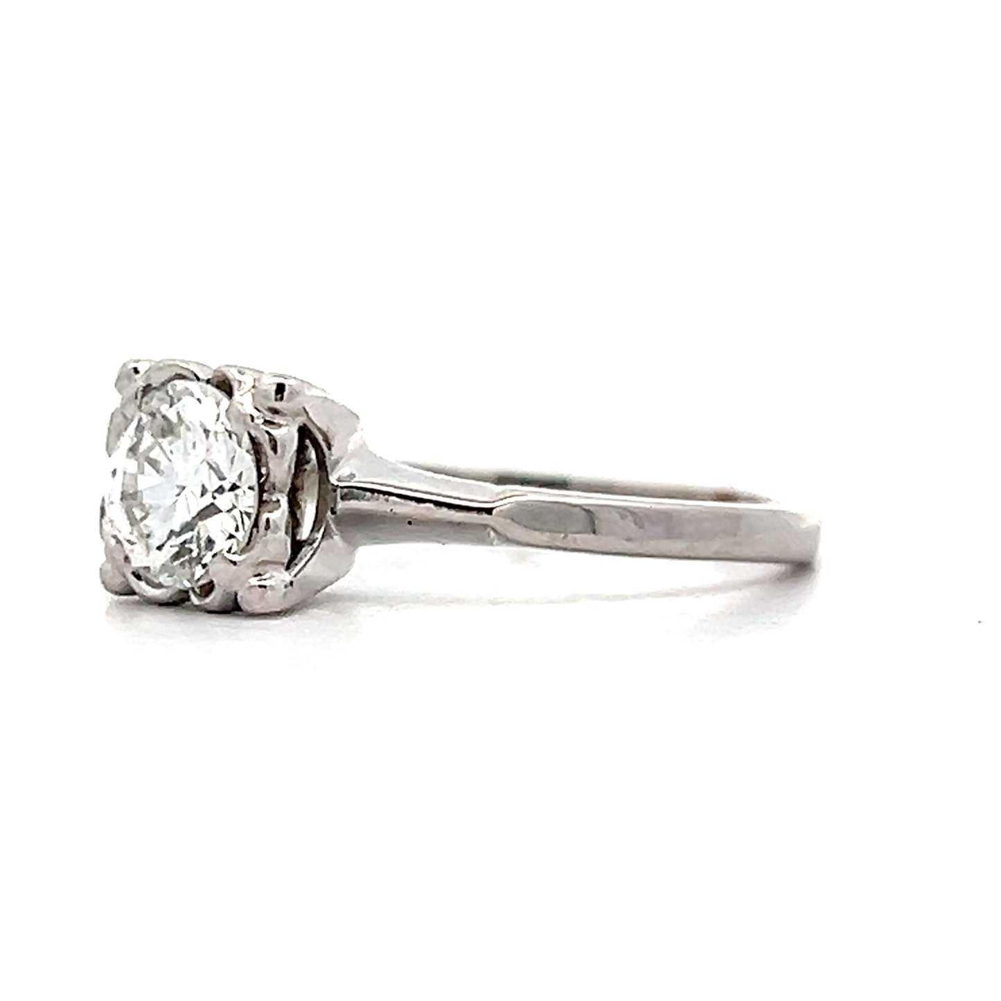 This vintage Retro solitaire engagement ring is set in 14 karat white gold and features a .75 carat round brilliant cut diamond as its centerpiece. The diamond has a clarity grade of VS2 and a color grade of I, offering a remarkable sparkle. It is securely held in a fishtail prong setting that enhances the stone's brilliance while giving the ring a vintage appeal. The band is thin and polished, allowing the diamond to be the focal point. A gorgeous example of classic Retro period style.