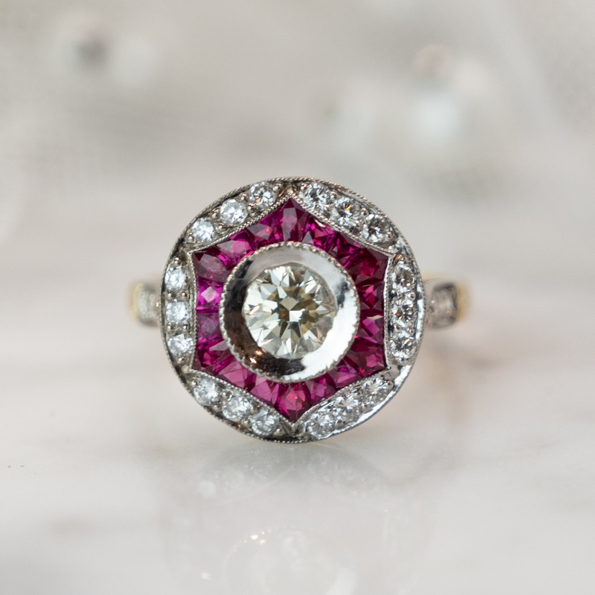 This two-tone cocktail ring features 18-karat white and yellow gold construction with a .76-carat transitional cut diamond center stone (N color, VS2 clarity) in a bezel setting, surrounded by an inner halo of calibre cut rubies and an outer halo of 18 round brilliant cut diamonds totaling 1.09 carats. The transitional cut bridges old European and modern round brilliant cutting styles and two-tone rings like this create dynamic versatility, allowing them to coordinate with both gold and white metals when building layered looks.