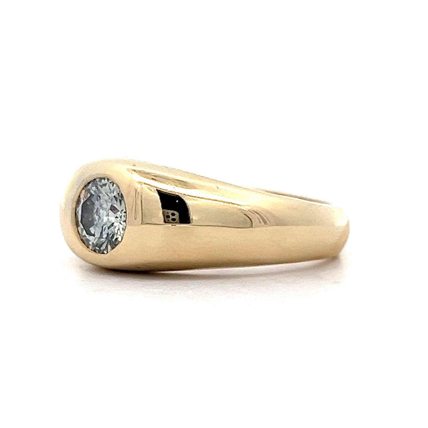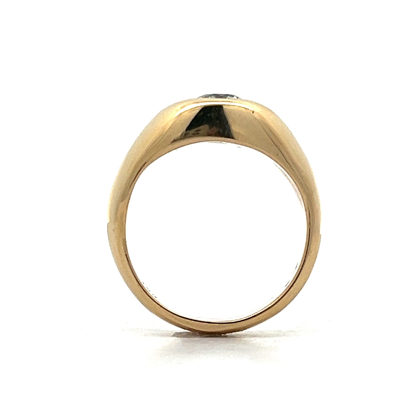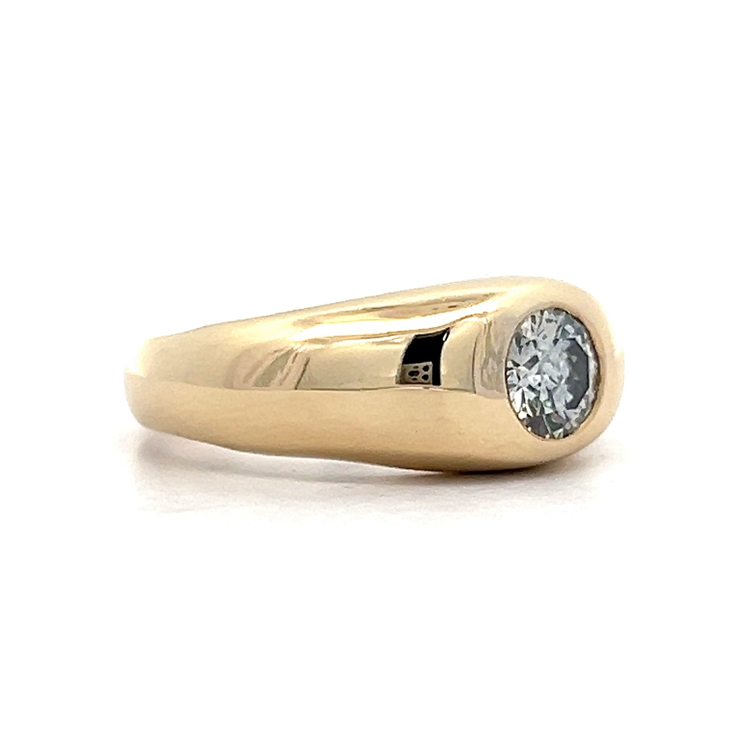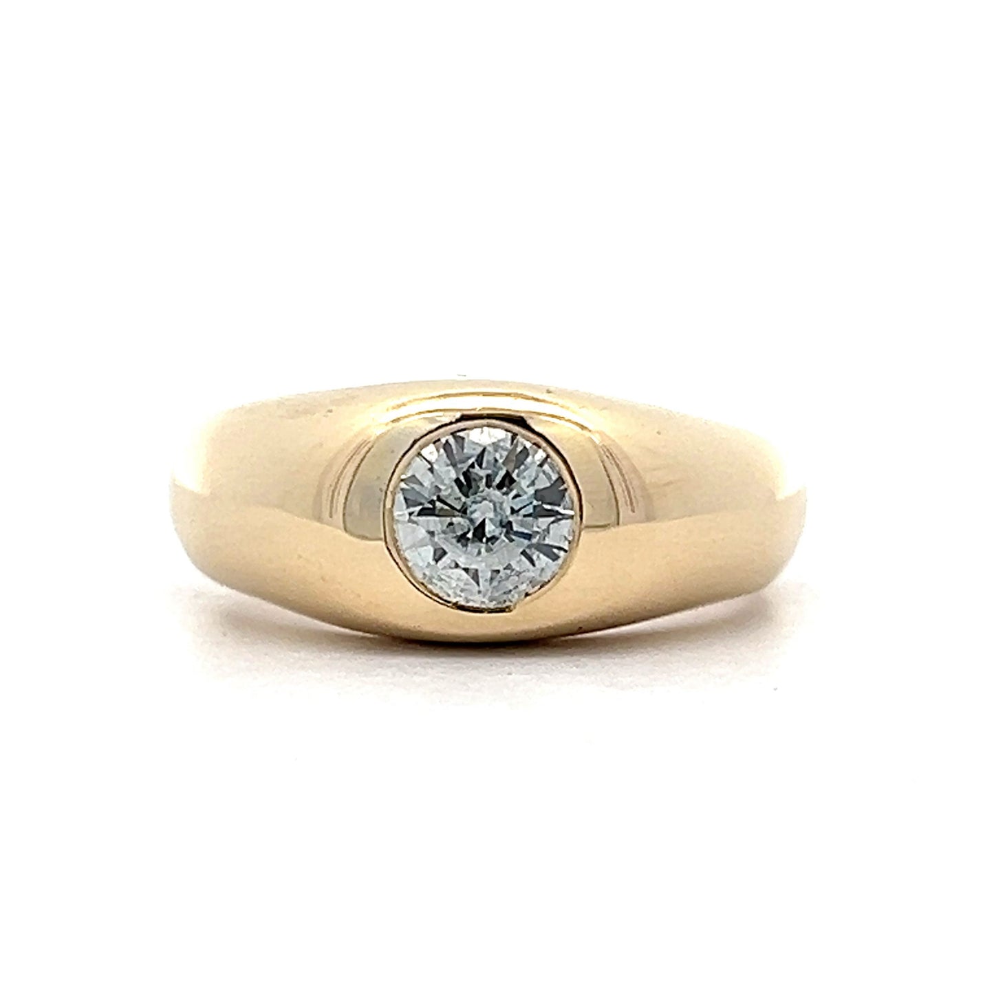 Crafted from 14 karat yellow gold, this ring features a classic dome shape and a round brilliant cut natural diamond weighing .76 carats. The flush setting of the stone makes it very easy to wear as the ring is very low profile. An understated yet distinguished piece, the ring is perfect for everyday wear.