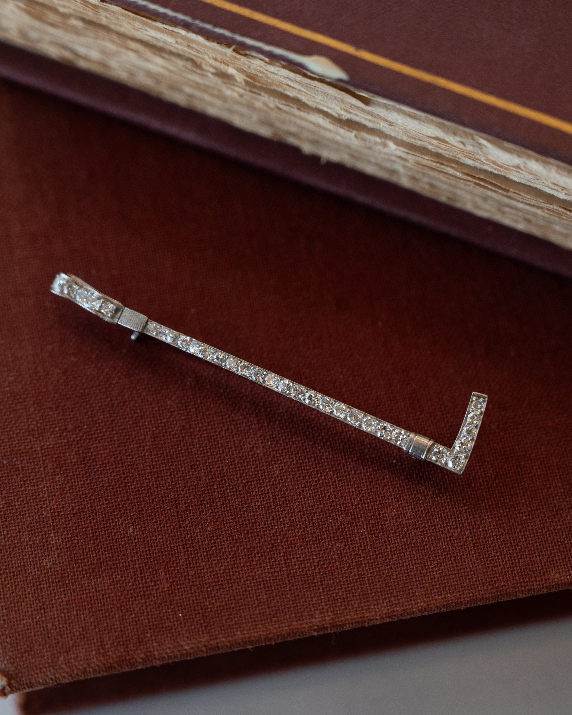 This Art Deco platinum horse crop pin features .78 carats of channel-set old European cut diamonds with VS2-SI1 clarity and G color. The pin measures 2.25 inches in length and takes the form of a riding crop. The diamonds are set in a continuous channel along the crop's length.