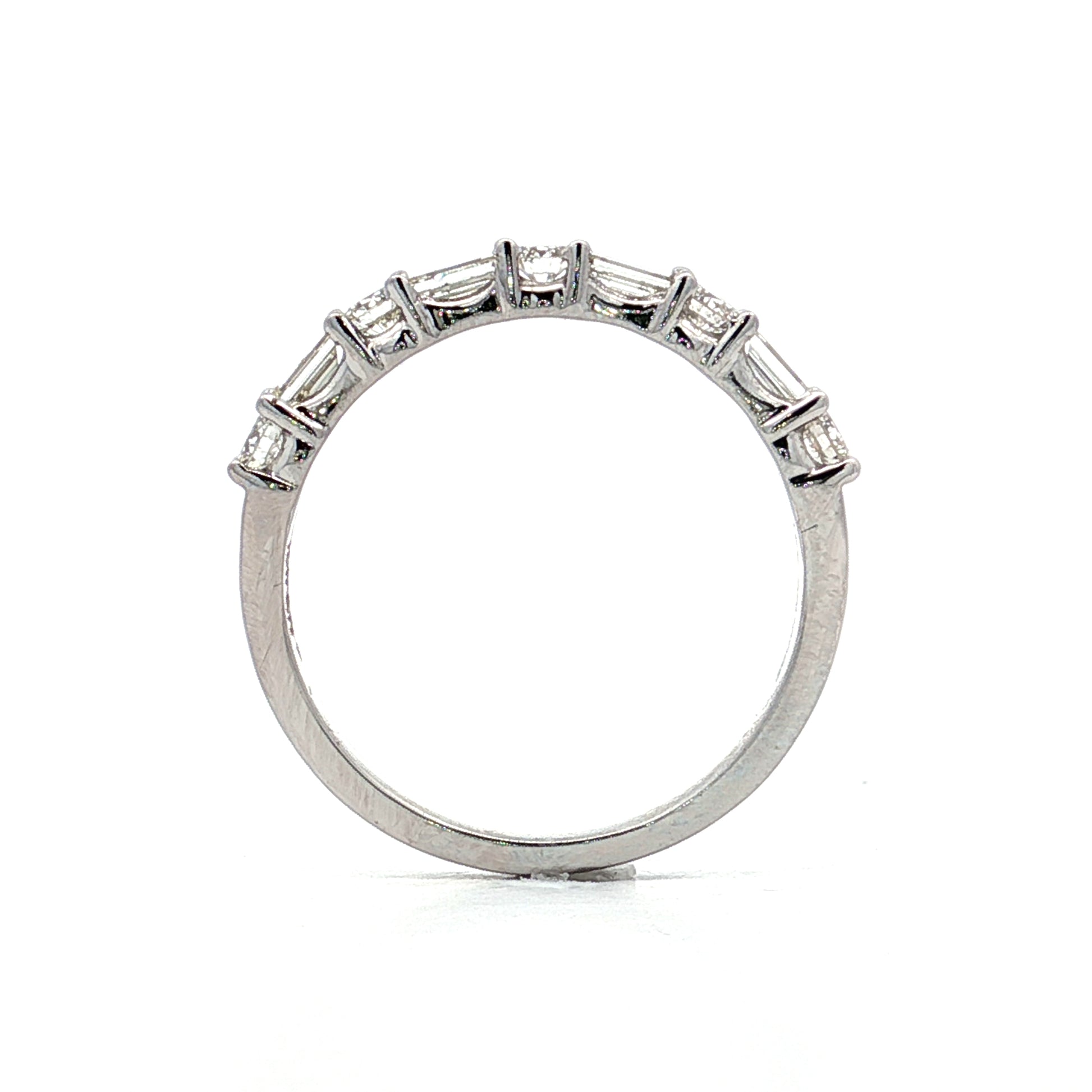 This half-eternity wedding band in 14 karat white gold alternates between five baguette-cut diamonds and round brilliant cut diamonds along the front of the ring. The baguette diamonds total .41 carats while the round diamonds add .37 carats, bringing the total weight to .78 carats. All diamonds are prong-set with VS2 to SI1 clarity and H to I color grades. The contrast between the linear baguette cuts and the round brilliants creates a distinctive pattern that works well as a wedding band or stacking ring.