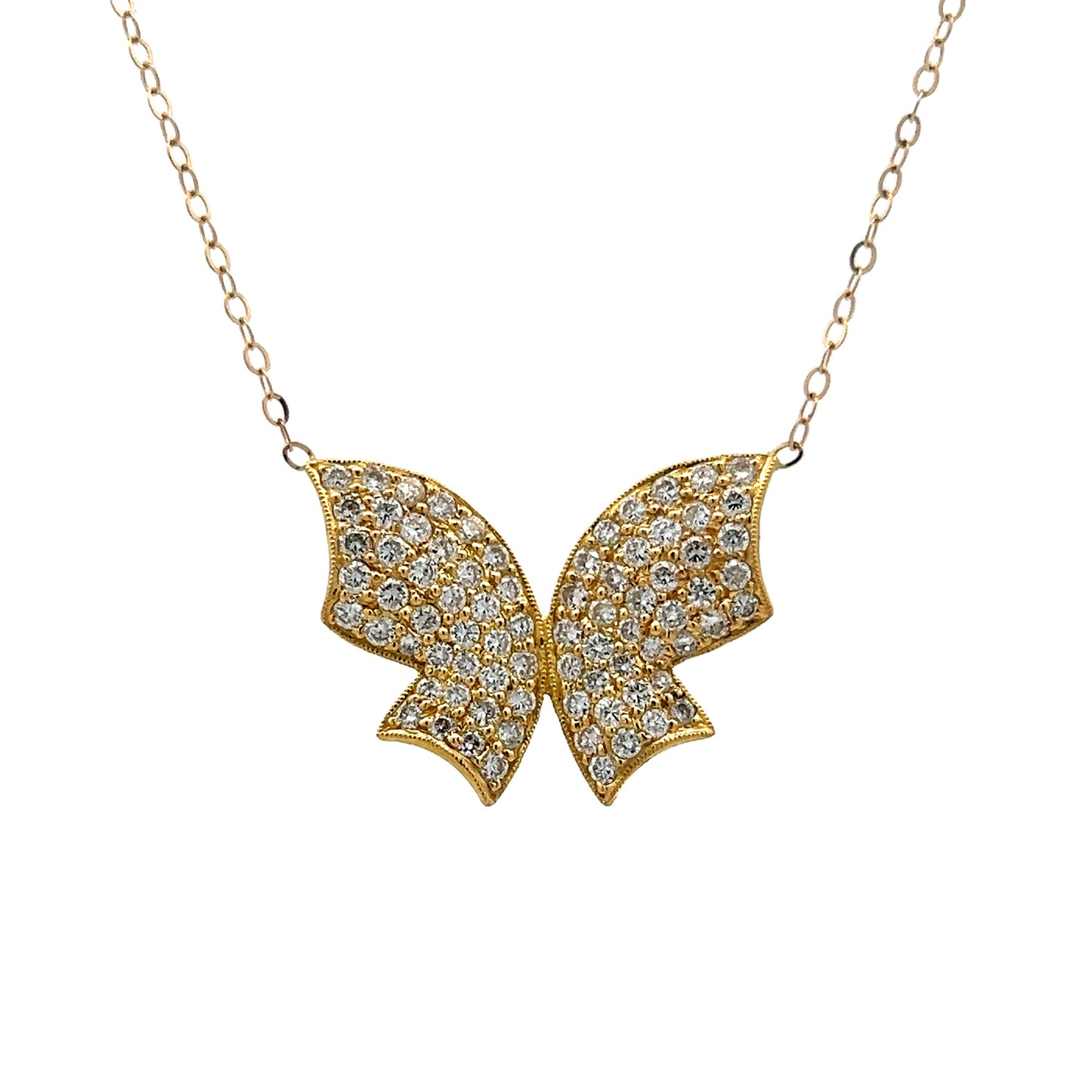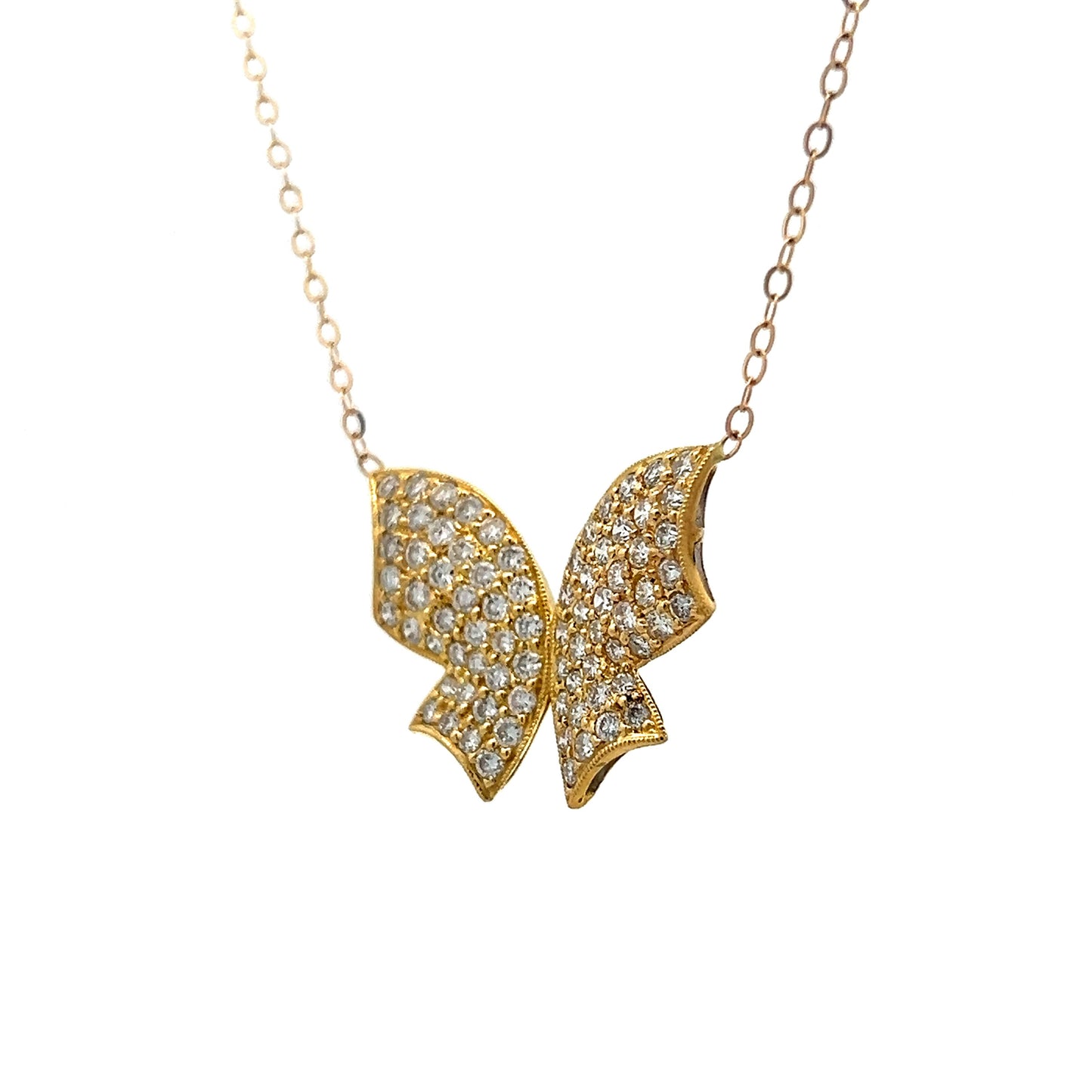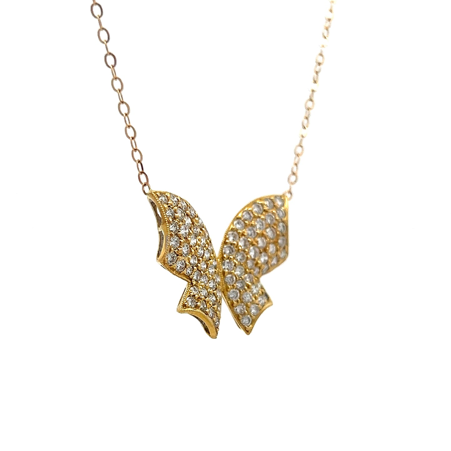 Add a touch of modern elegance to your jewelry collection with this stunning butterfly pendant necklace. Crafted in 18 karat yellow gold, this necklace features a charming butterfly adorned with sparkling pave diamonds. The primary stones are round brilliant cut natural diamonds with a total weight of .78 carats. The diamonds have a clarity of VS2 and a color grade of F, ensuring a beautiful and high-quality piece. The pendant is suspended on a polished yellow gold chain, measuring 16 inches in length. Perfect for any occasion, this modern and chic necklace is a must-have for any jewelry lover.