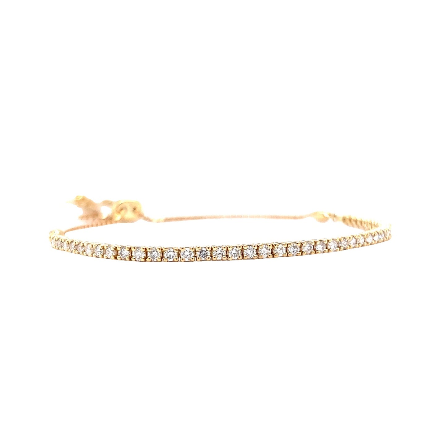 Crafted in 14 karat yellow gold, this modern bracelet is both timeless and elegant. The bracelet features round brilliant cut diamonds with a total weight of .78 carats. The bracelet has an adjustable clasp that allows you to change the size to your exact fit.
