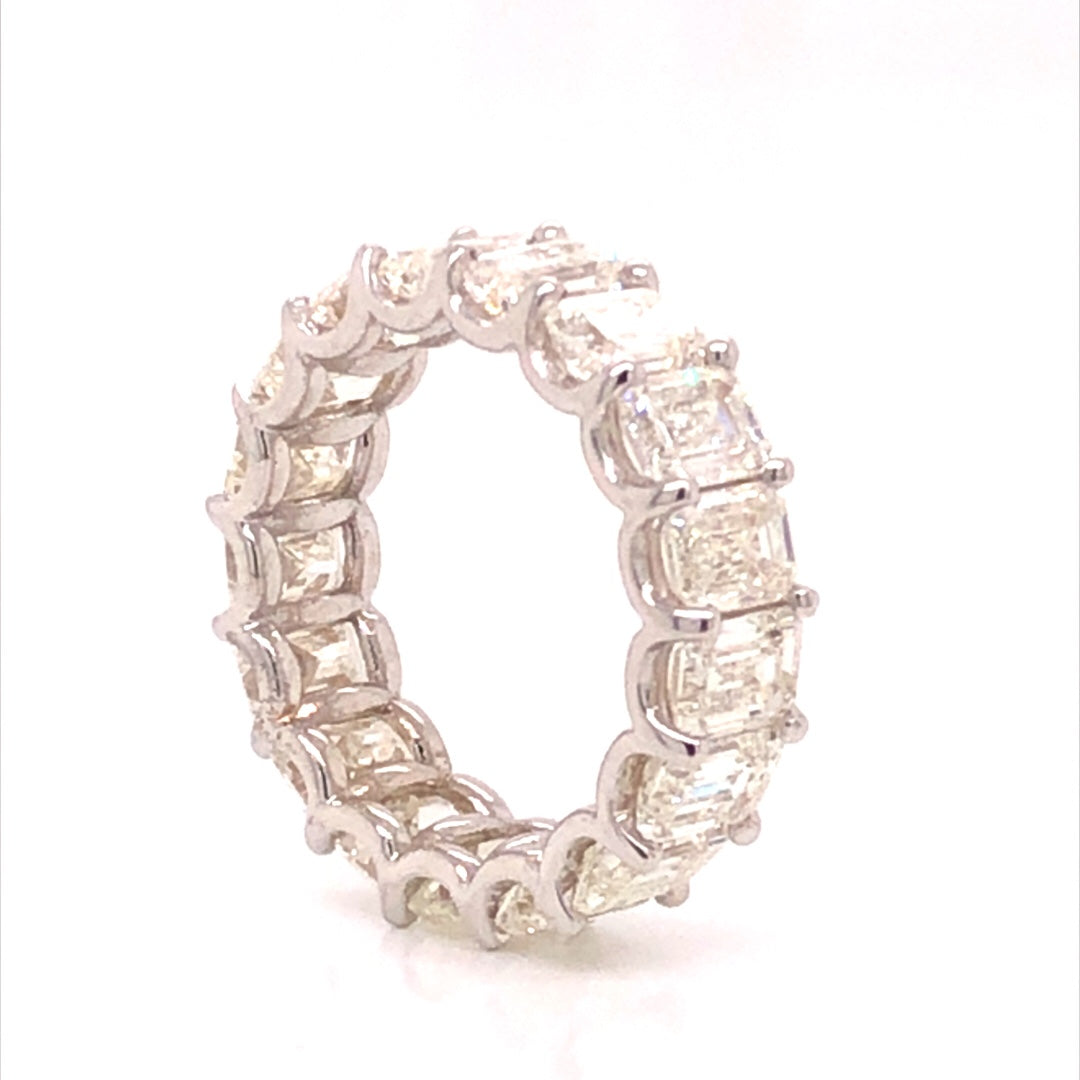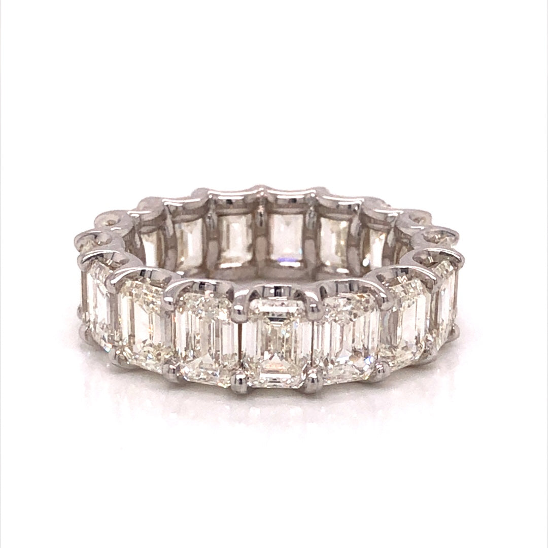 Diamond sparkle from every angle! This dazzling emerald cut diamond eternity band features 8.53 total carats of diamonds in shimmering 18 karat white gold. Eighteen (18) elongated and chic diamonds are set in shared prongs around the entire ring. Stylish elegant. Each white diamond is GIA certified and brings a “hall of mirrors” brilliance, iconic of emerald cut diamonds. Pair this eternity band with a White Gold Engagement Ring or wear as a Stacking Band on the right hand. Simply beautiful.