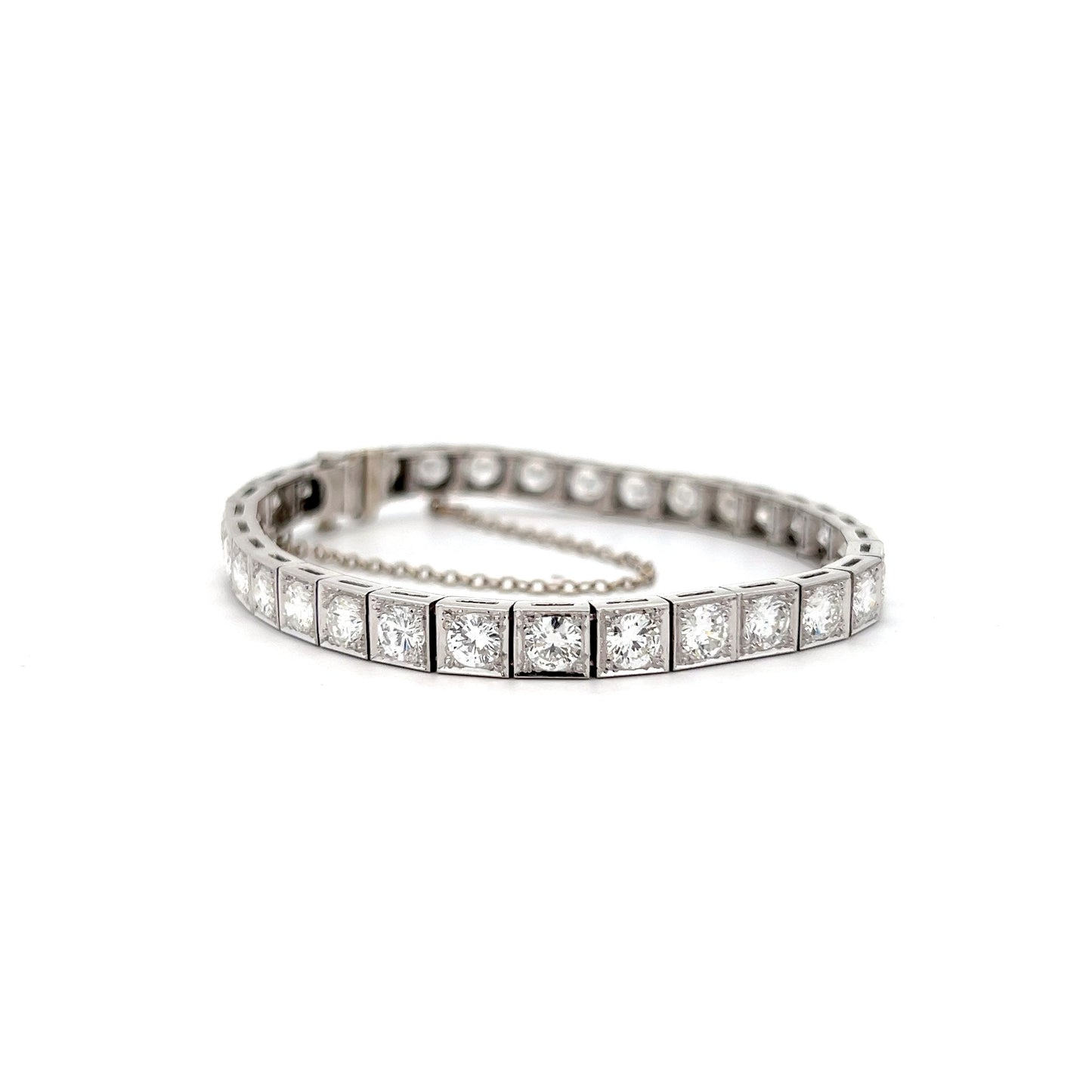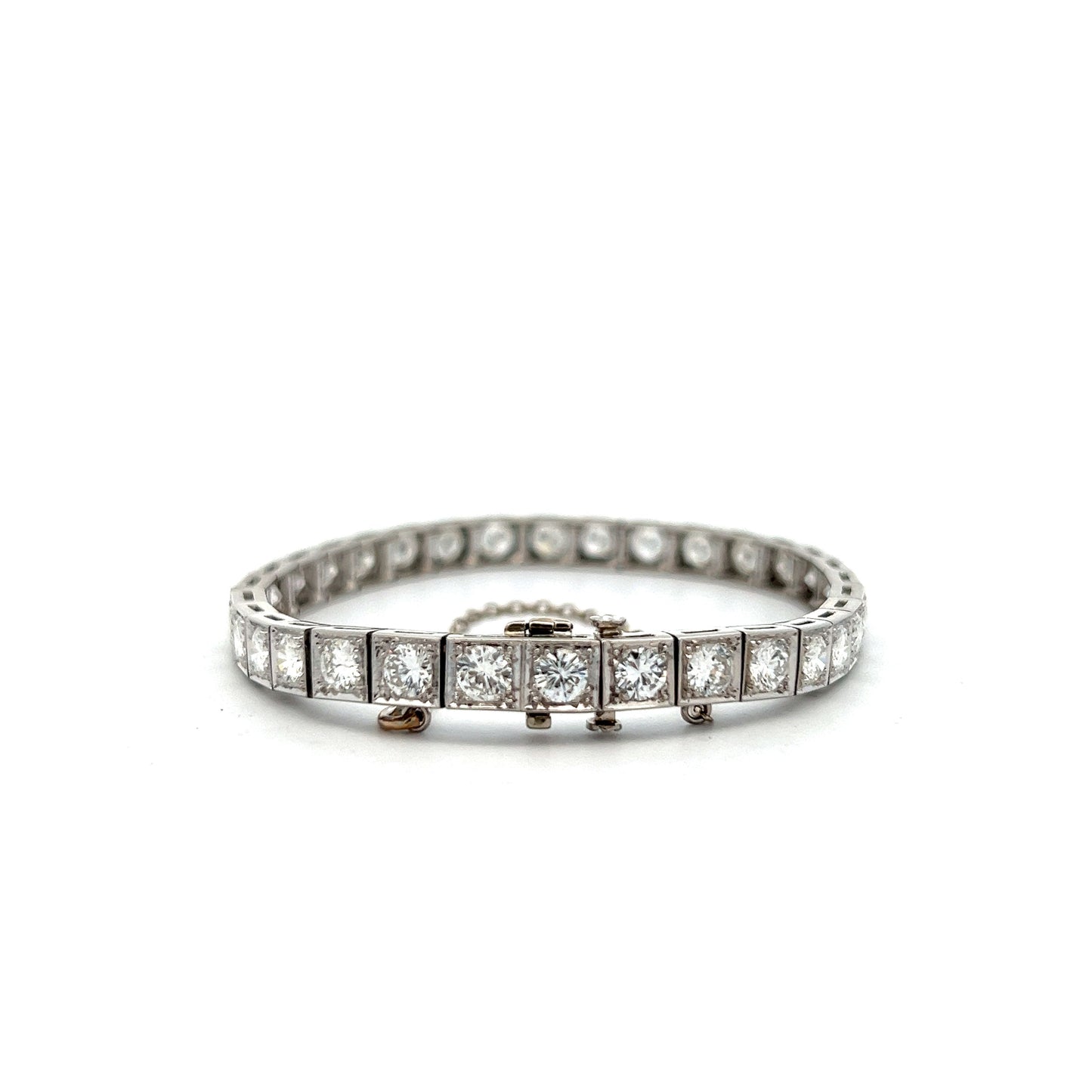 This Mid-Century diamond tennis bracelet, crafted in platinum, is a stunning example of the era's artistry. Featuring 8.00 carats of round brilliant cut diamonds with VS1-VS2 clarity and G-H color, each stone is set in square links that create a striking geometric design. The bracelet's safety chain adds an extra layer of security, making it a versatile piece that can be worn with confidence. With its vintage charm and eye-catching sparkle, this bracelet is a standout addition to any collection, offering a glimpse into a time when jewelry was made to be both beautiful and enduring.