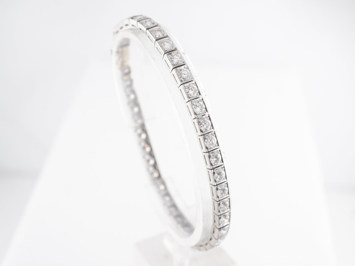 8 Carat Tennis Bracelet w/ Diamonds in Platinum. This modern diamond bracelet contains 8.00 carats of round brilliant cut diamonds set in platinum. The diamonds are each prong set in square sections, giving a rather geometric style to this bracelet. Simple and elegant, this staple of jewelry design will have a home in any collection.