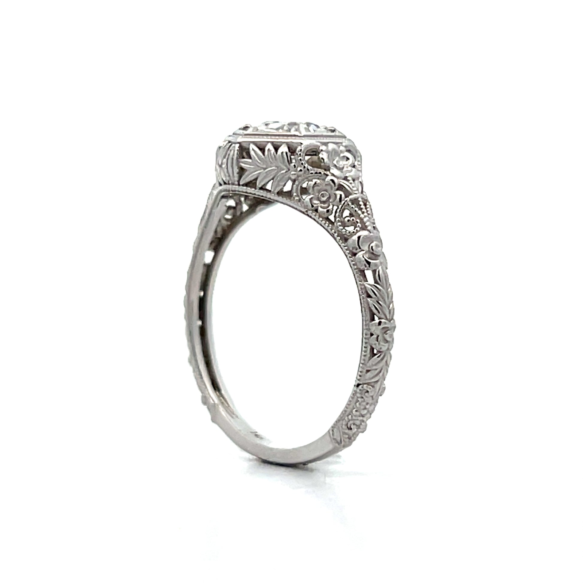 This Art Deco-inspired engagement ring features an .80 carat old European cut diamond with VS2 clarity and I color grade set in a hexagon-shaped bezel of 14 karat white gold. The mounting displays intricate filigree work characteristic of the Art Deco period, while milgrain accents add texture along the band. The solitaire design places focus entirely on the center diamond's distinctive faceting pattern.