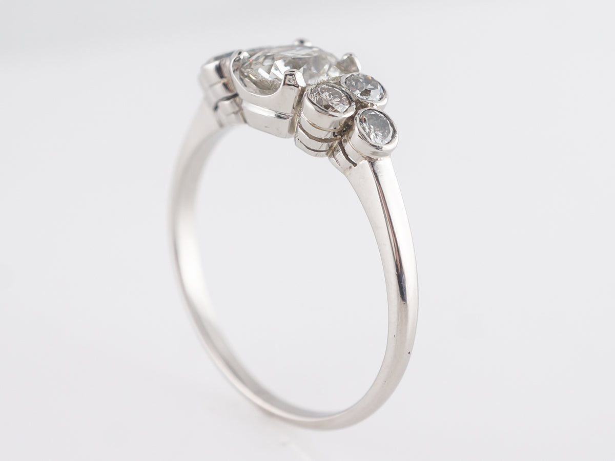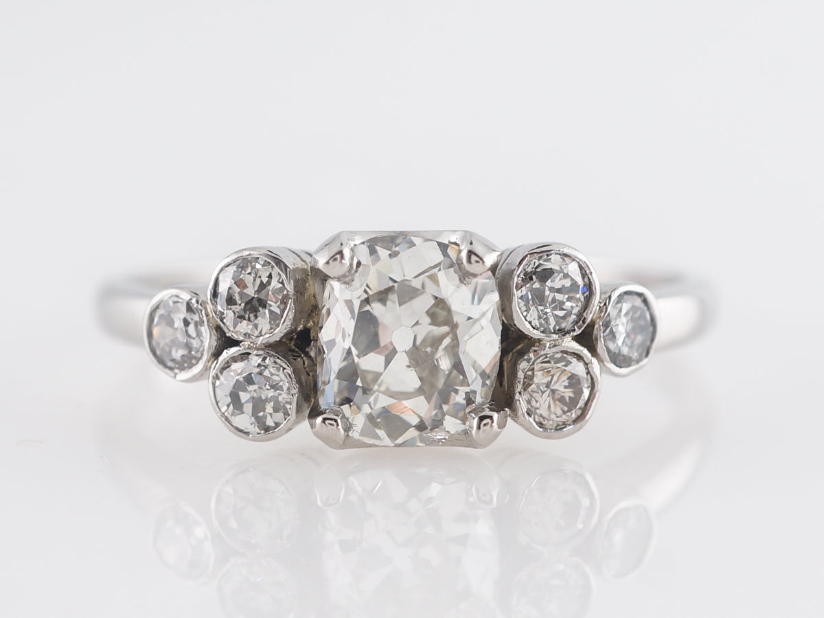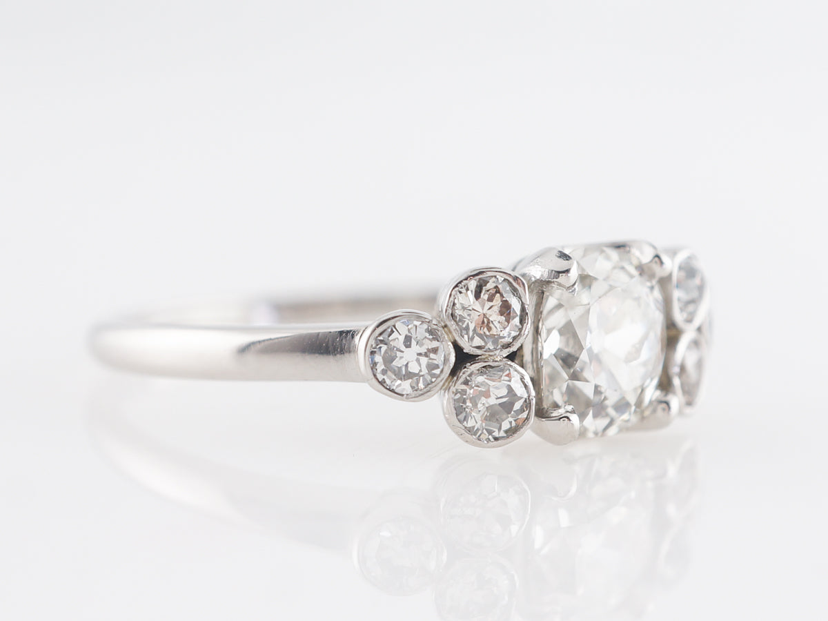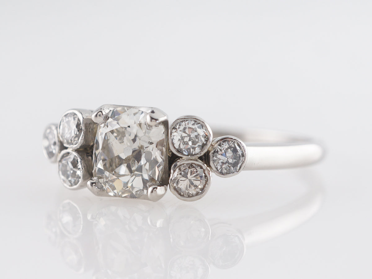 .80 Art Deco Cushion Cut Diamond Engagement Ring in Platinum. This antique Art Deco Engagement ring has a .80 carat cushion cut diamond as the primary stone. It is set with four prongs and flanked with a cluster composed of three, round bezel set diamonds. A total of 1.16 carats of diamonds and finished in platinum.
