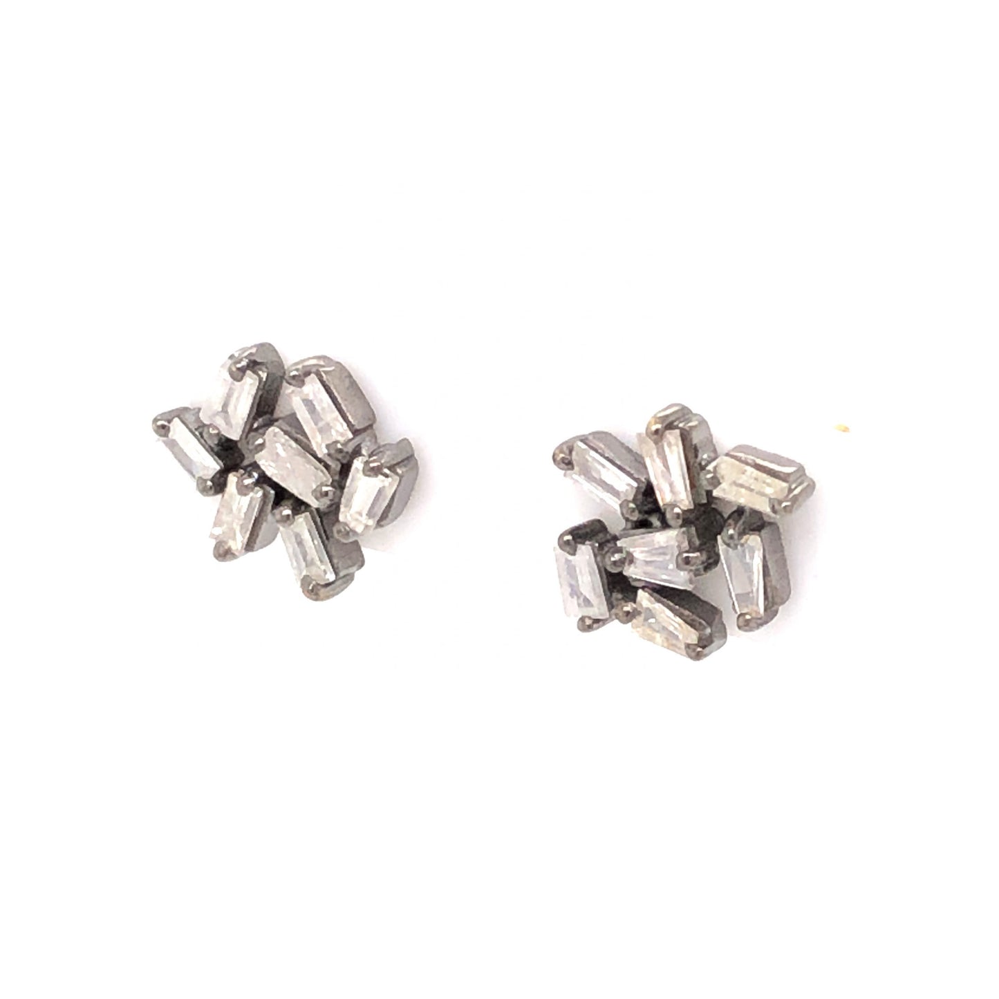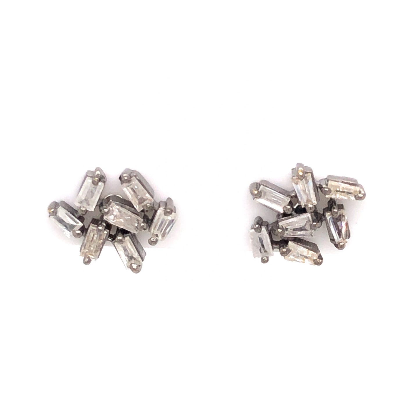 .81 Baguette Diamond Earrings in Sterling Silver. These modern stud earrings feature .81 carats of baguette tapered baguette cut diamonds finished in sterling silver. Fourteen (14) .058 carat diamonds are prong set and clustered together on the studs creating a unique, dancing composition. Artistic and stylish, these brilliant diamond studs will add some groovy personality to your jewelry collection!