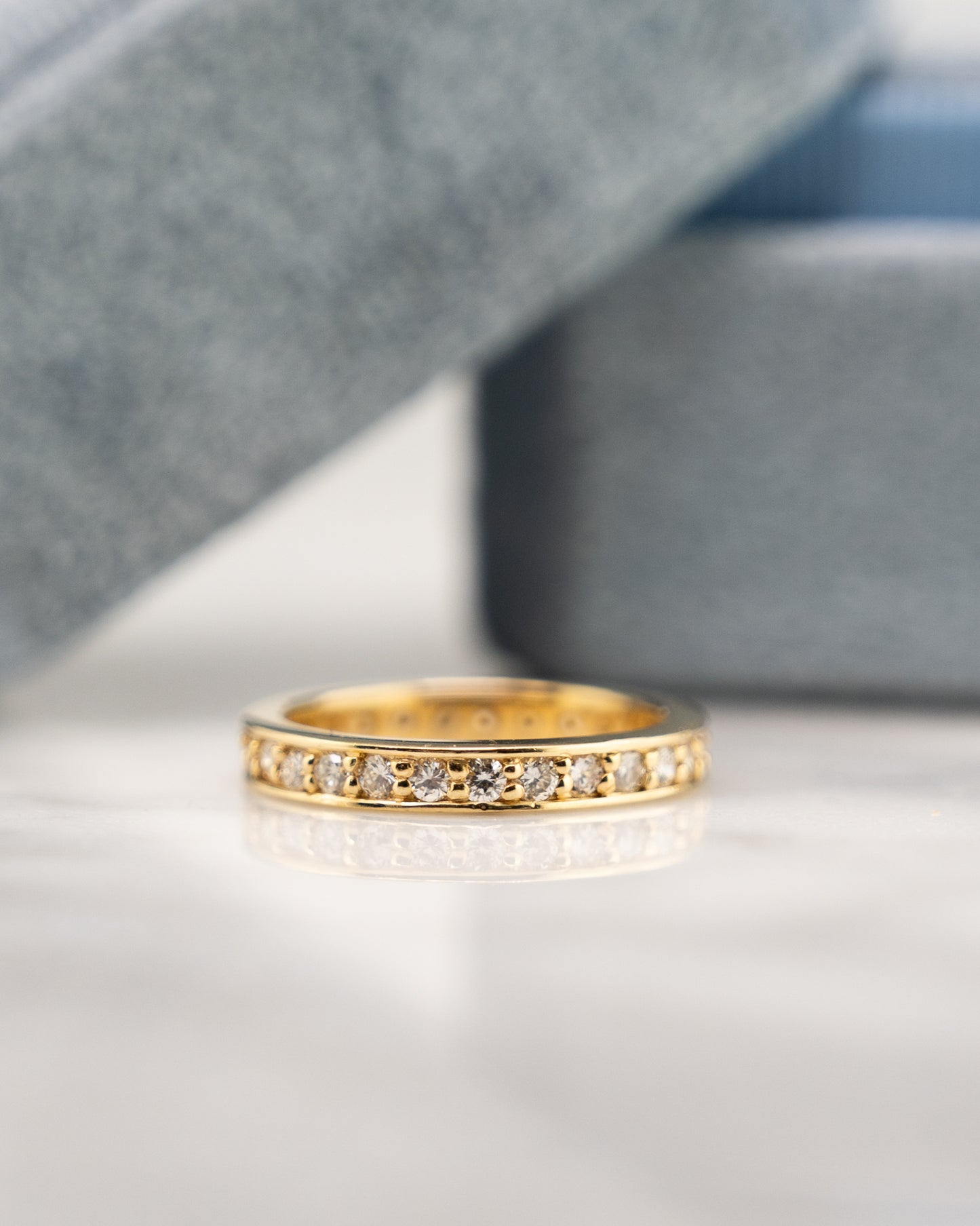 This diamond eternity band features round brilliant cut diamonds that circle the entire ring in a 14 karat yellow gold setting. The diamonds have a total weight of .81 carats with VS2 clarity and I color grade, making them appear clear to the naked eye with a slight tint. The stones are secured using both channel and prong settings, which creates different levels and textures in the ring's design.
